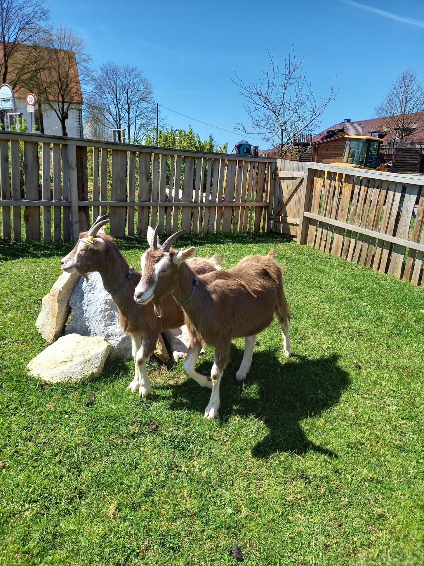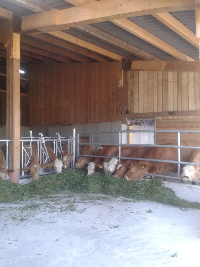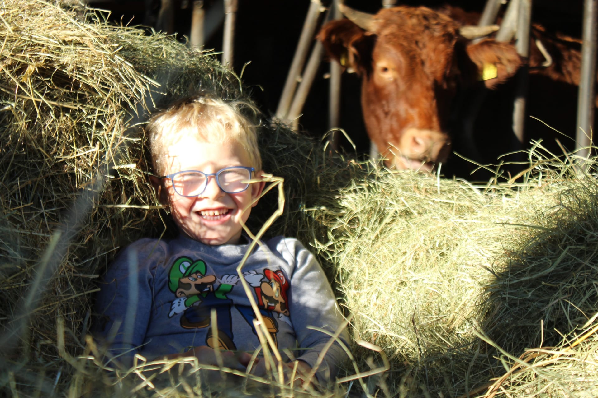 Auf unserem Hof gibt es viele Tiere: Kühe, Kälber, Hühner, Ziegen und Hasen zum Füttern und zum Streicheln.