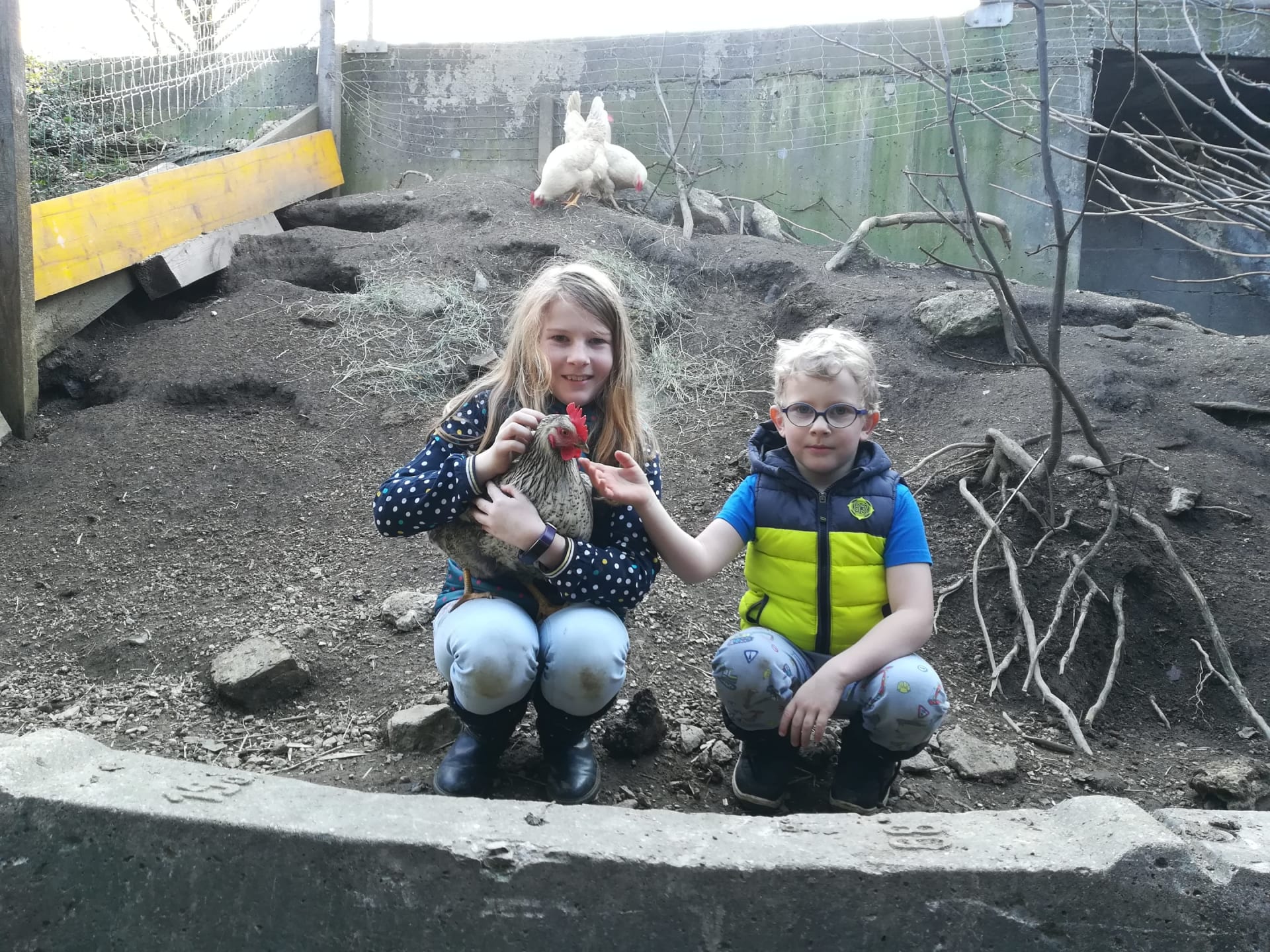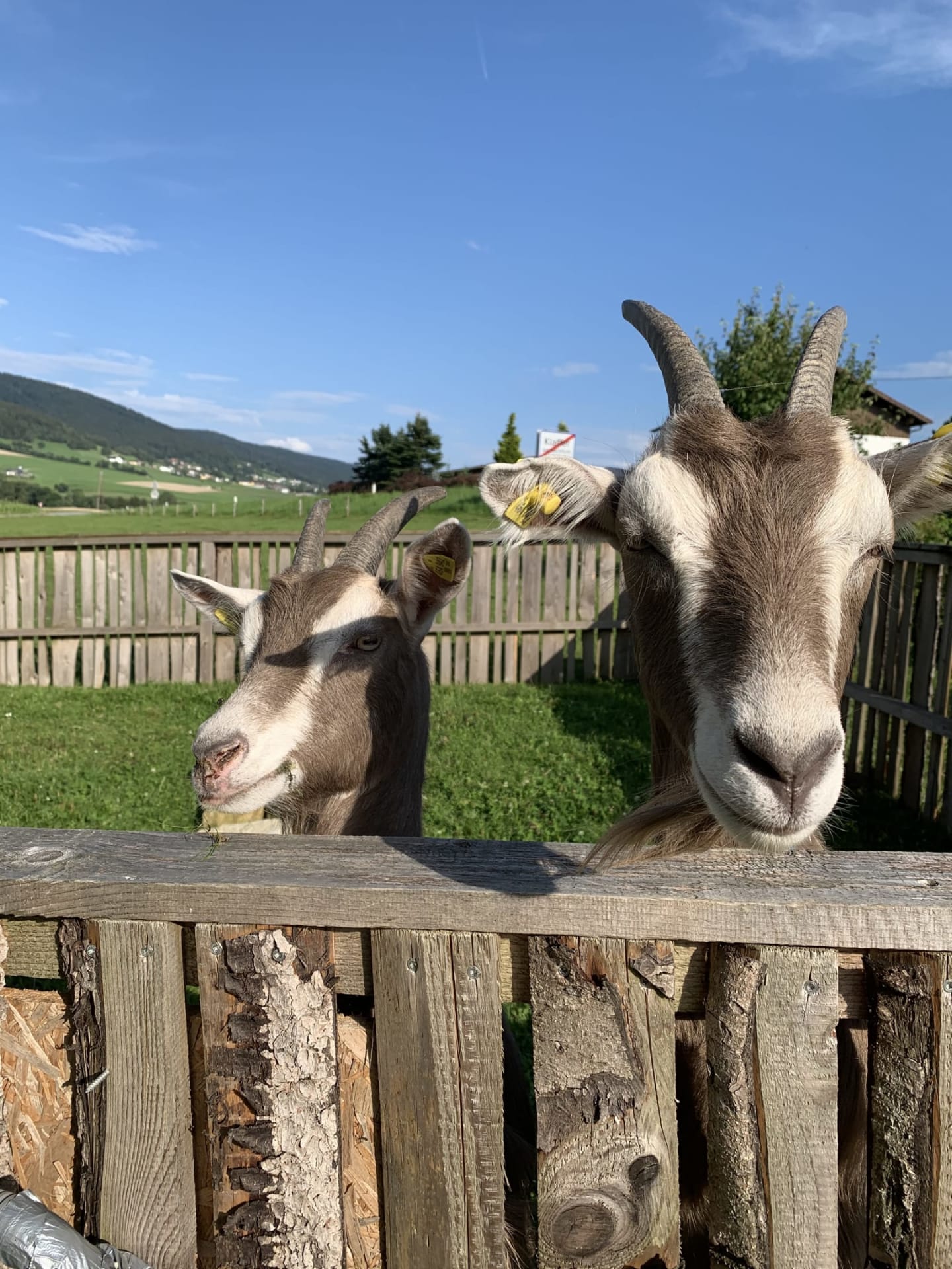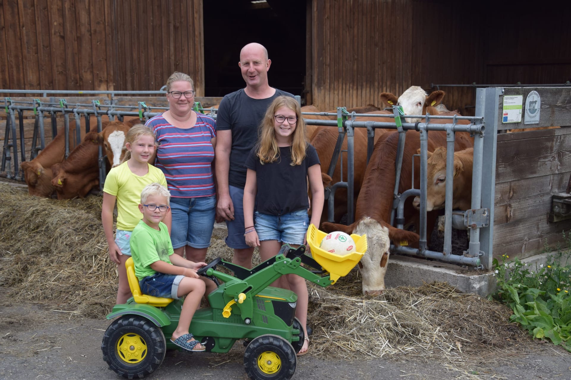 Auf unserem Hof gibt es viele Tiere: Kühe, Kälber, Hühner, Ziegen und Hasen zum Füttern und zum Streicheln.