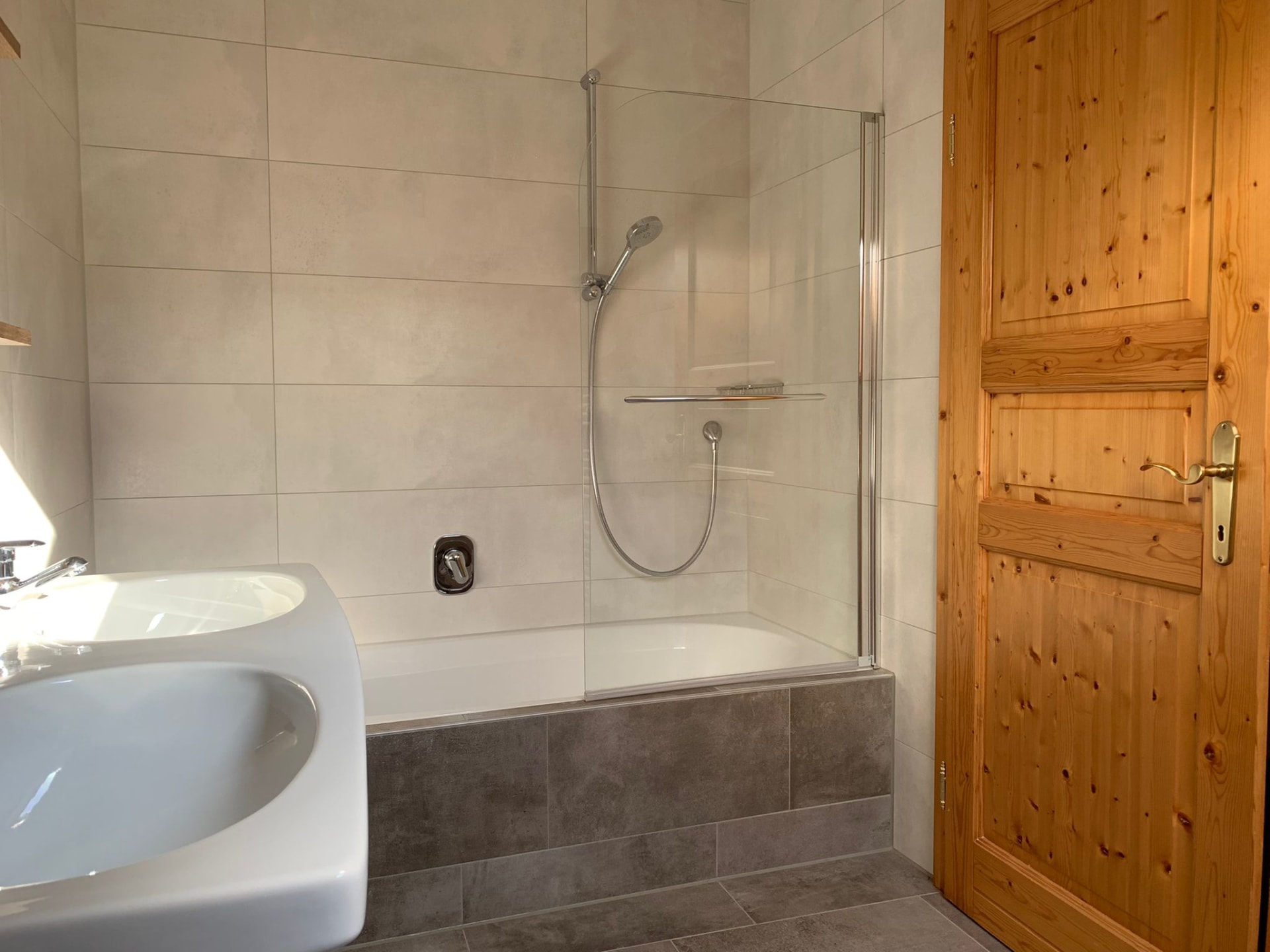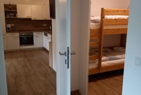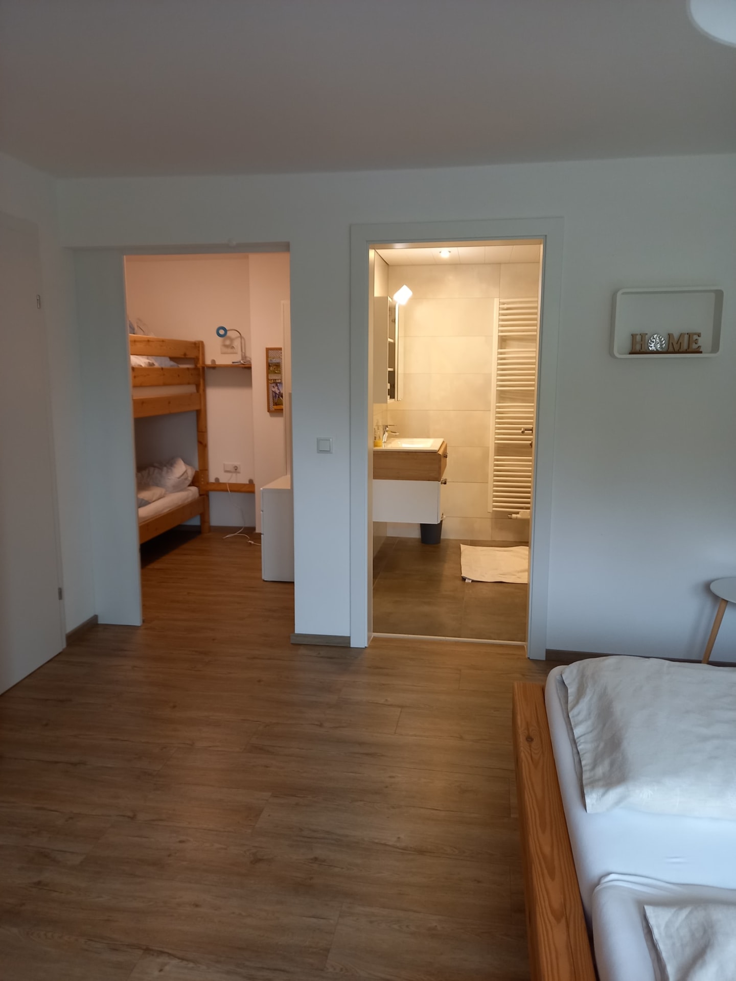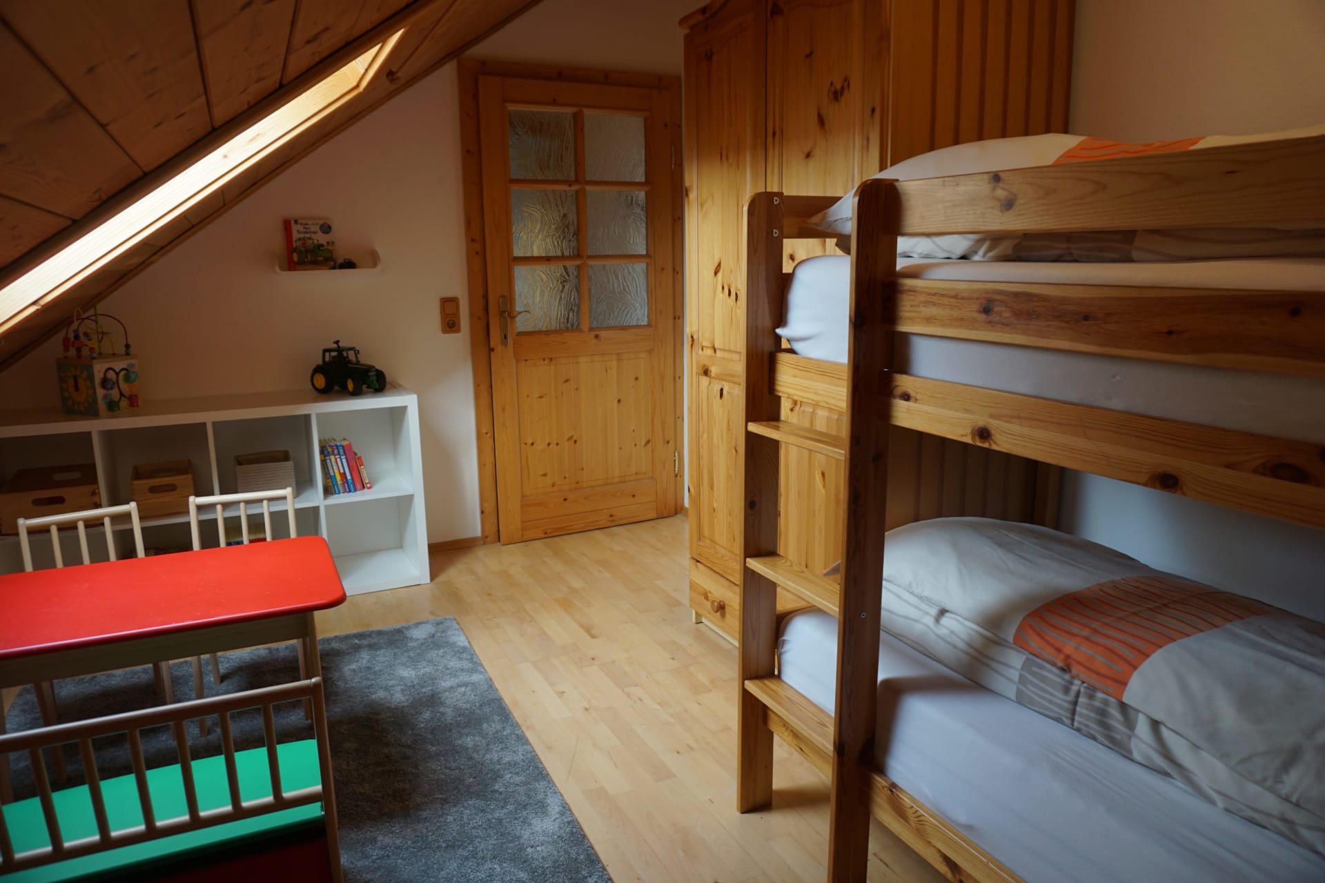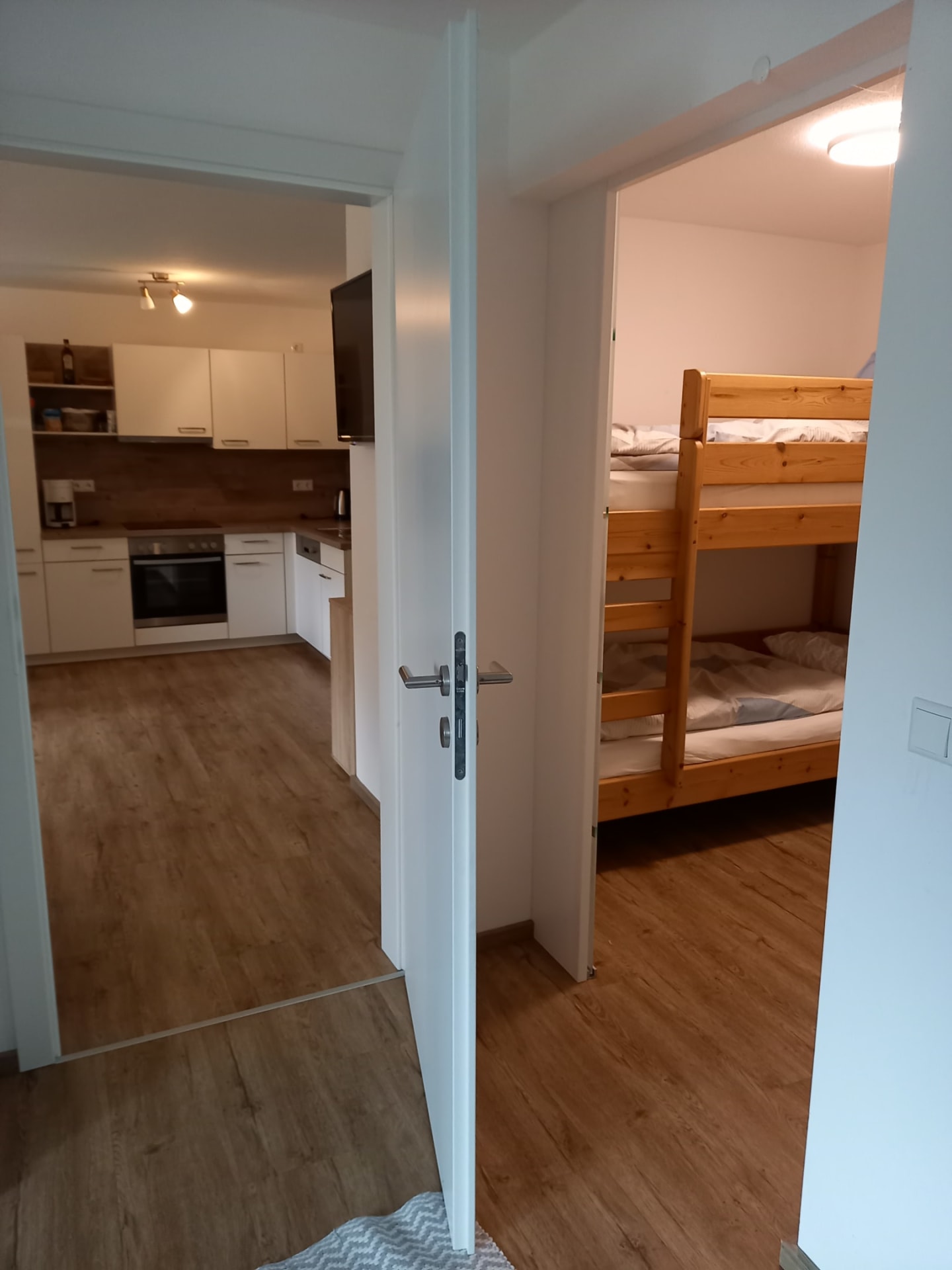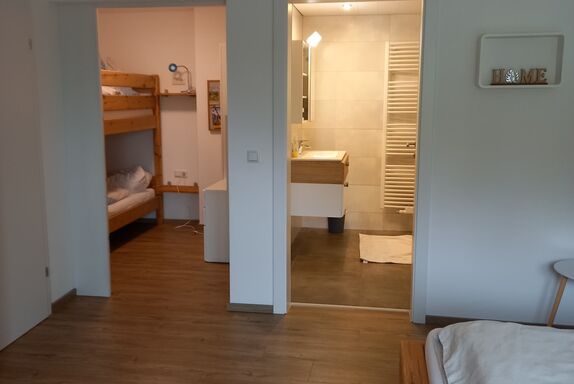 Das Elternschlafzimmer und das Kinderzimmer, in dem sich ein Stockbett befindet, sind mit einer Schiebetür aus Glas getrennt. Im Badezimmer befinden sich ein Waschbecken sowie die Dusche inklusive Hand- und Badetüchern und ein WC.