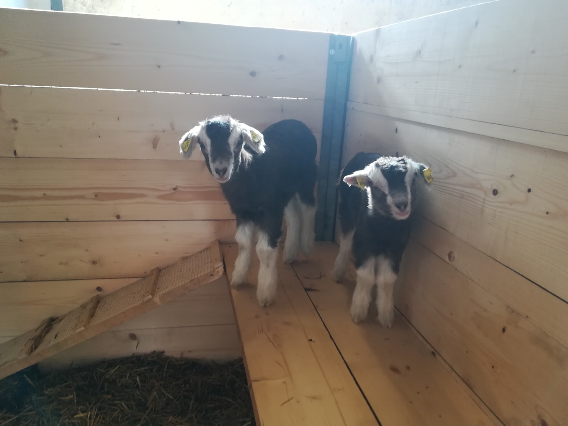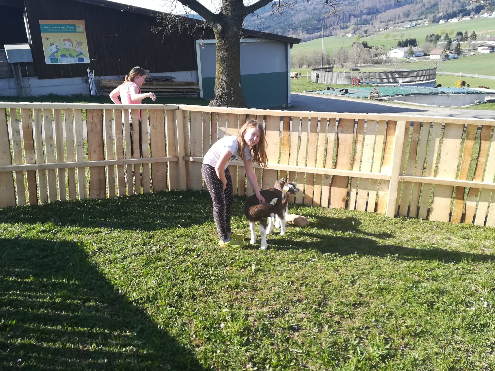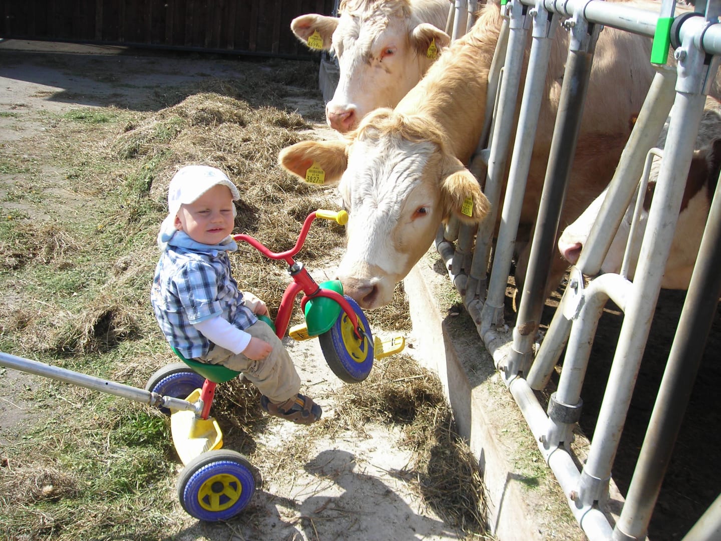Auf unserem Hof gibt es viele Tiere: Kühe, Kälber, Hühner, Ziegen und Hasen zum Füttern und zum Streicheln.