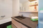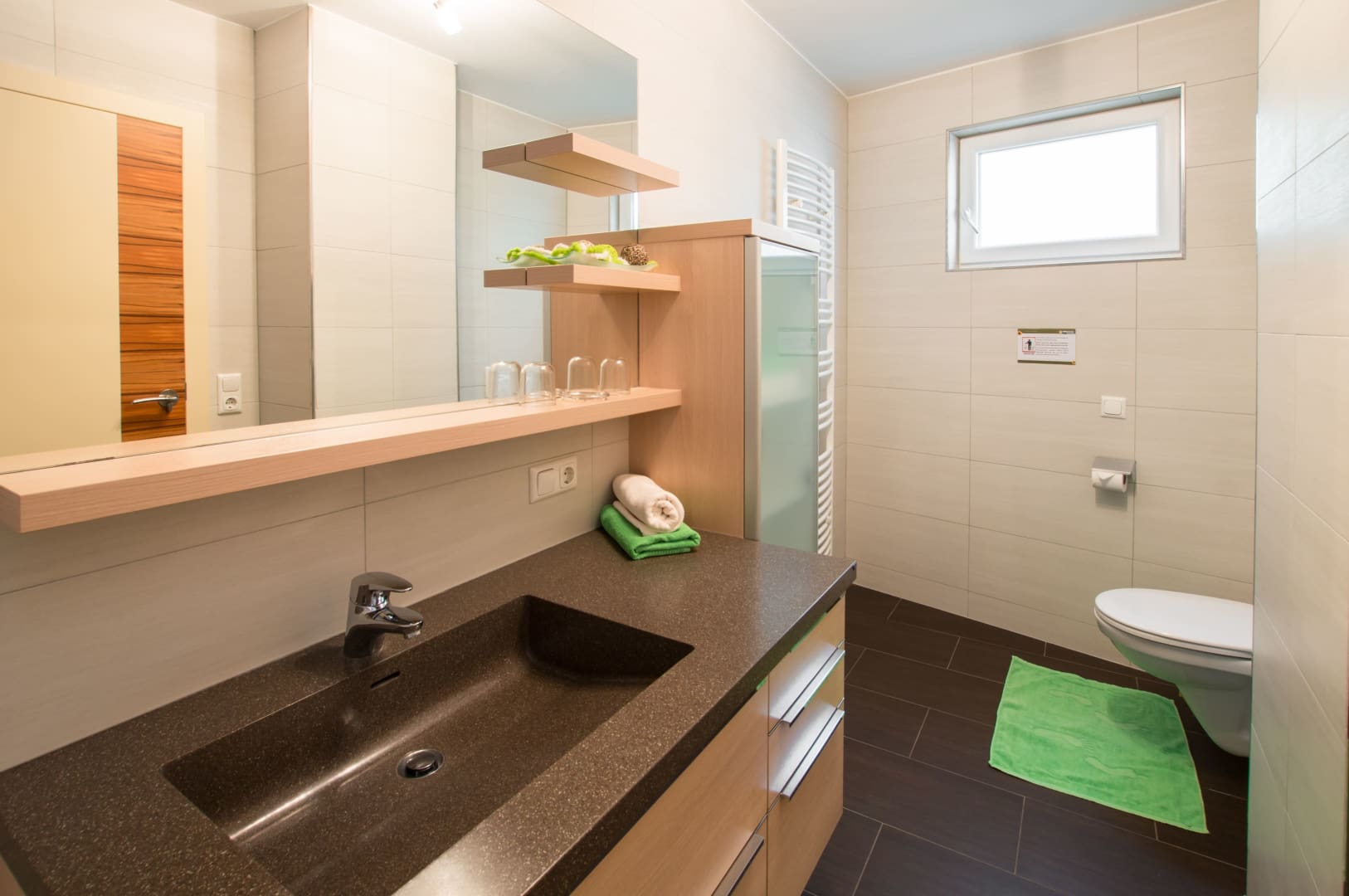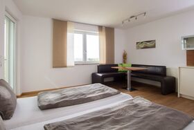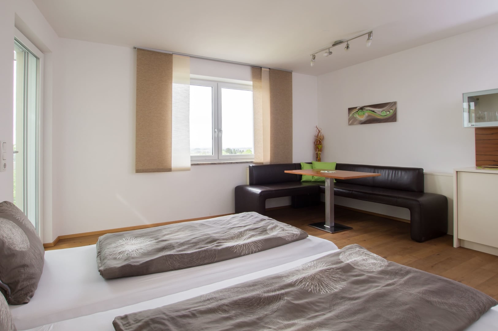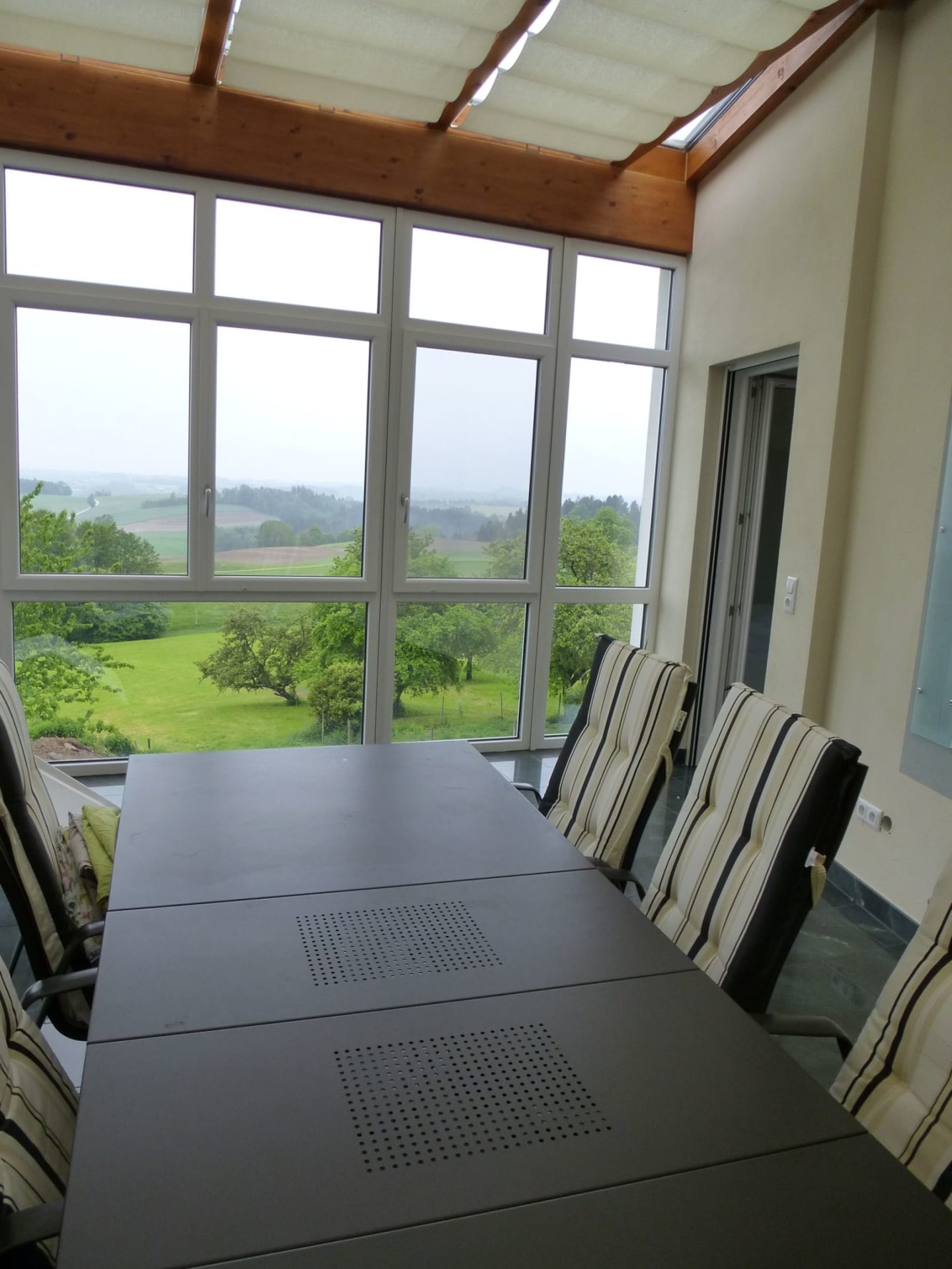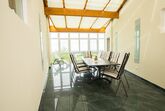 Geräumiges Doppelzimmer mit Sitzecke, TV und Kühlschrank, Bad mit WC ausgestattet sowie Zugang zum großzügigen Wintergarten mit Panoramablick.