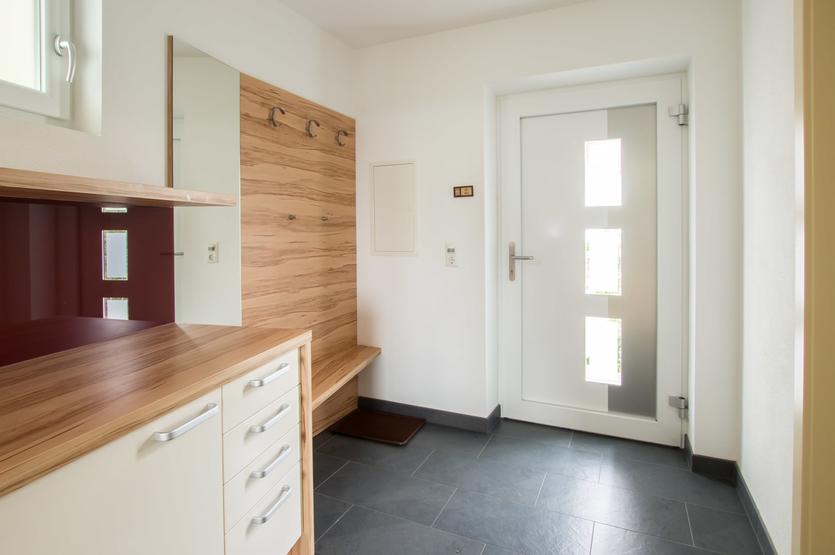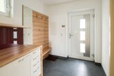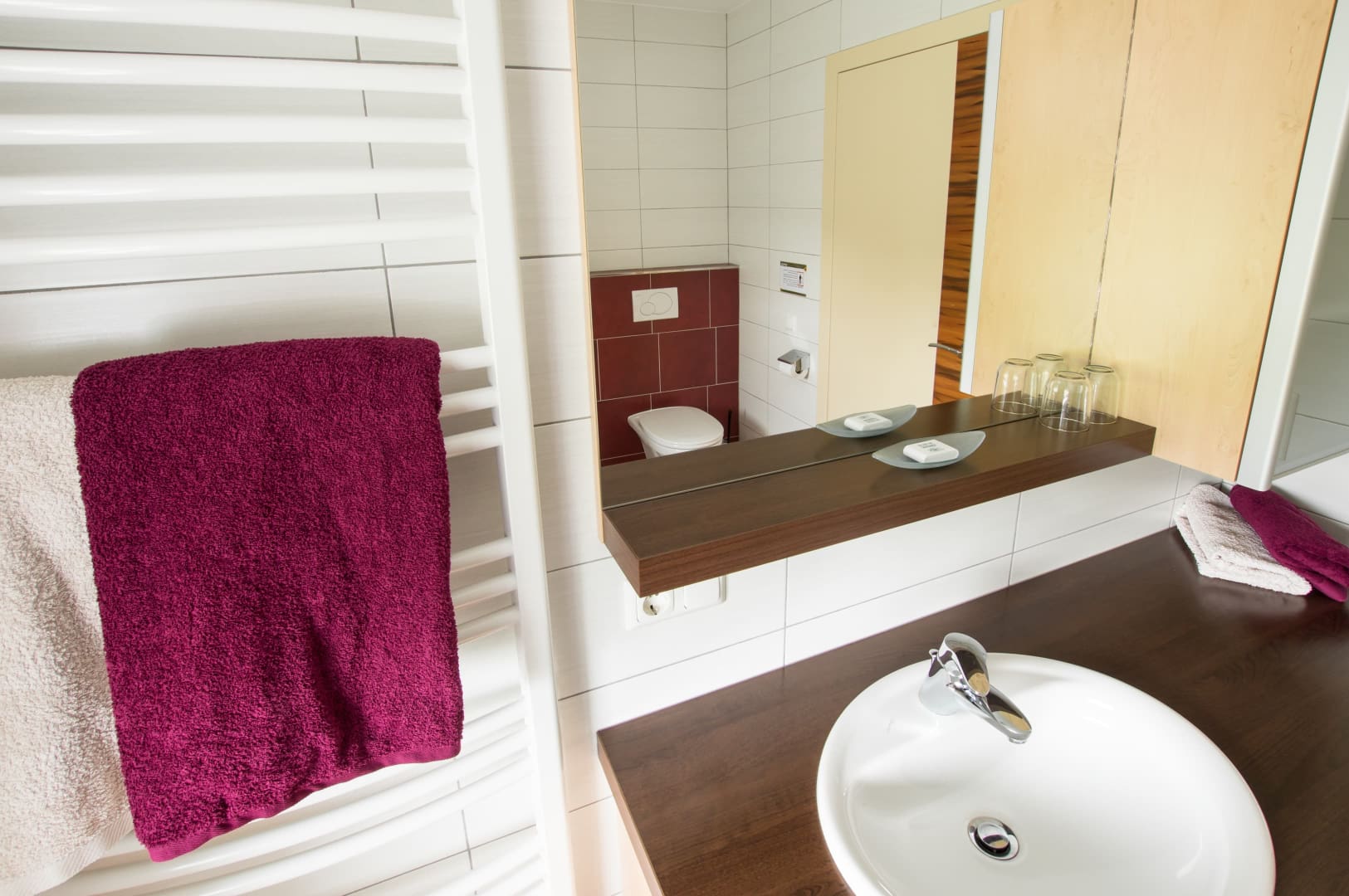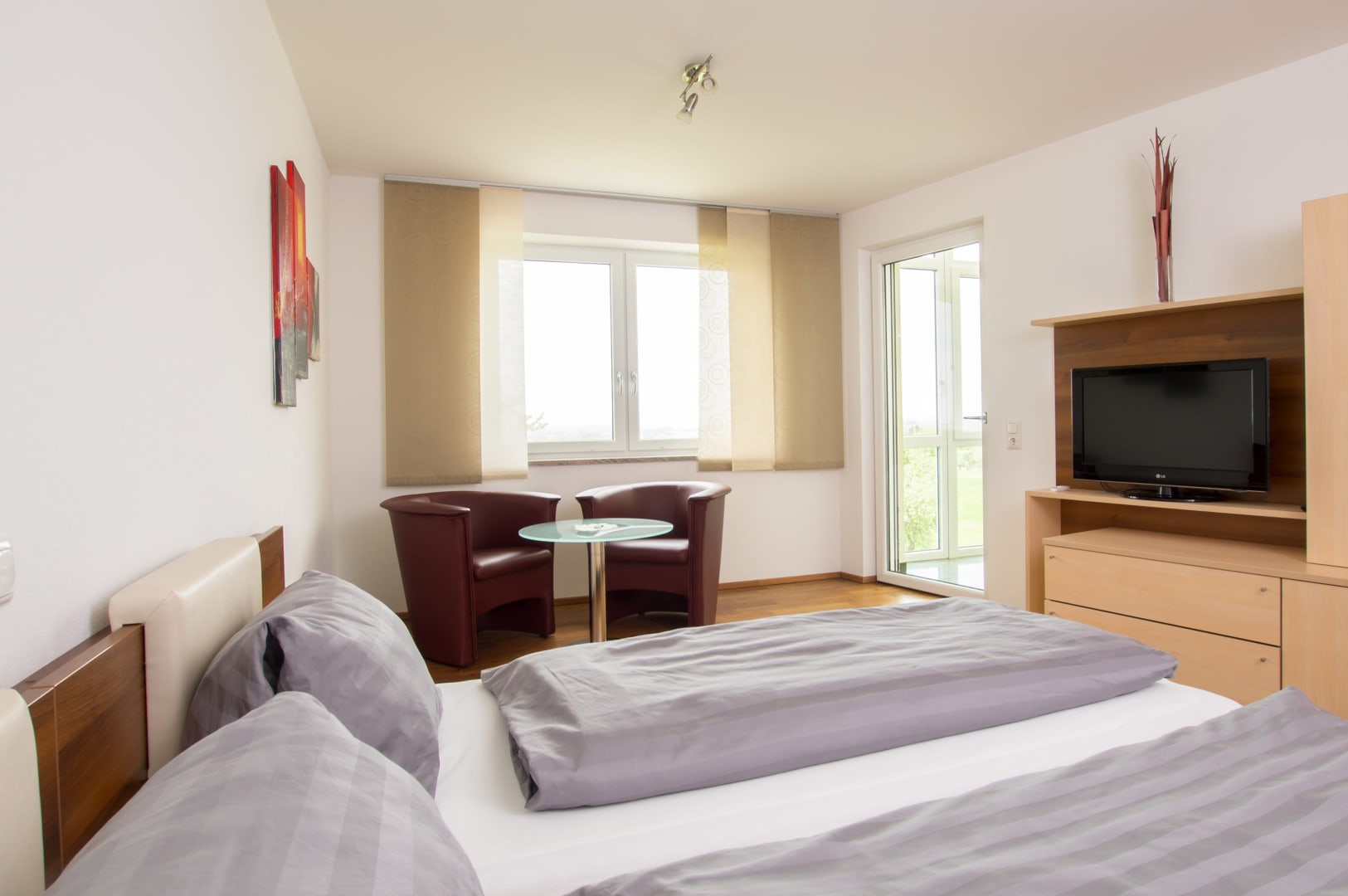 Doppelzimmer mit Vorraum, Bad mit Dusche und WC. Im Vorraum befindet sich eine Garderobe und ein Kühlschrank.