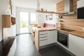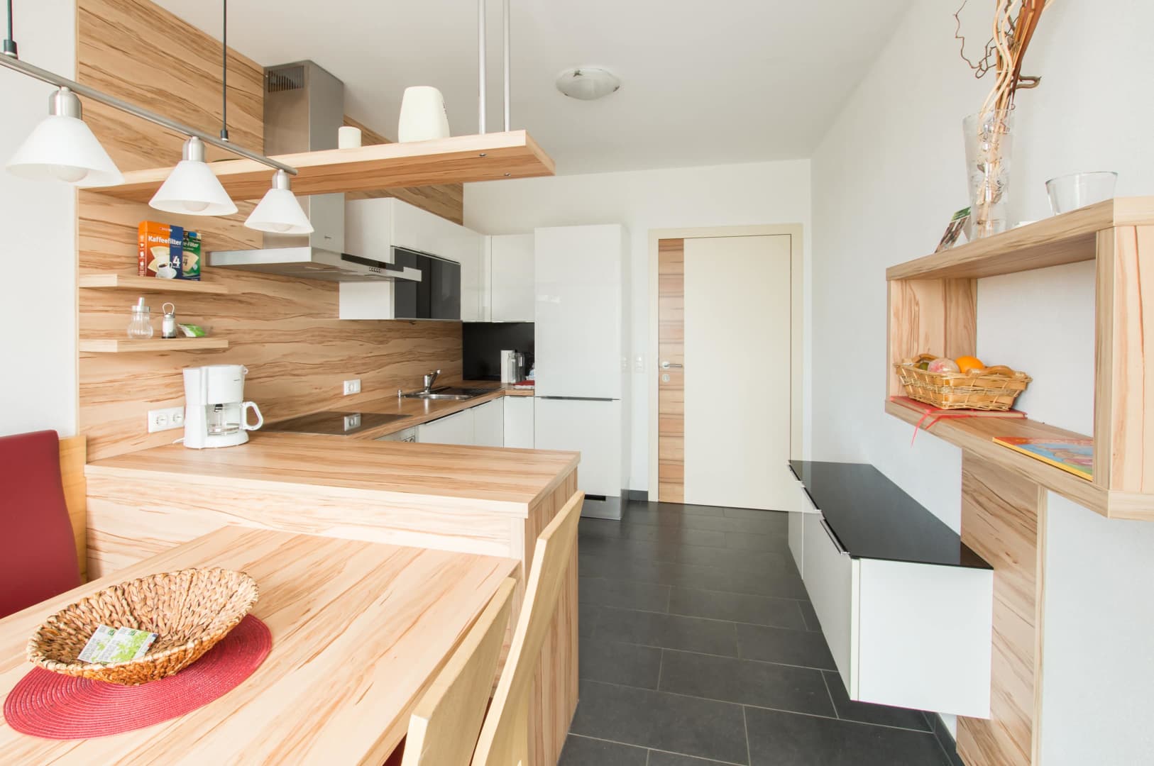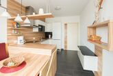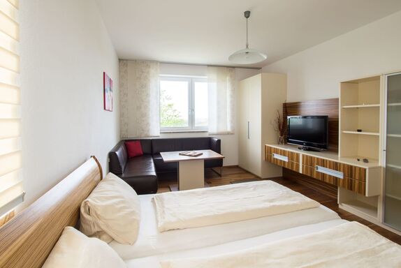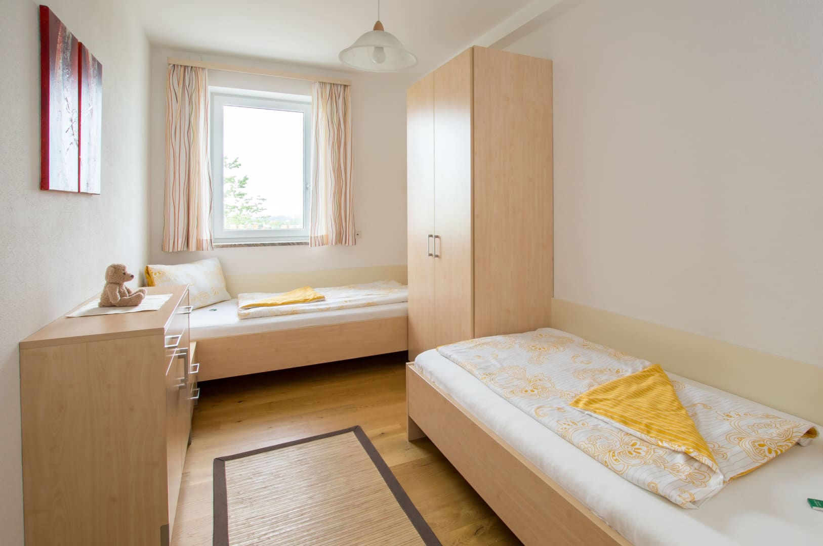 Familienzimmer mit extra Kinderzimmer und Küche mit Terrasse nebenan. Ist mit Fußbodenheizung und Fliegengitter ausgestattet.