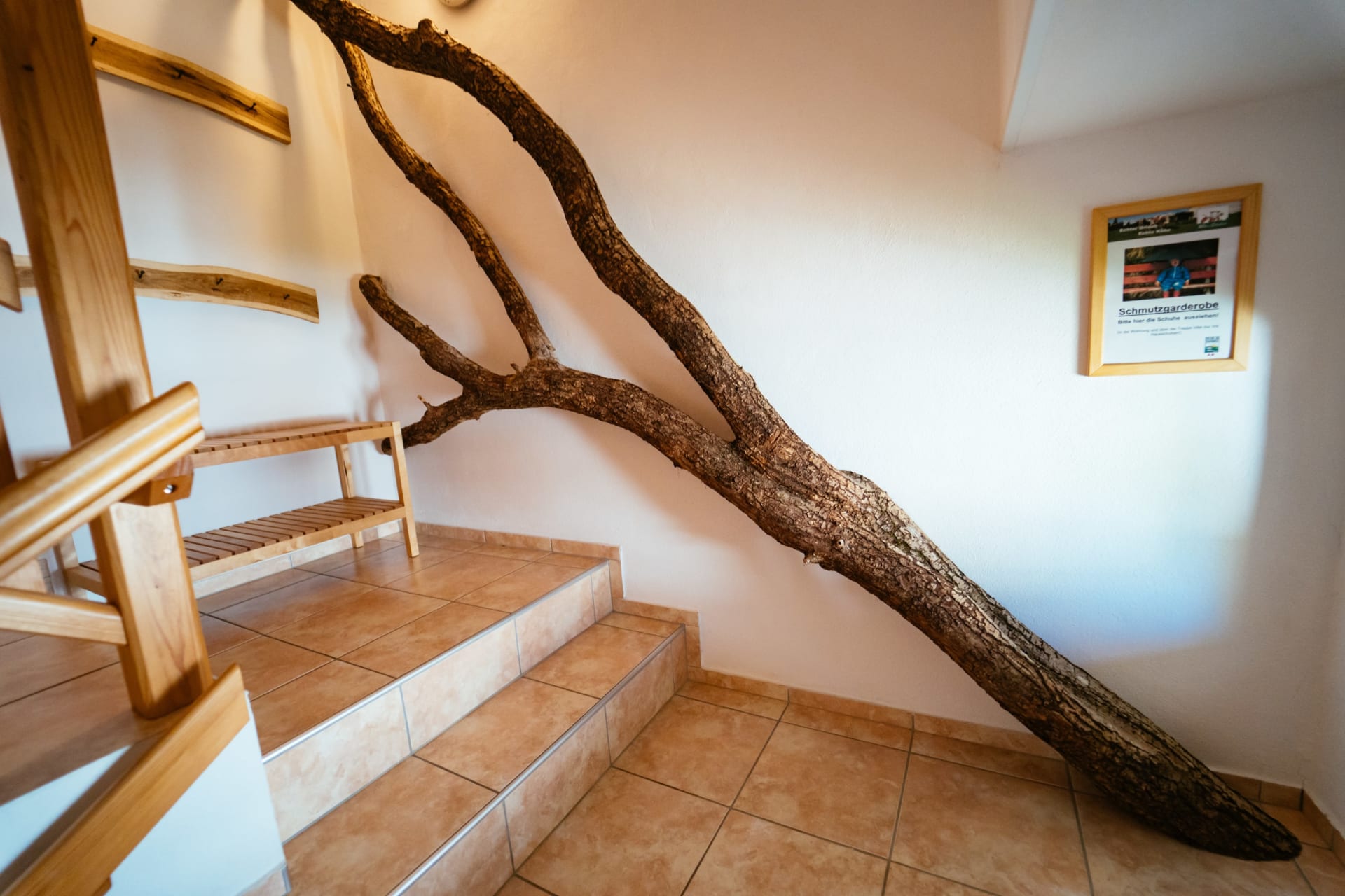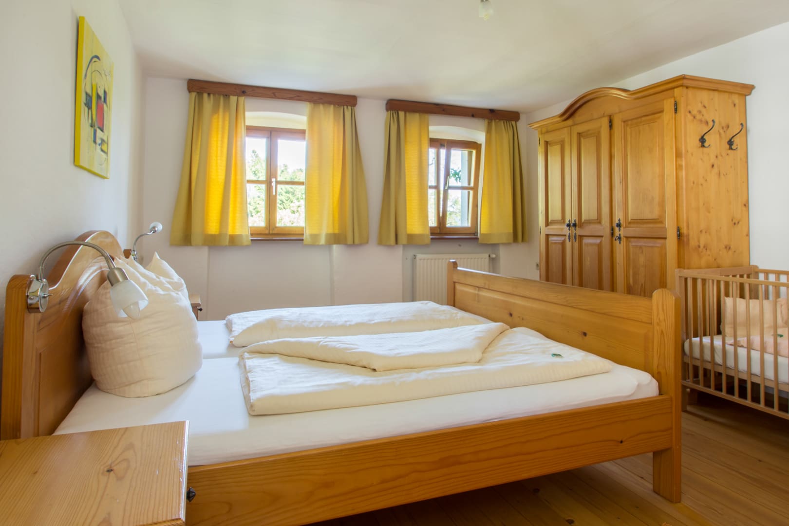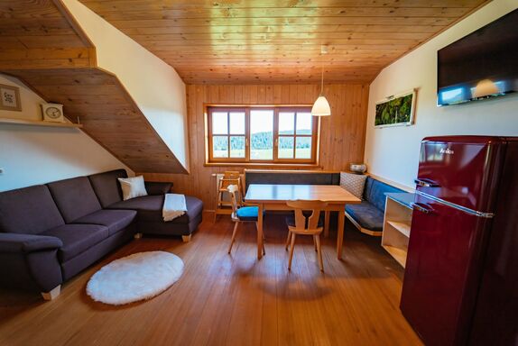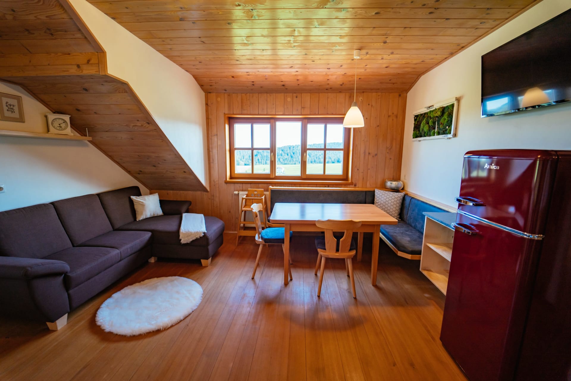 Im Familienzimmer Schwalbennest erwartet Sie eine atemberaubende Aussicht und eine heimelige Atmosphäre. Spüren Sie das Holz aus unserem Wald. Gedämmt wurde mit Schafwolle, dadurch ist es im Winter kuschelig warm und im Sommer angenehm kühl.