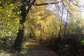 Ausblick über Garten und Wiesen in Richtung Waldrand.