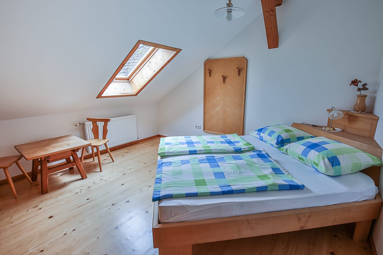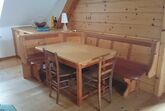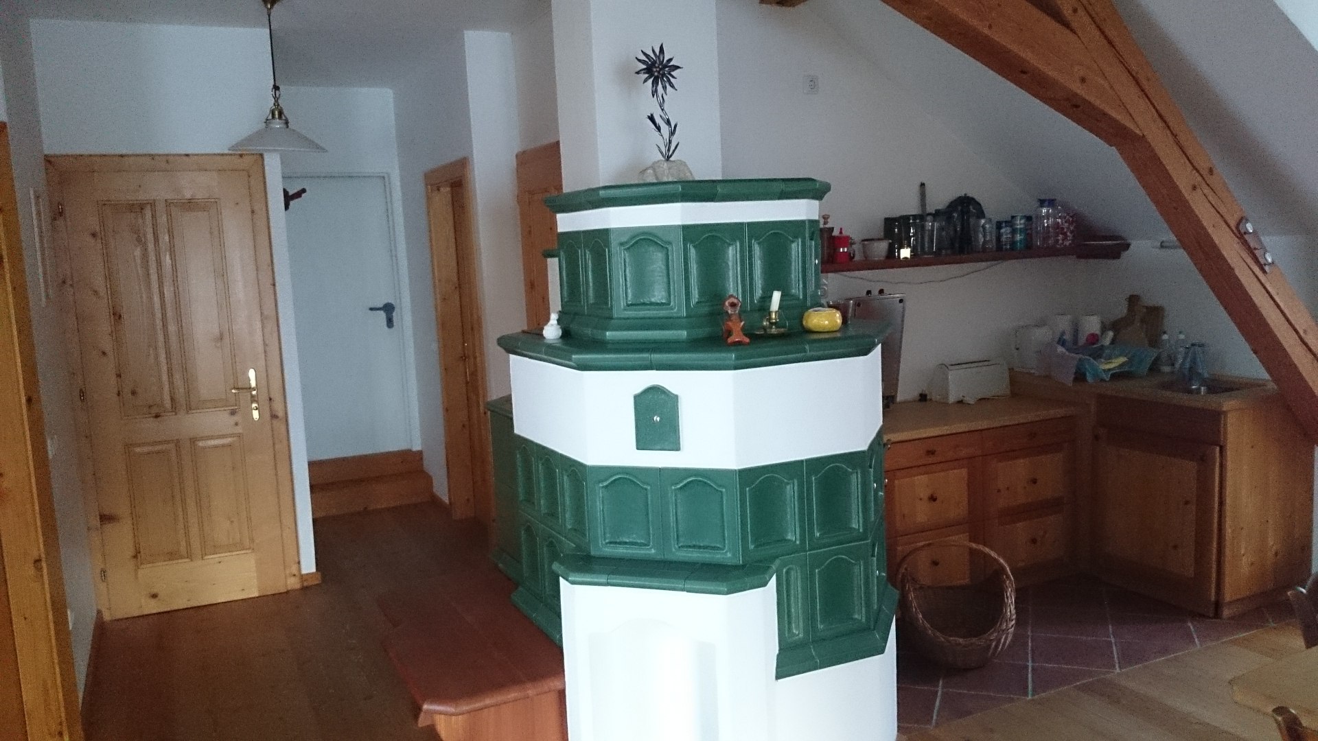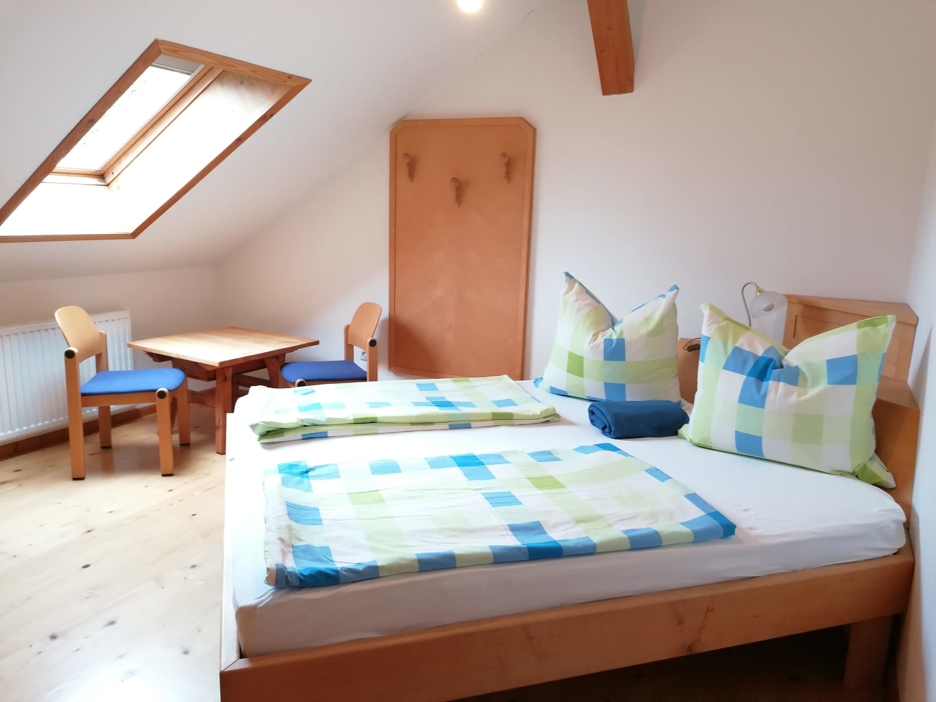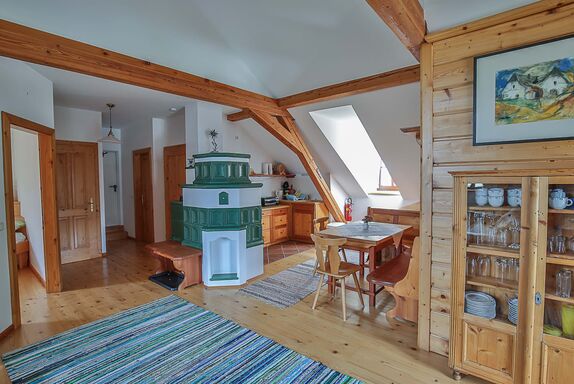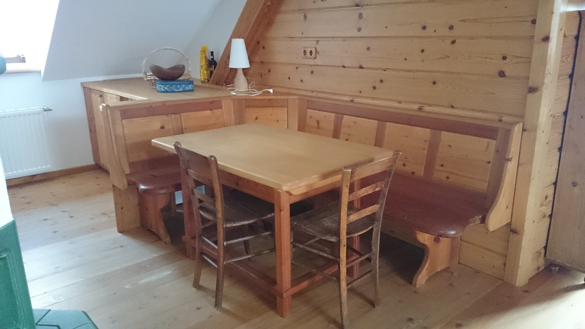 Die Dachgeschosswohnung im 2. Stock verfügt über eine große Wohnküche, Badezimmer mit Badewanne und Waschmaschine, extra WC, 2 Schlafzimmer und einen Balkon - insg. 98 m². Das Elternschlafzimmer hat ein Doppelbett, im Kinderzimmer stehen 2 Einzelbetten. Gerne stellen wir ein Gitterbett ins Elternschlafzimmer. Die Wohnküche ist ausgestattet mit einer Induktionsplatte, einem Kachelofen inkl. Herdplatte, Geschirrspüler, Abwaschbecken, Kühlschrank, Wasserkocher, Toaster und Filterkaffeemaschine. Im Wohnraum befindet sich eine gemütliche Eckbank mit Esstisch, eine Couch, ein Fernseher und es gibt gratis W-Lan Internet. Gerne können Sie auch als Ferienwohnungsgast Frühstück und Halbpension (Abendessen) gegen Aufpreis bei uns genießen.