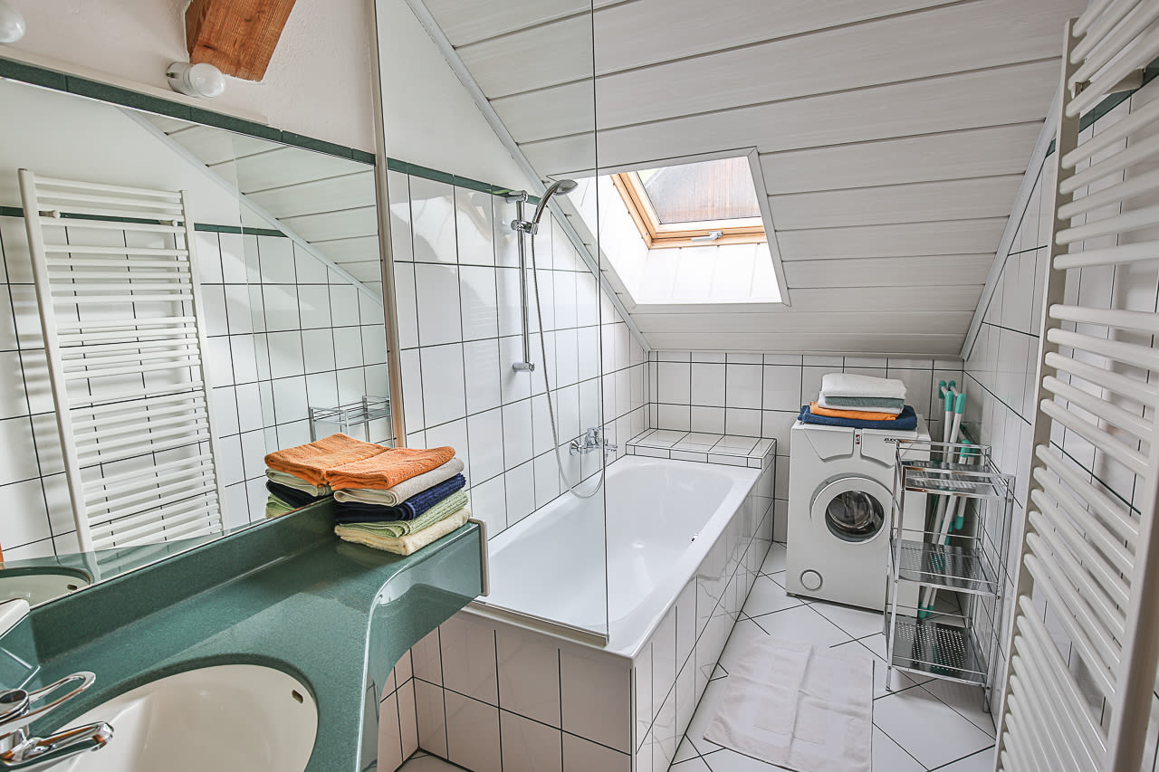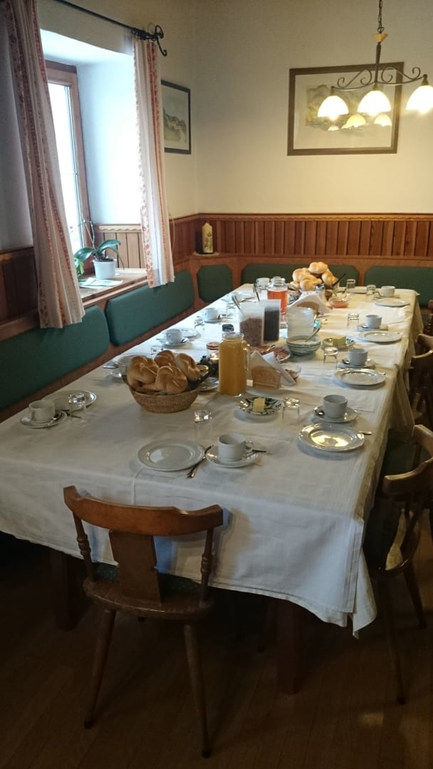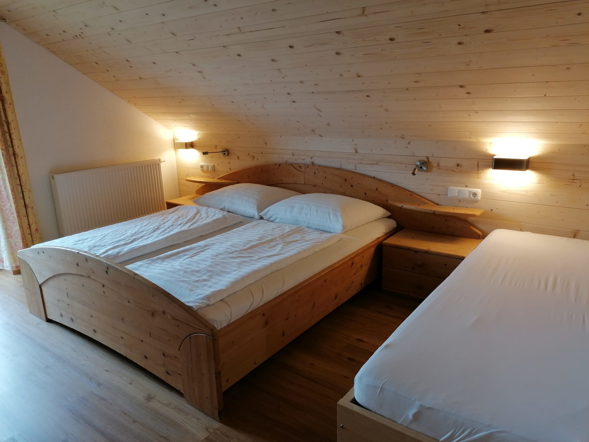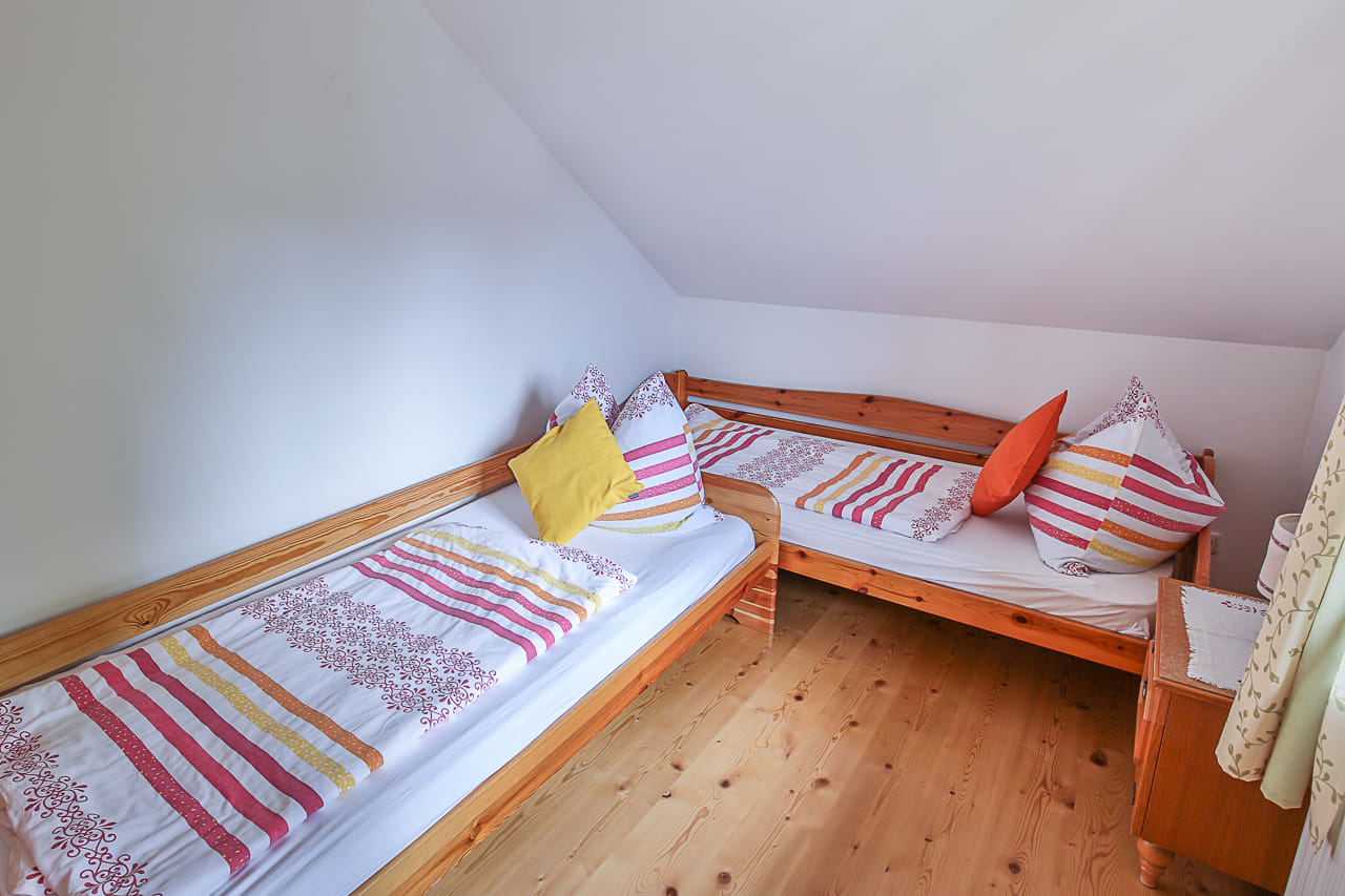 Die Dachgeschosswohnung im 2. Stock verfügt über eine große Wohnküche, Badezimmer mit Badewanne und Waschmaschine, extra WC, 2 Schlafzimmer und einen Balkon - insg. 98 m². Das Elternschlafzimmer hat ein Doppelbett, im Kinderzimmer stehen 2 Einzelbetten. Gerne stellen wir ein Gitterbett ins Elternschlafzimmer. Die Wohnküche ist ausgestattet mit einer Induktionsplatte, einem Kachelofen inkl. Herdplatte, Geschirrspüler, Abwaschbecken, Kühlschrank, Wasserkocher, Toaster und Filterkaffeemaschine. Im Wohnraum befindet sich eine gemütliche Eckbank mit Esstisch, eine Couch, ein Fernseher und es gibt gratis W-Lan Internet. Gerne können Sie auch als Ferienwohnungsgast Frühstück und Halbpension (Abendessen) gegen Aufpreis bei uns genießen.