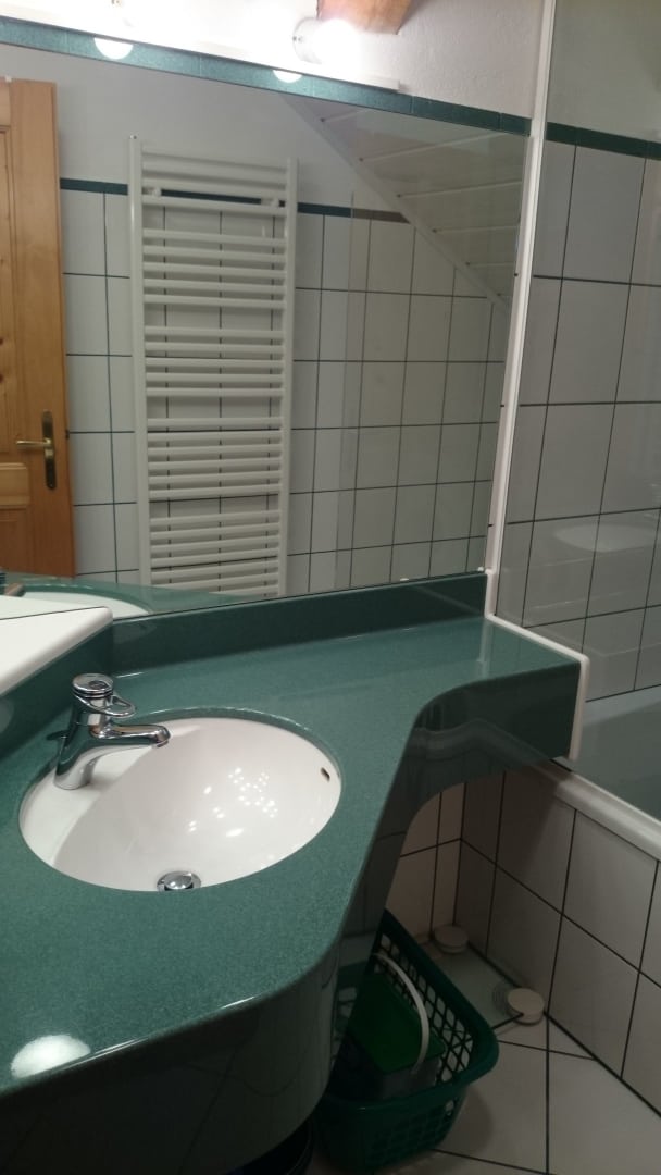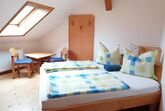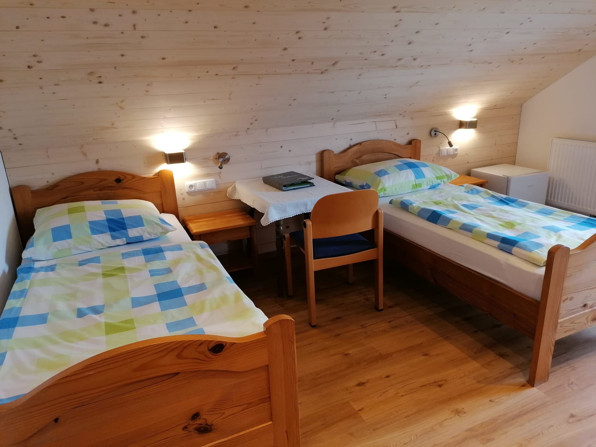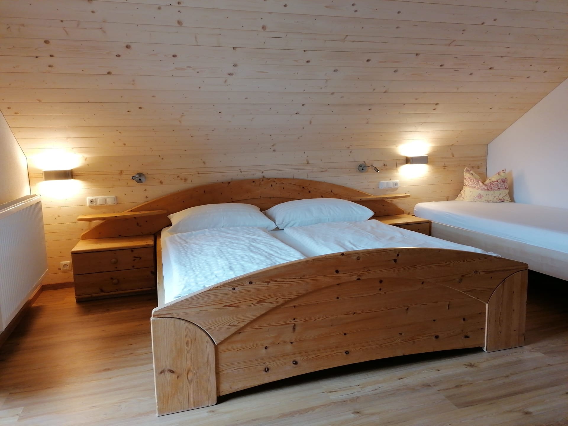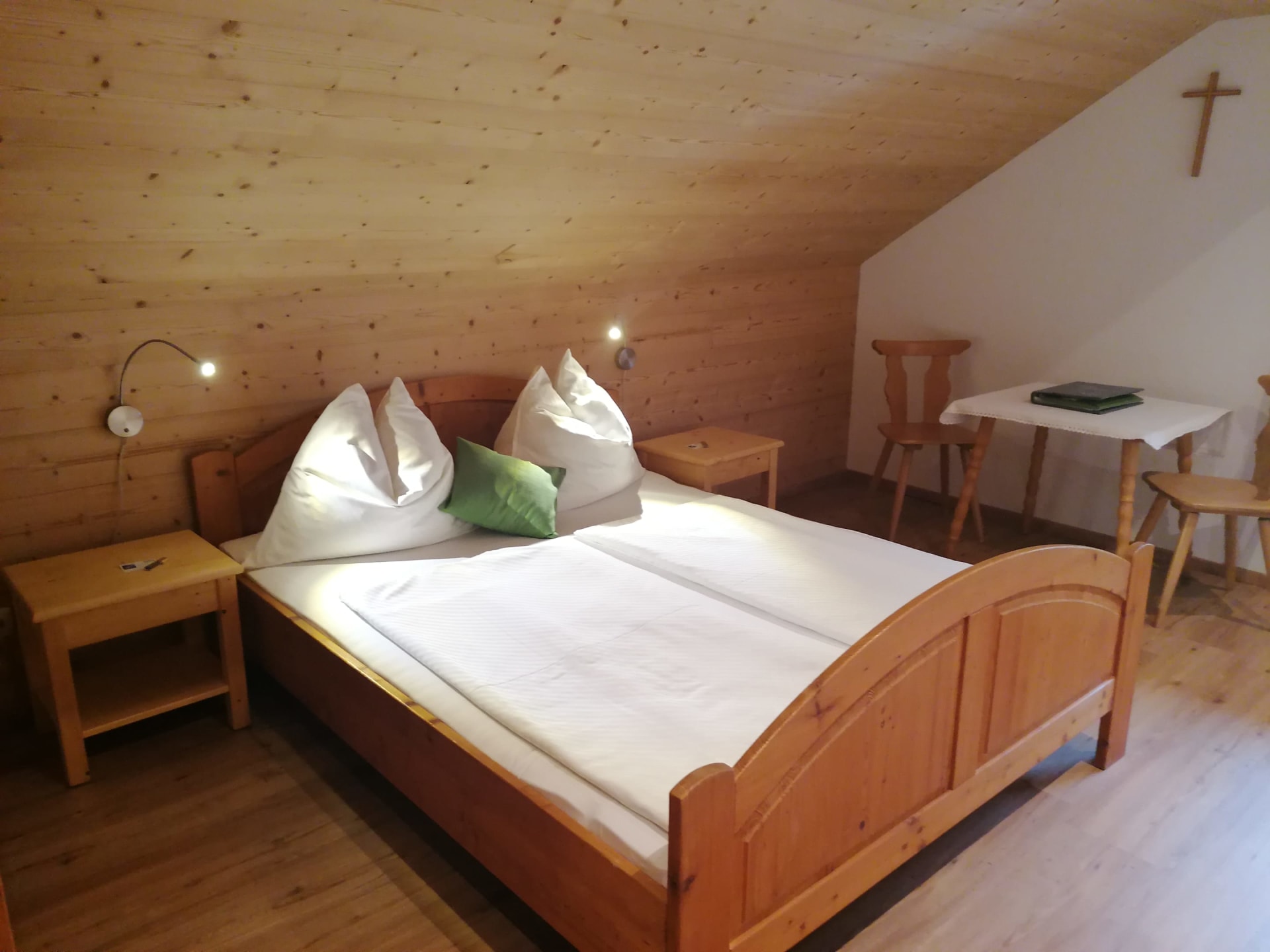 Die Dachgeschosswohnung im 2. Stock verfügt über eine große Wohnküche, Badezimmer mit Badewanne und Waschmaschine, extra WC, 2 Schlafzimmer und einen Balkon - insg. 98 m². Das Elternschlafzimmer hat ein Doppelbett, im Kinderzimmer stehen 2 Einzelbetten. Gerne stellen wir ein Gitterbett ins Elternschlafzimmer. Die Wohnküche ist ausgestattet mit einer Induktionsplatte, einem Kachelofen inkl. Herdplatte, Geschirrspüler, Abwaschbecken, Kühlschrank, Wasserkocher, Toaster und Filterkaffeemaschine. Im Wohnraum befindet sich eine gemütliche Eckbank mit Esstisch, eine Couch, ein Fernseher und es gibt gratis W-Lan Internet. Gerne können Sie auch als Ferienwohnungsgast Frühstück und Halbpension (Abendessen) gegen Aufpreis bei uns genießen.