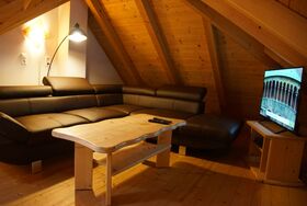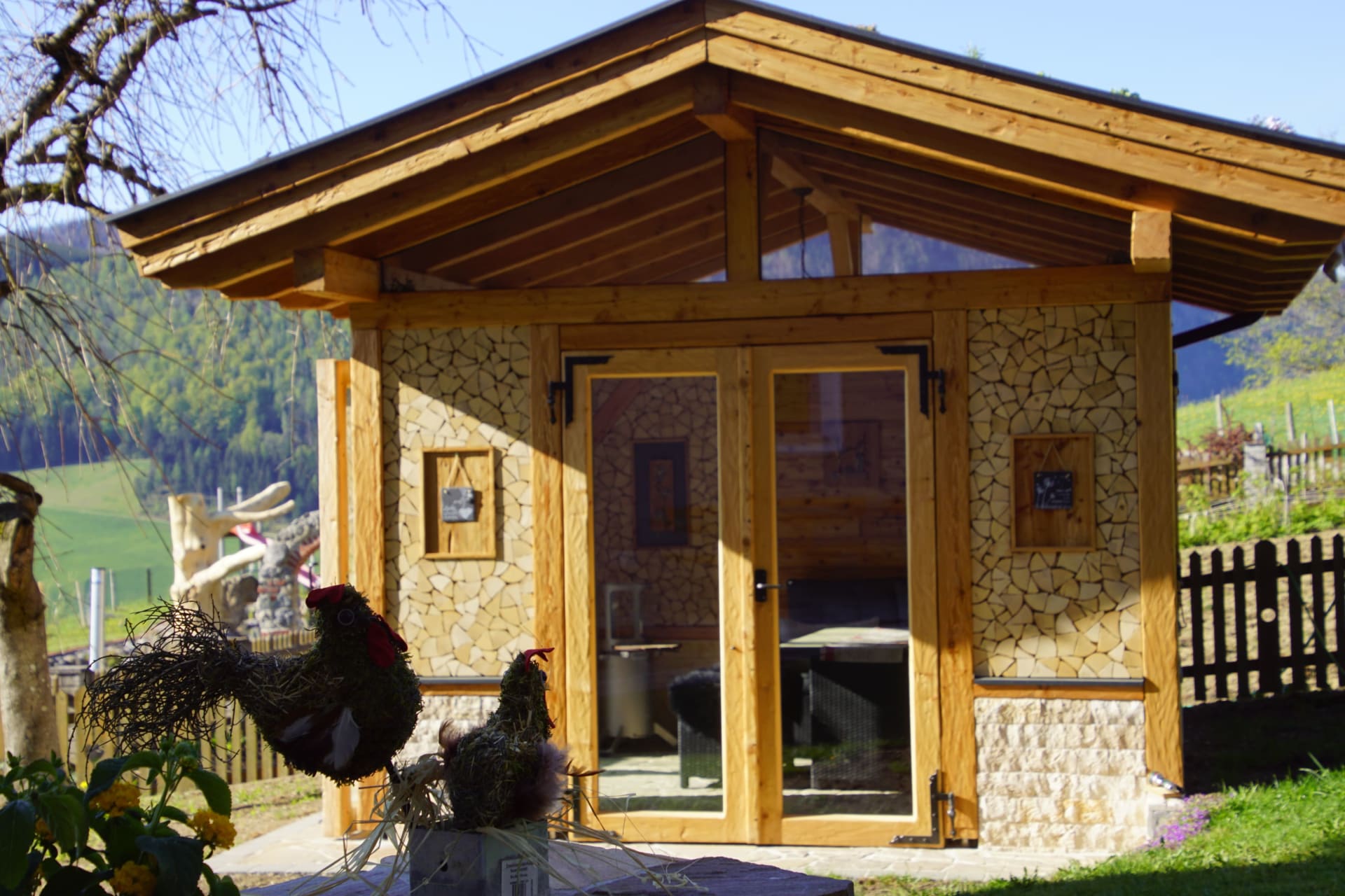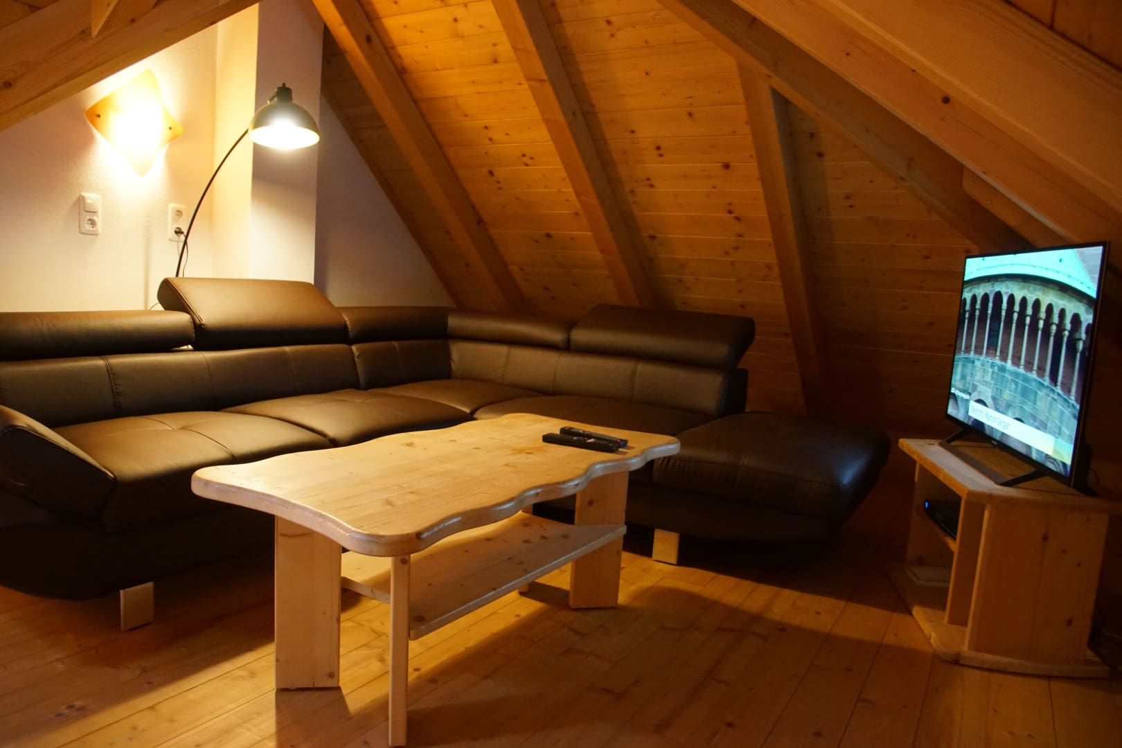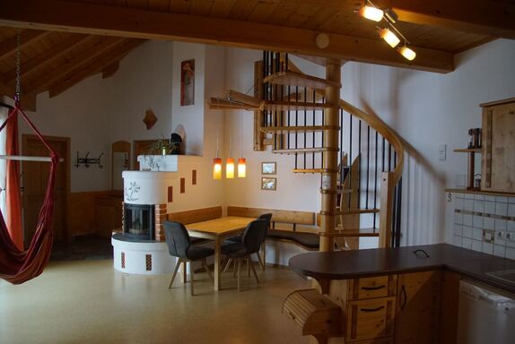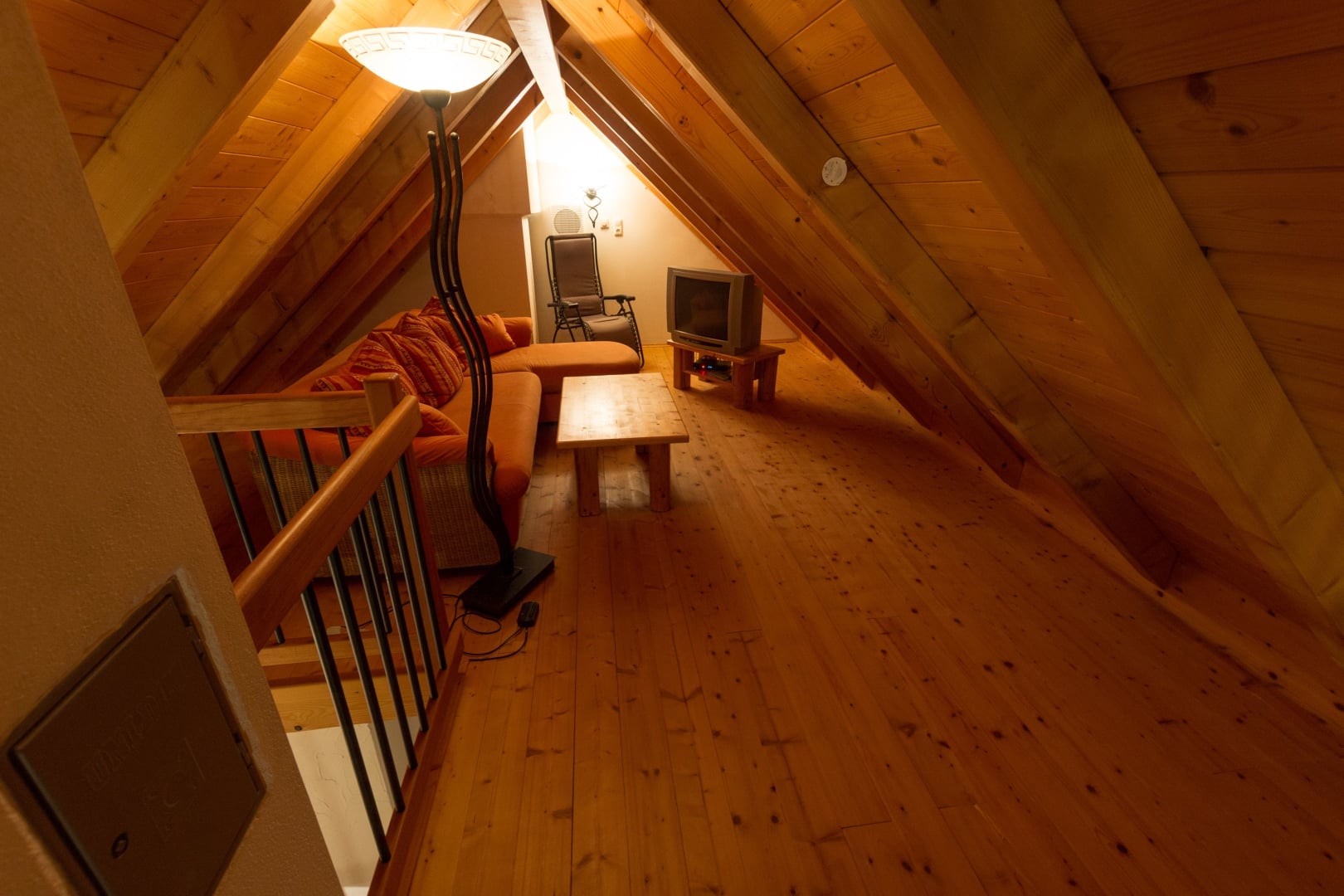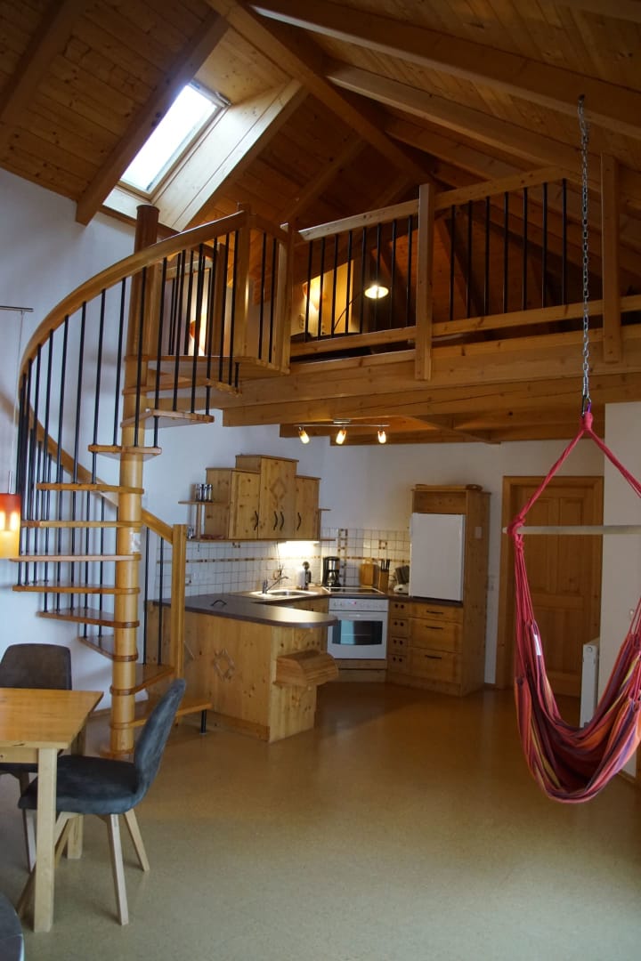 Schon einmal unterm echtem Sternenhimmel geschlafen? Oder einen eigenen Kamin angezündet und dem Feuer zugesehen? Hier gibt es auf 80 m² eine große Wohnküche mit allem Zubehör wie Geschirr, Kaffeemaschine, Geschirrspüler, Brotschneidemaschine... samt Holzkamin. Nebenan befinden sich die beiden Doppelbettzimmer. Über die Wendeltreppe erreichen Sie die Galerie mit Couch und Fernseher. Die Dachterrasse mit Dachglas versehen ist das große Highlight. Hier können Sie Frühstücken, Relaxen oder das Doppelbett darauf durch eine mobile Wand schieben und die Sterne in der Nacht bewundern.