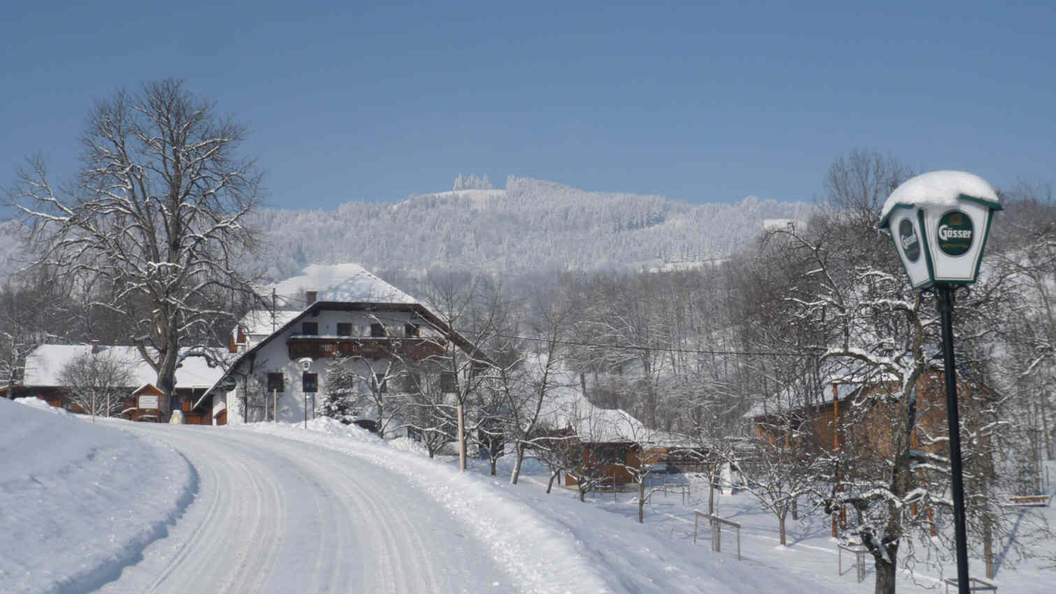 Wer hat das schöne Schneemann-/Schneefrauendorf vor unserem Ferienhof gebaut? Nehmt euch die Rodel aus der Scheune, hinauf auf den „Kogel“ und nun den Berg hinab sausen.