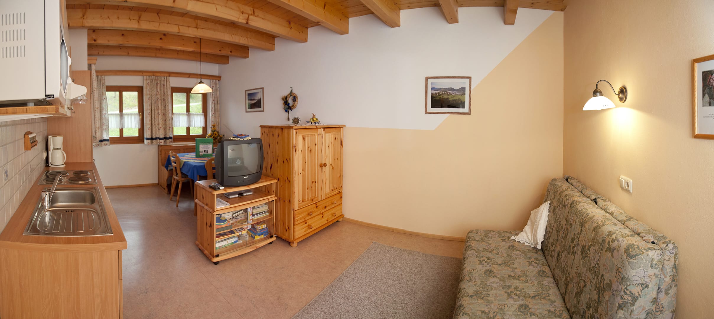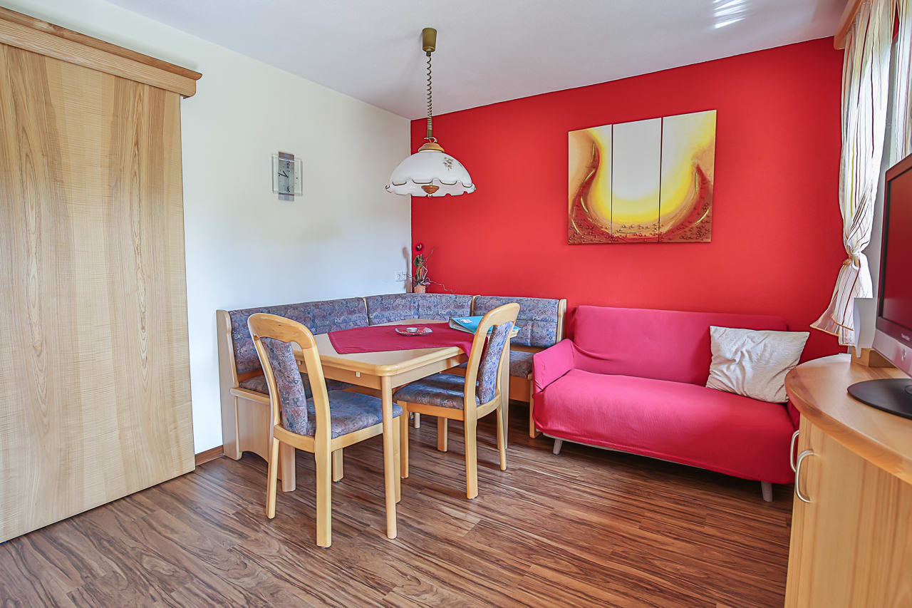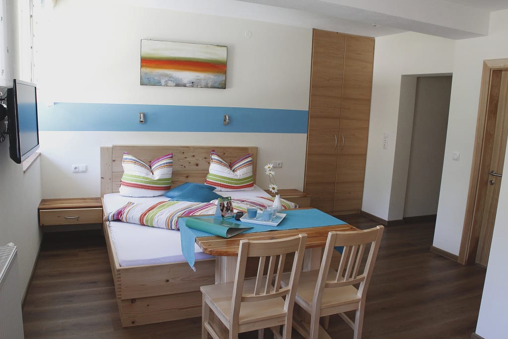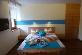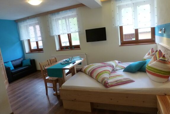 Mit dem Blick aus dem Fenster des Doppelzimmers „Winter“ werden Sie mit dem Anblick unseres lebendigen Bauernhofes verwöhnt. Beobachten Sie wie das Kalb seinen Hunger bei der Mutter stillt, hören Sie das Rauschen des Baches und das Krähen des Hahnes. Nach dem schmackhaften Bauernfrühstück kann der neue Tag beginnen.