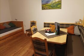 Ferienwohnung für 2 bis 4 Personen im 1. Stock bestehend aus: 2 Doppelzimmer mit jeweils Dusche/WC und Sat-TV und Balkon; 1 gemütlicher Wohn- und Essraum mit Sat-TV, Essbereich; Kochnische komplett ausgestattet mit Spülmaschine, Backrohr, Cerankochfeld, Kühlschrank mit Gefrierfach, Kaffeemaschine uvm.; zur Wohnung gehört noch eine kleine gemütliche Terrasse.