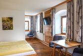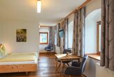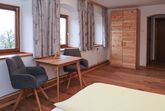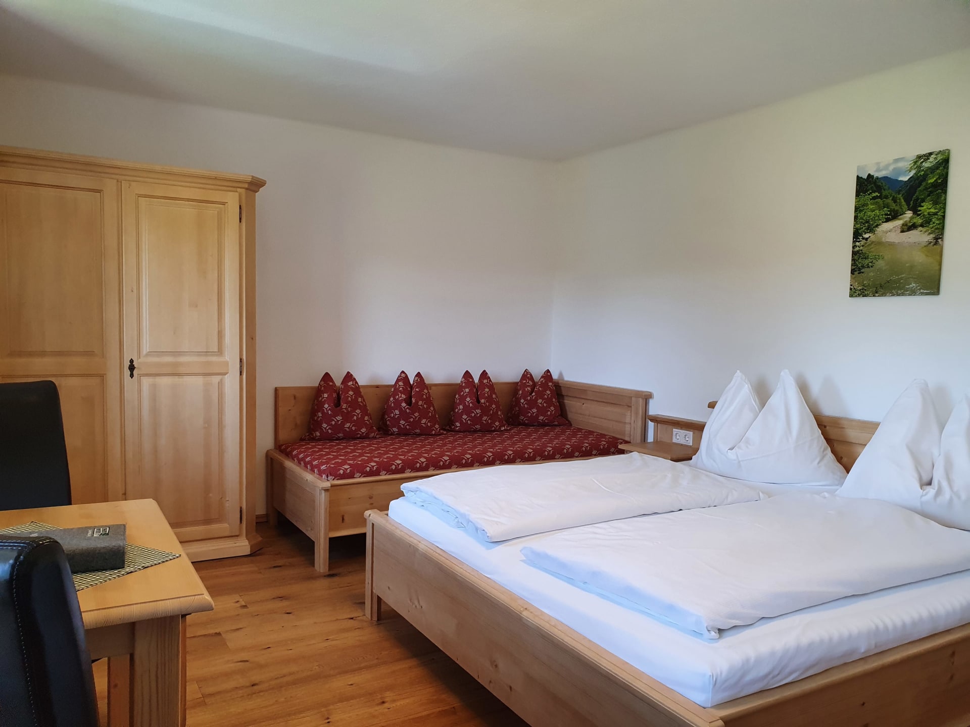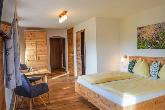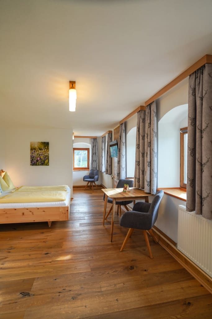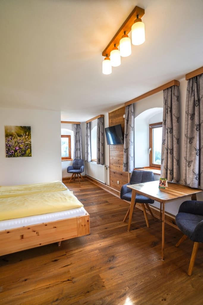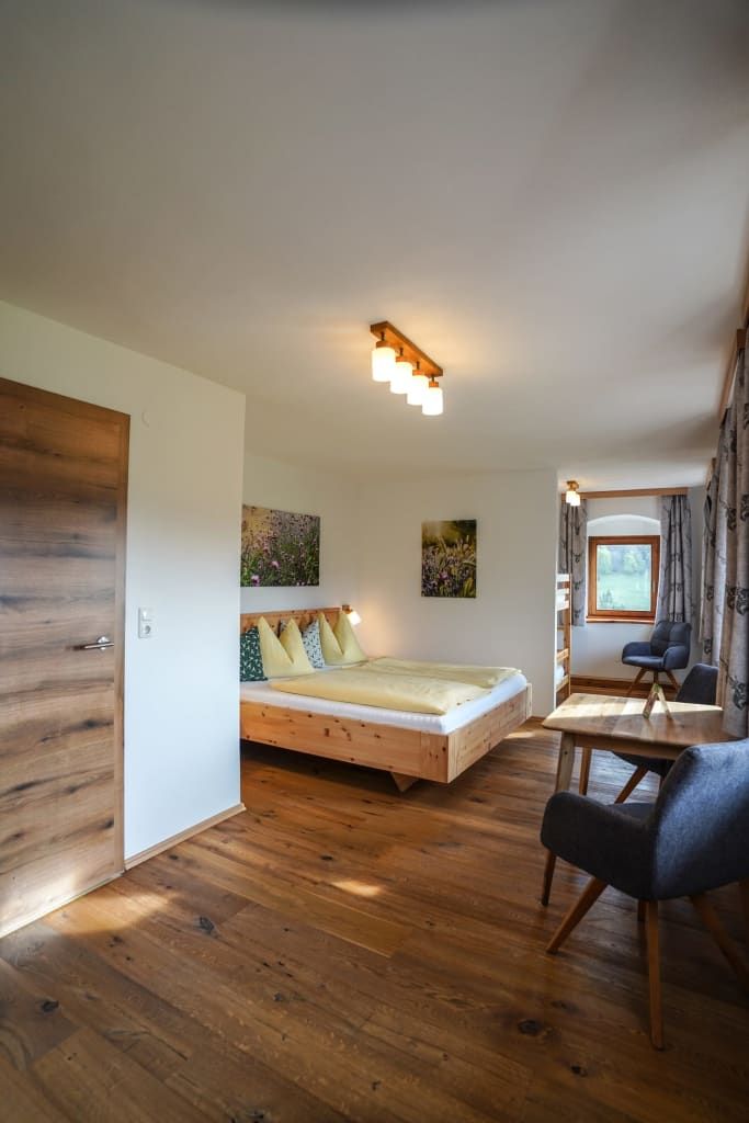 Das komplett neu renovierte Familienzimmer Schieferstein ist ca. 35 m² groß und mit hochwertigen ZIRBENholzmöbeln, Holzböden & einem SAT-TV ausgestattet. Es ist für 2 Erwachsene und bis zu 2 Kinder bestens geeignet und verfügt über einen räumlich getrennten Kinderschlafbereich, welcher mit einem Doppelstockbett ausgestattet ist.