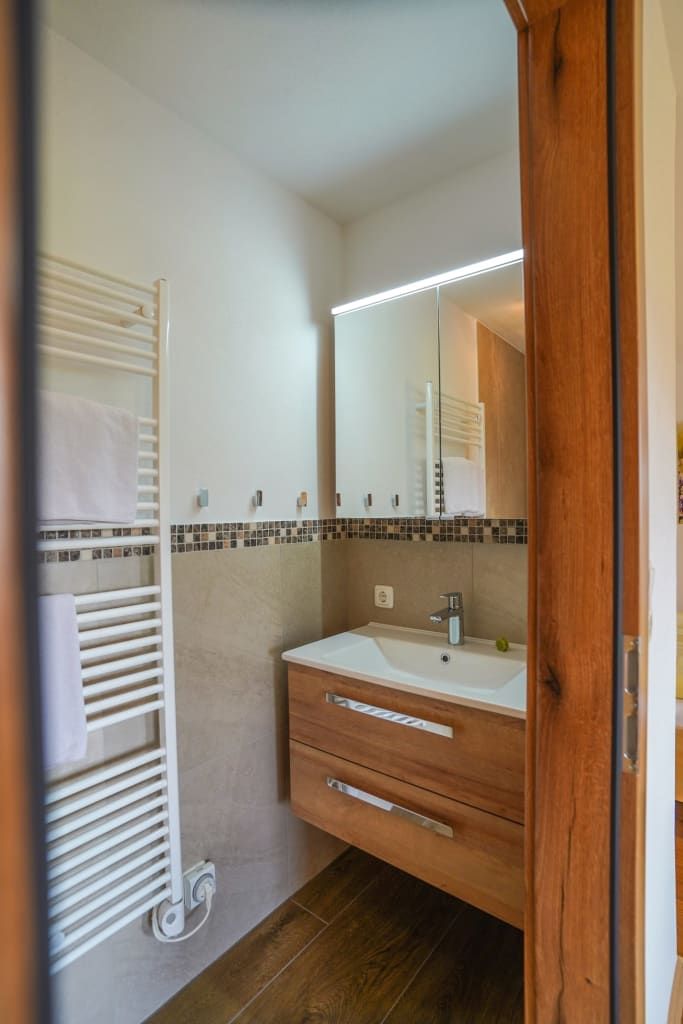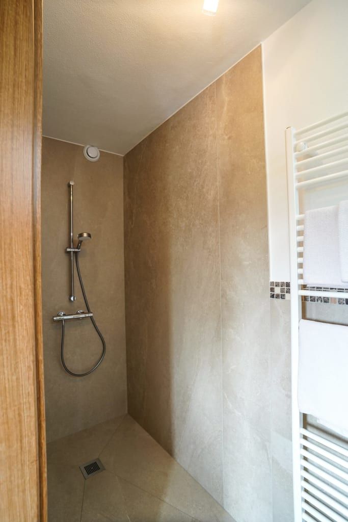 Das ebenfalls neu renovierte Badezimmer verfügt über eine große Walk-In-Dusche und ein getrenntes WC.