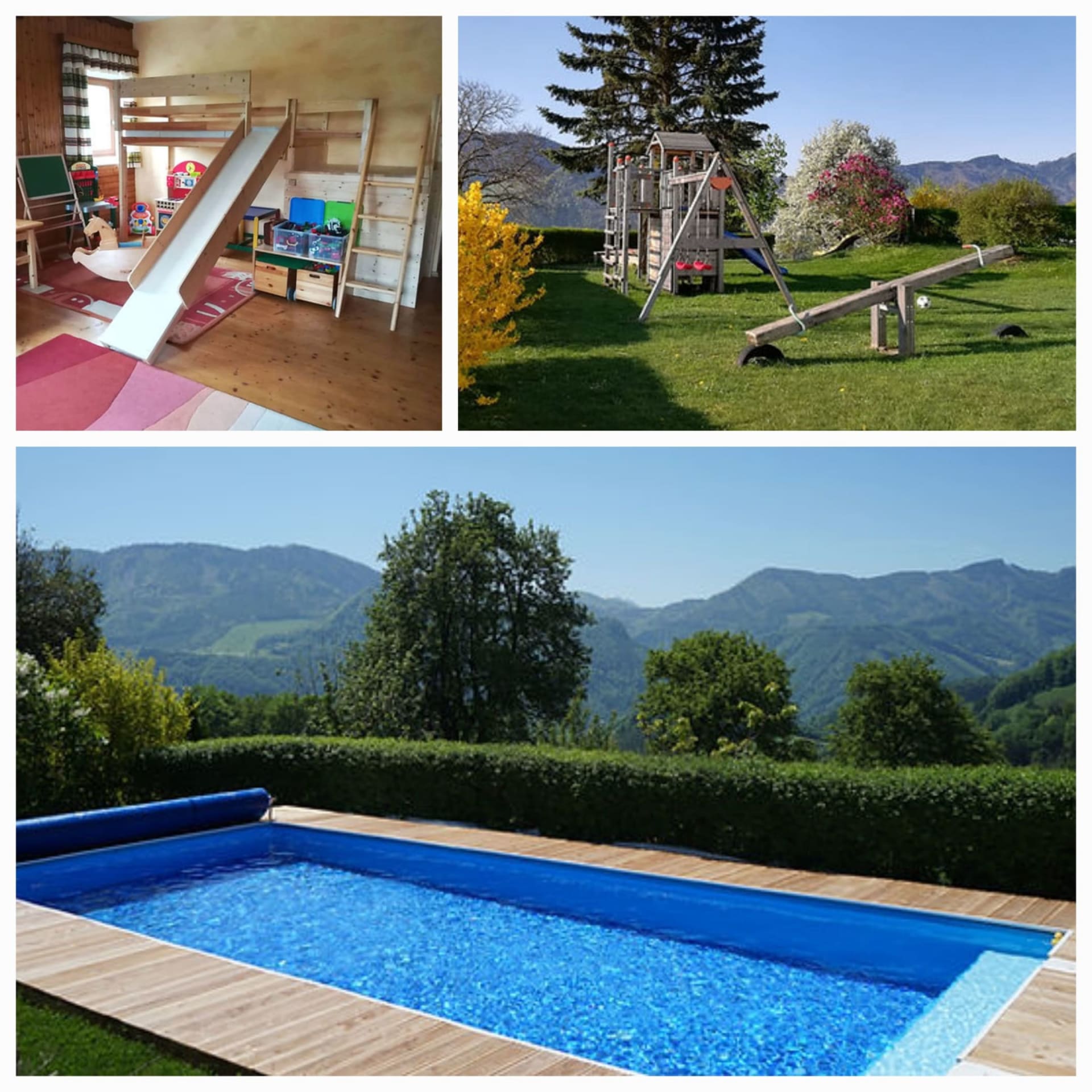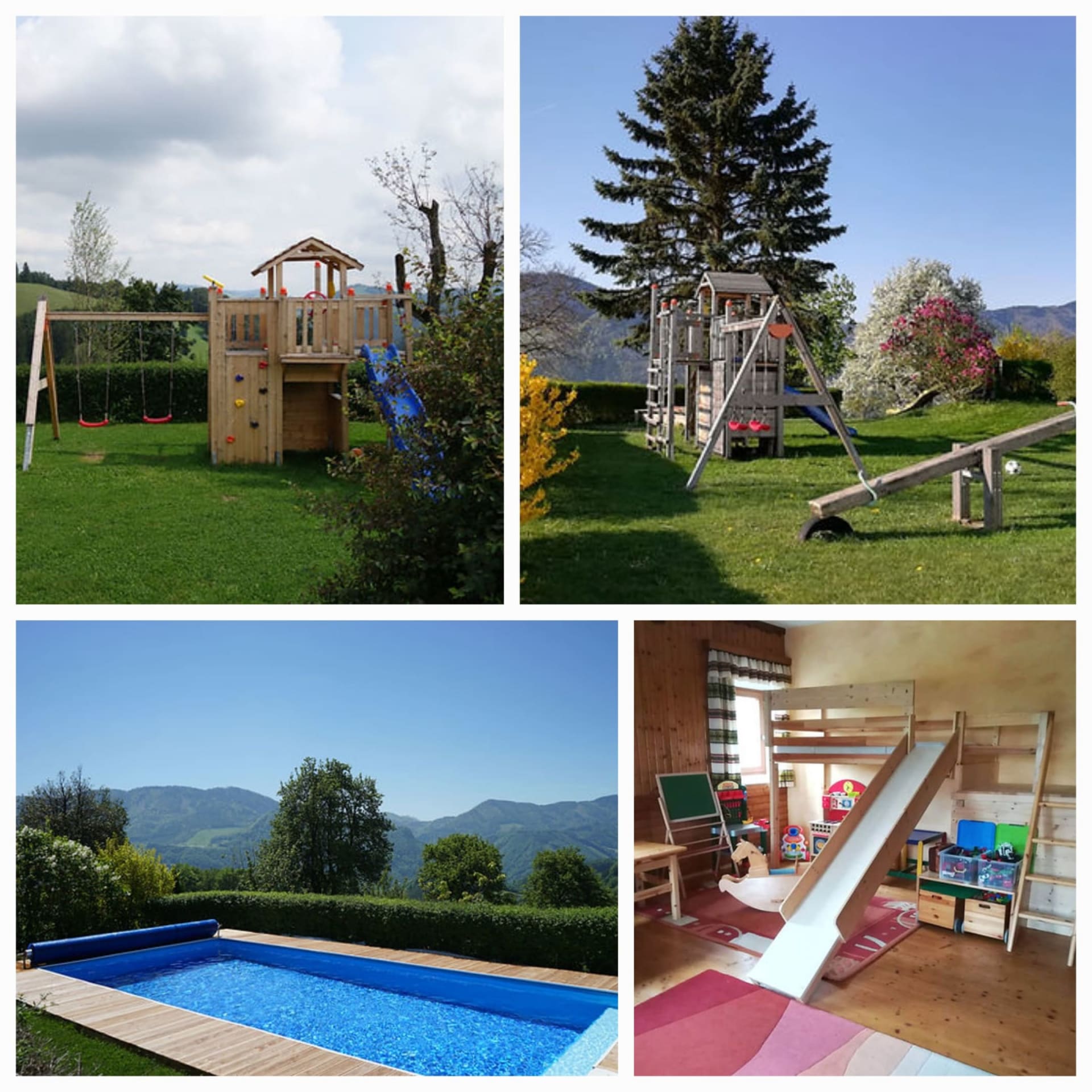 Groß & Klein sind mit dabei und packen gerne auch fleißig mit an, wenn abends unsere Milchkühe und die Kälbchen gefüttert und gemolken werden, wir unseren fleißigen Hühnern die Frühstückseier klauen oder das frische Heu die Hänge hinunterrechen. Die Häschen und Katzen freuen sich über viele Streicheleinheiten – vor allem von unseren kleinen Gästen. Zudem lassen der große Kinderspielplatz und das Spielzimmer für Schlechtwettertage keine Langeweile aufkommen.