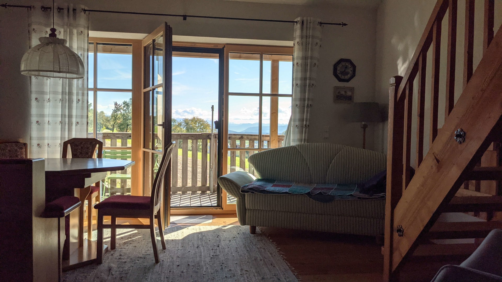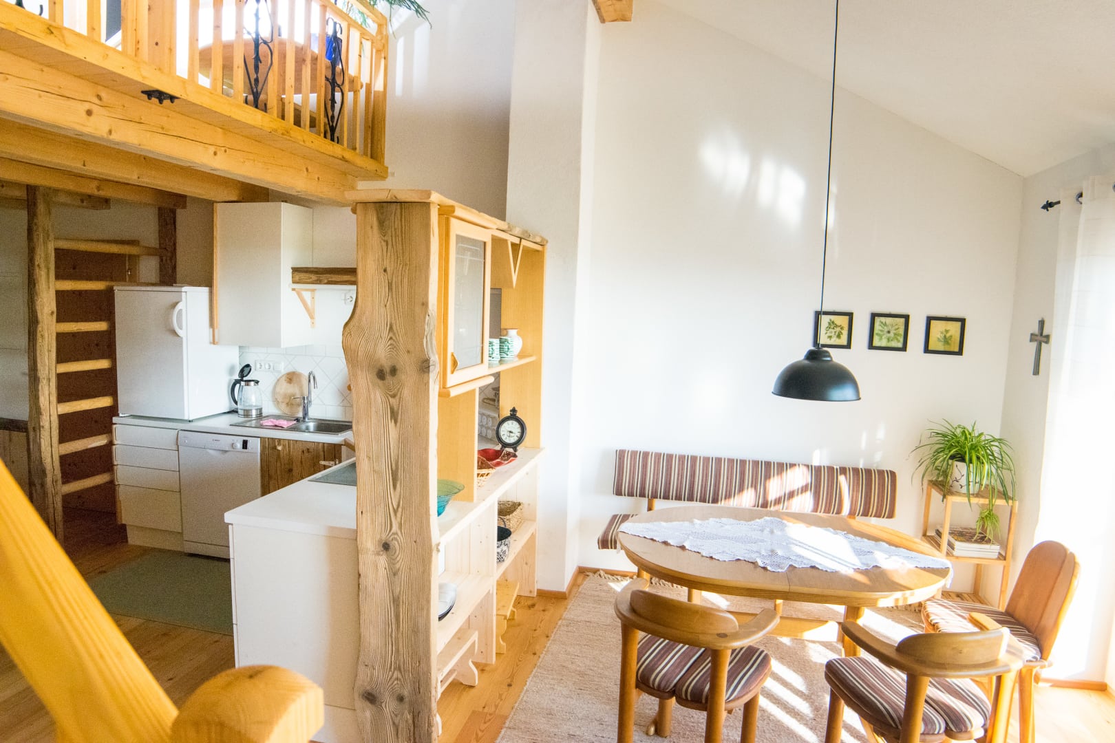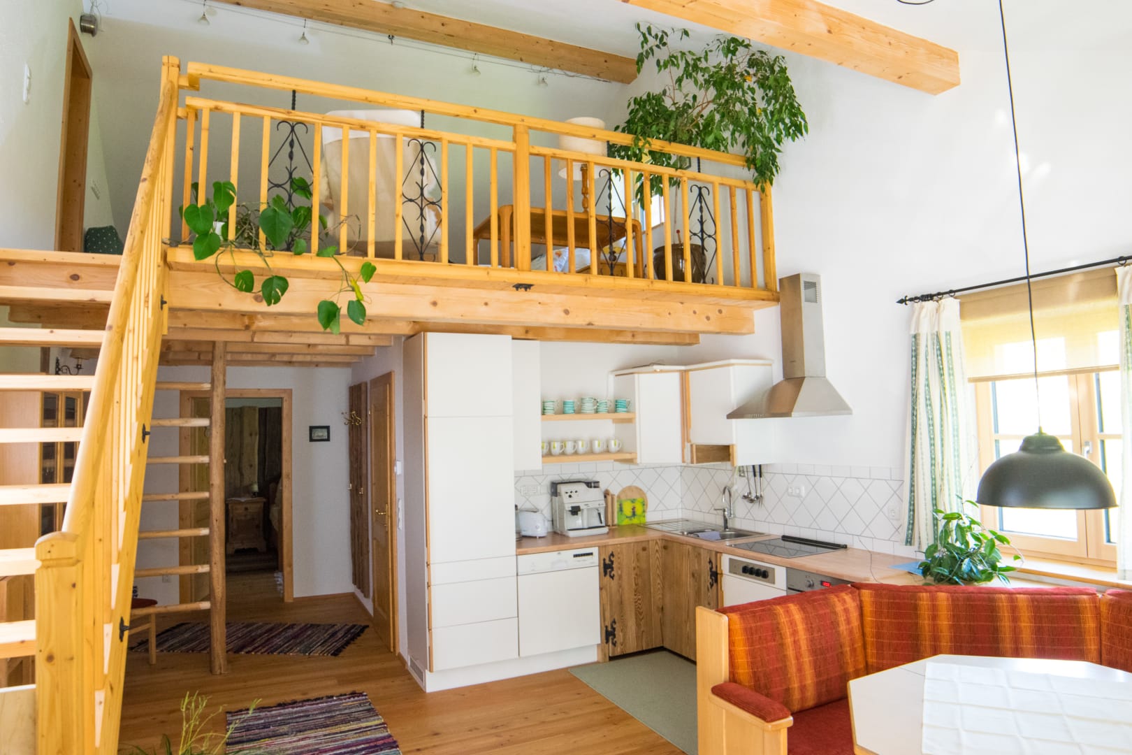 Unsere 70 m² große Wohnung liegt südseitig mit Blick auf das Höllengebirge, bei gutem Wetter sieht man bis zum Dachstein und im Westen bis in die bayrischen Berge. Die Wohnung Morgensonne ist großzügig ausgestattet. Das Schlafzimmer liegt ostseitig und durch Altholz wird der besondere Charakter des Zimmers hervorgehoben. Das zweite Schlafzimmer befindet sich in der Galerie, welche über eine Treppe vom Wohnraum aus erreichbar ist.