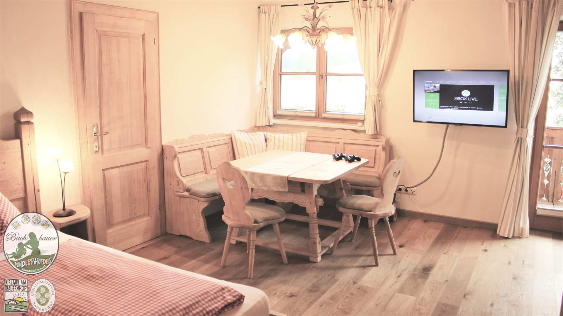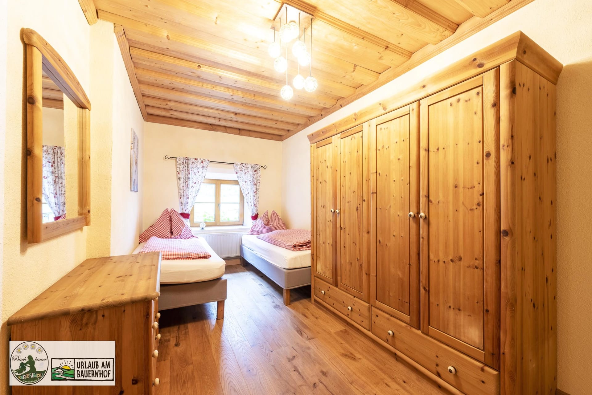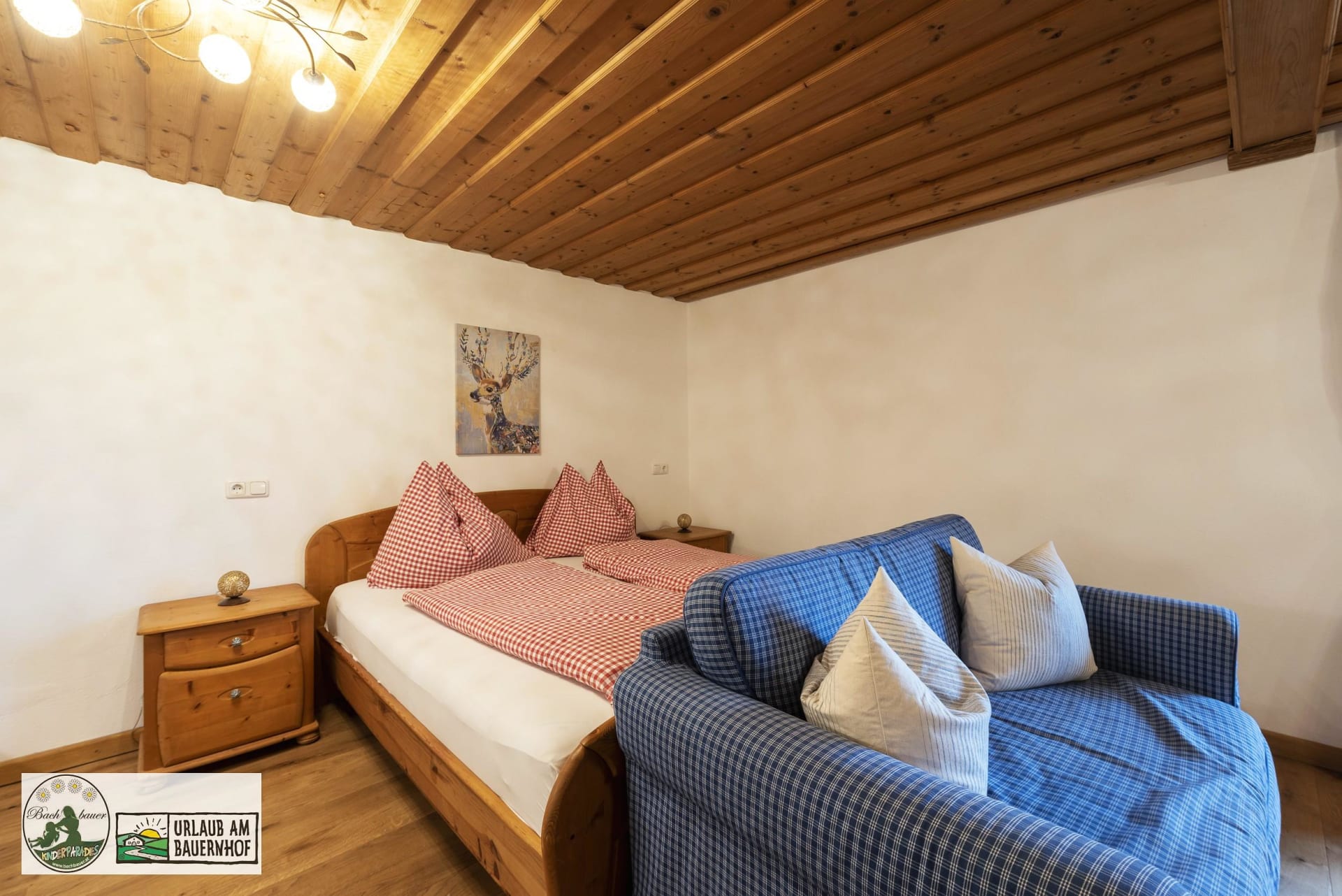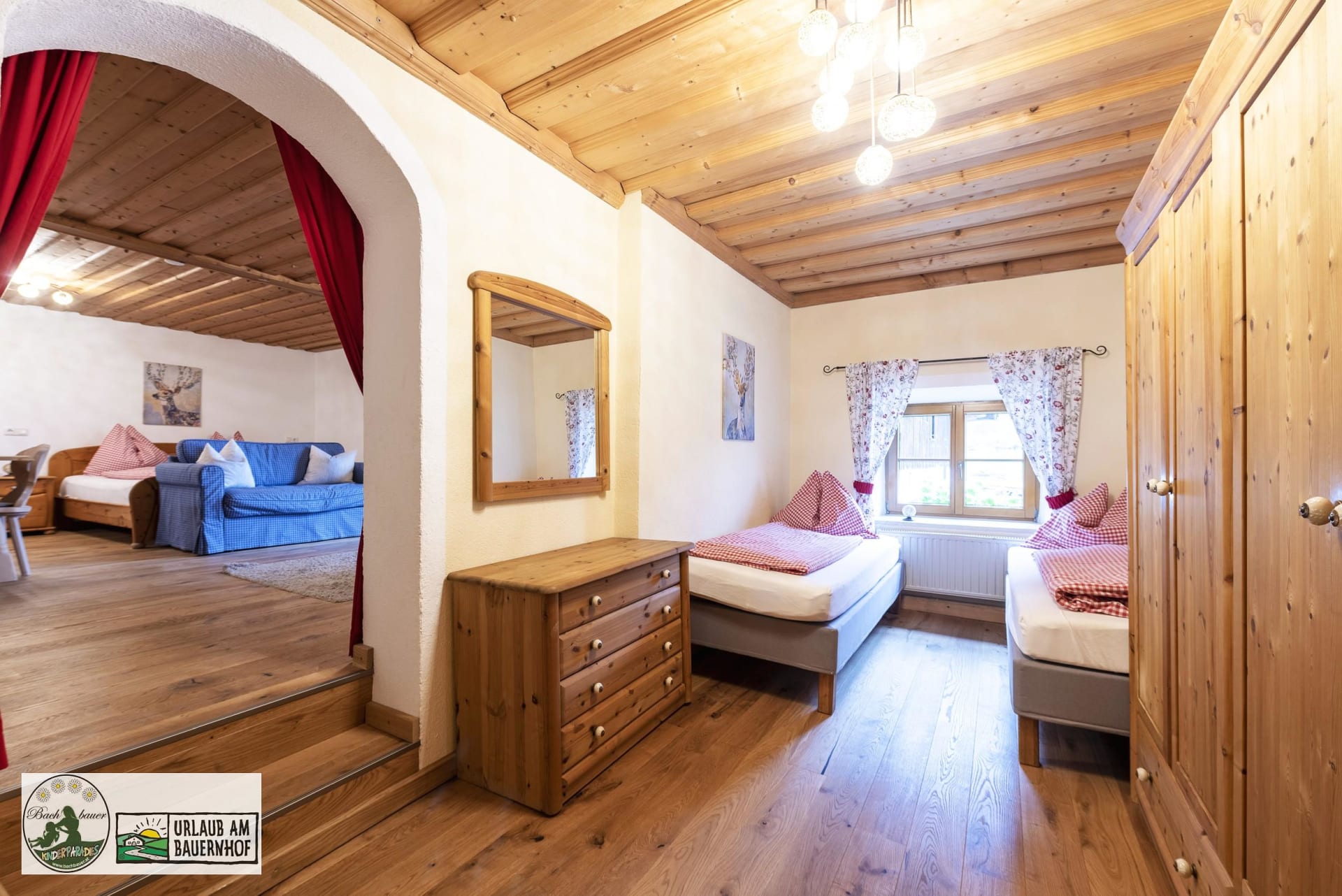 Dieses gemütliche Familienzimmer ist ca. 48 m² groß und für 1-4 Personen. Wohn-Schlaf-Zimmer mit Doppelbett. Bad/WC. Kinderzimmer mit zwei Einzelbetten (Durchgang zum Eltern-Schlaf-/Wohnraum ohne Tür). Holzböden und Vollholzmöbel. Es hat einen großen Balkon mit Aussicht auf den Hof, Kinderspielplatz und Fuhrpark teilweise einsehbar. Küche komplett eingerichtet. Sat-TV