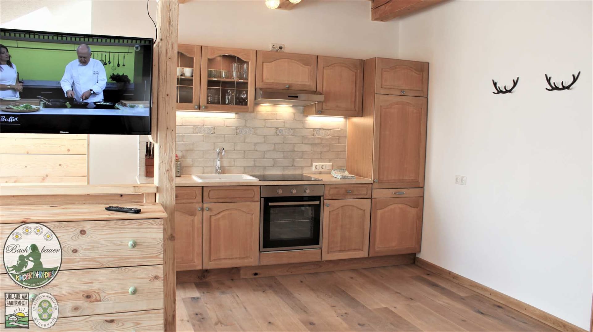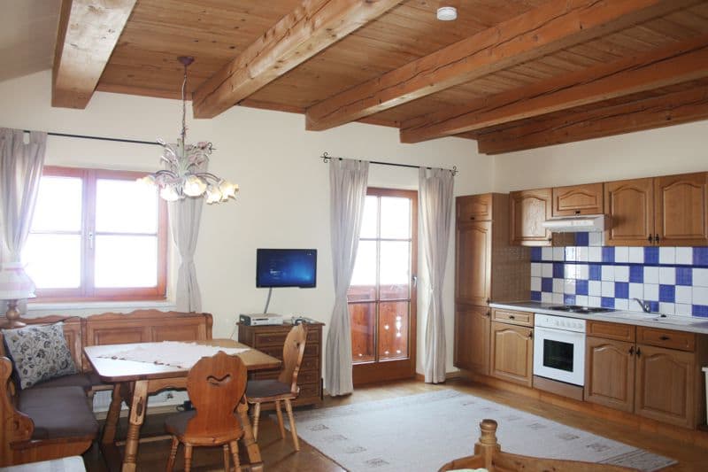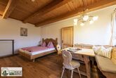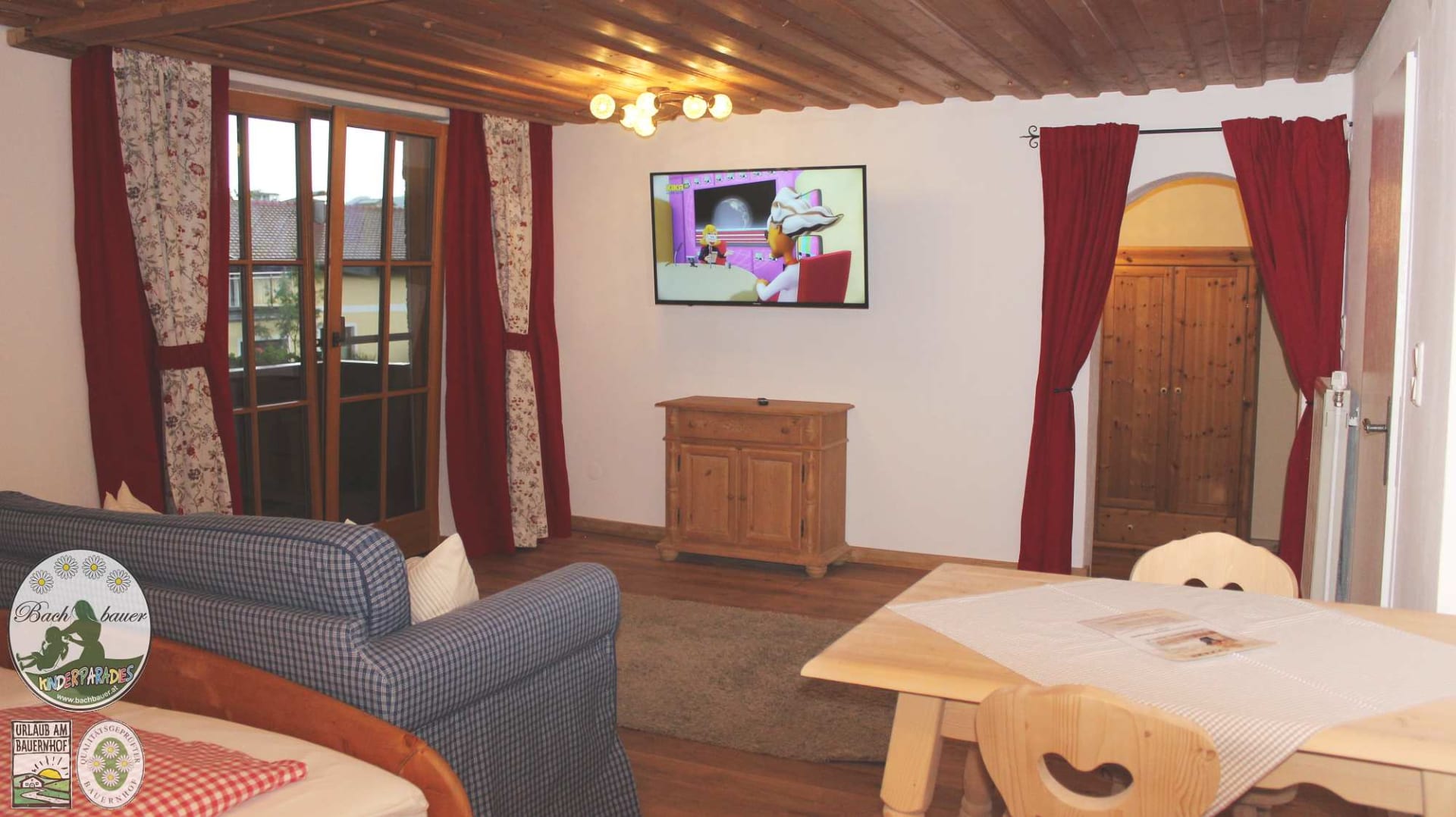 Die Ferienwohnung hat einen großen Balkon mit schöner Aussicht auf die Berge, Spielplatz und Garten. Küche komplett eingerichtet. Separates Schlafzimmer mit 2 Einzelbetten und Platz für Gitterbett sowie Wohn-Schlaf-Zimmer mit Doppelbett für die Eltern.
