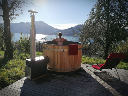 Die Küche mit Geschirrspüler, Gefrier-Kühlschrankkombination, Herd mit Backofen, Sodastream und einem Kaffeevollautomat verfügt über eine Topausstattung. Auf der eigenen Holzterrasse mit Liegestühlen, Gartenmöbeln, einem Badefass (Nutzung gegen Aufpreis) und Griller bietet sich ein wunderbarer Blick auf See und Obstgarten.