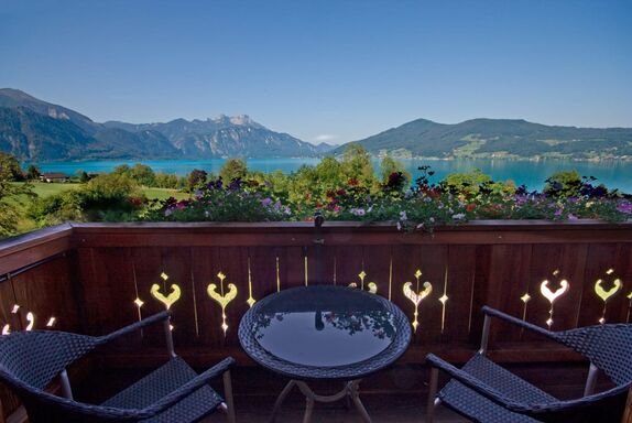 Diese gemütliche Ferienwohnung befindet sich im 2. Stock. Vom eigenen Balkon hat man den besten Ausblick auf den See und die Berge. Und dabei das Frühstück genießen... Herrlich! Die schöne Einrichtung mit viel Holz vermittelt Bodenständigkeit und Wärme.