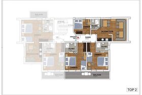 Appartement Top 2 mit 2 Doppelzimmern und 1 Zimmer mit franz. Bett (1,60 m) mit jeweils 1 Badezimmer mit Dusche/WC; Vorraum, komplett eingerichteter Wohnküche mit Essecke, Cerankochfeld, Backrohr, Mikrowelle, Kühlschrank, Geschirrspüler, Toaster, Wasserkocher, uvm. - sie bietet für alle Bewohner genügend Platz zum gemeinsamen Kochen und verweilen. Größe ca. 84 m².