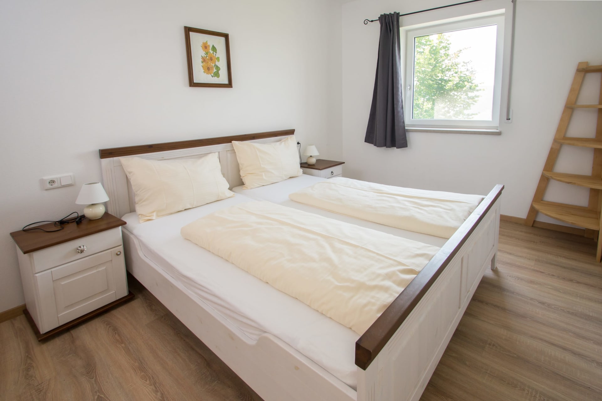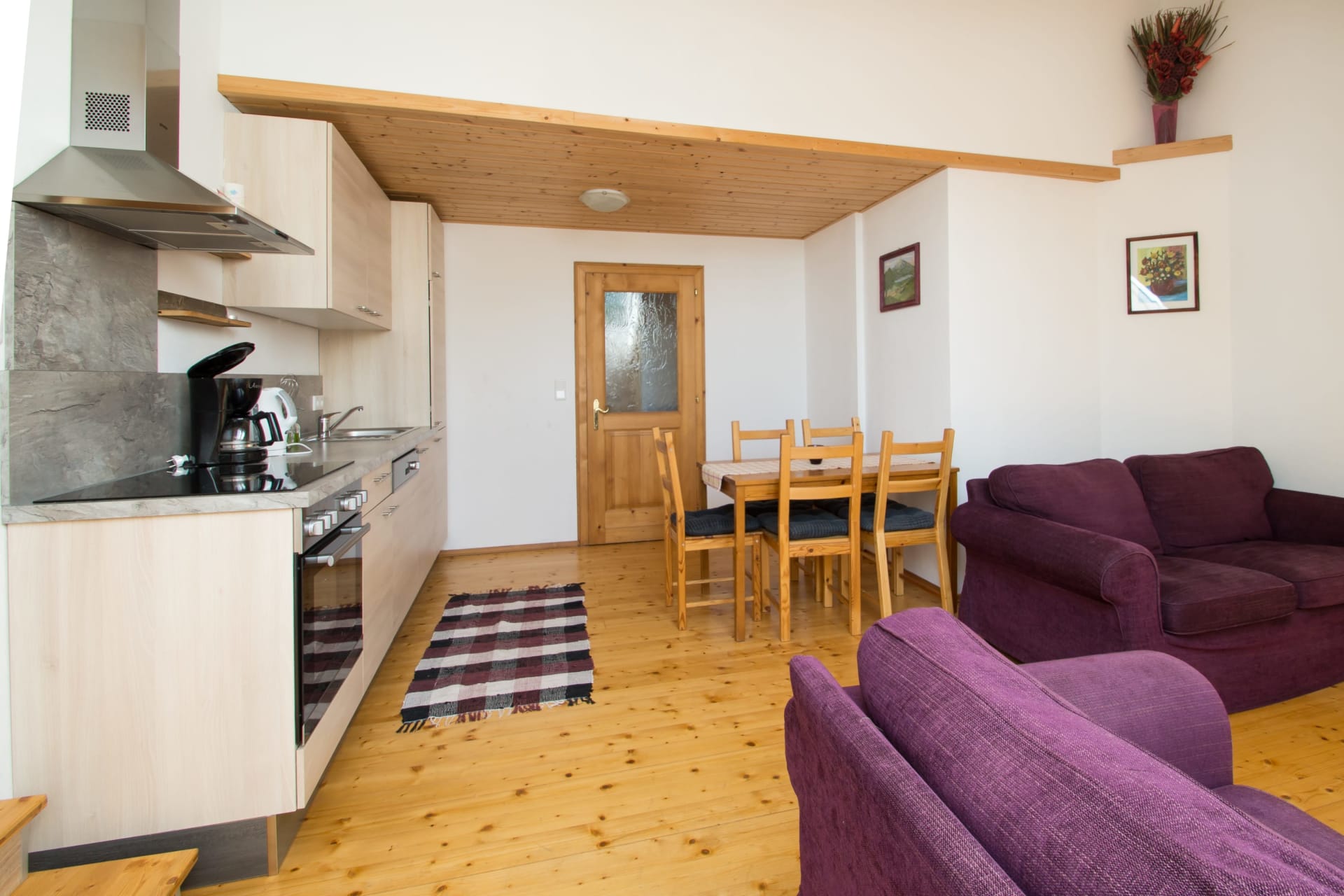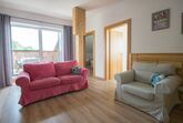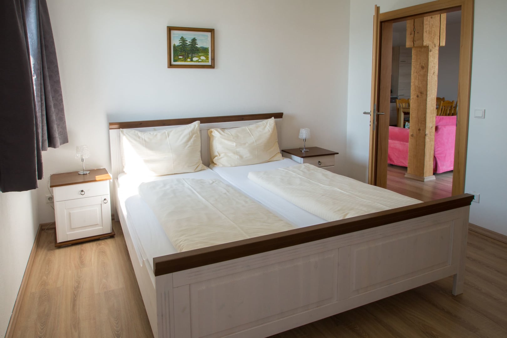 Ferienwohnung mit barrierefreier Ausstattung! Hierbei handelt es sich um die Ferienwohnung Rosa Kolomandl. Diese Wohnung besteht aus Wohnküche, zwei Schlafzimmern, Bad mit WC und Terrasse. Die Terrasse ist uneinsehbar und von den Schlafzimmern aus hat man Seeblick.
