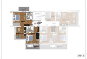Top 1 bestehend aus: 2 Doppelzimmern, 1 Badezimmer mit Dusche/WC, 1 Badezimmer mit Dusche, separates WC, Sat-TV, Radio, Balkon, Vorraum, voll ausgestattete Wohnküche mit Sofa und Essecke, Geschirrspüler, Mikrowelle, Cerankochfeld, Kaffeemaschine, Kühlschrank, Speisse- und Kochgeschirr. Größe ca. 59 m²