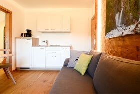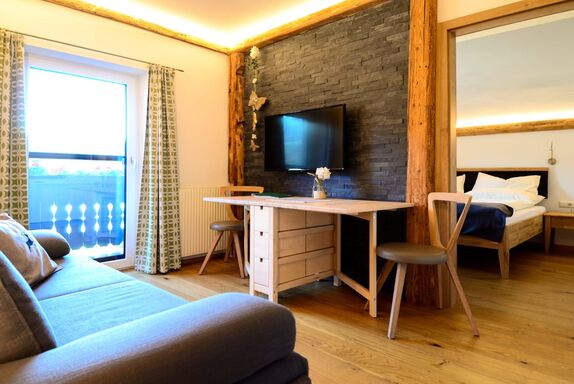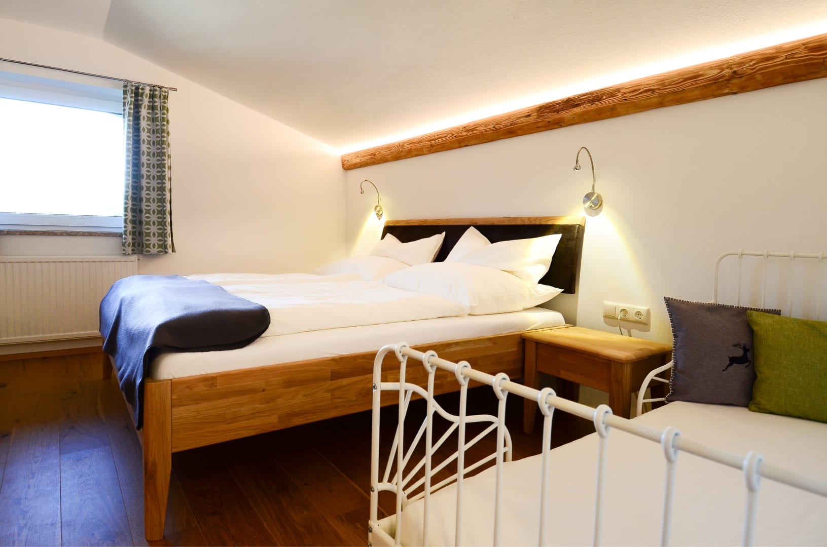 Unsere Ferienwohnung besteht aus 1 Schlafraum, 1 Wohn-Schlafraum, Kochnische, Vorraum, Dusche, WC, Balkon. Ein 2. Schlafzimmer kann dazugemietet werden (befindet sich neben der Ferienwohnung). Vom Balkon aus genießen Sie den Blick auf die Osterhorngruppe.