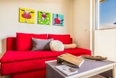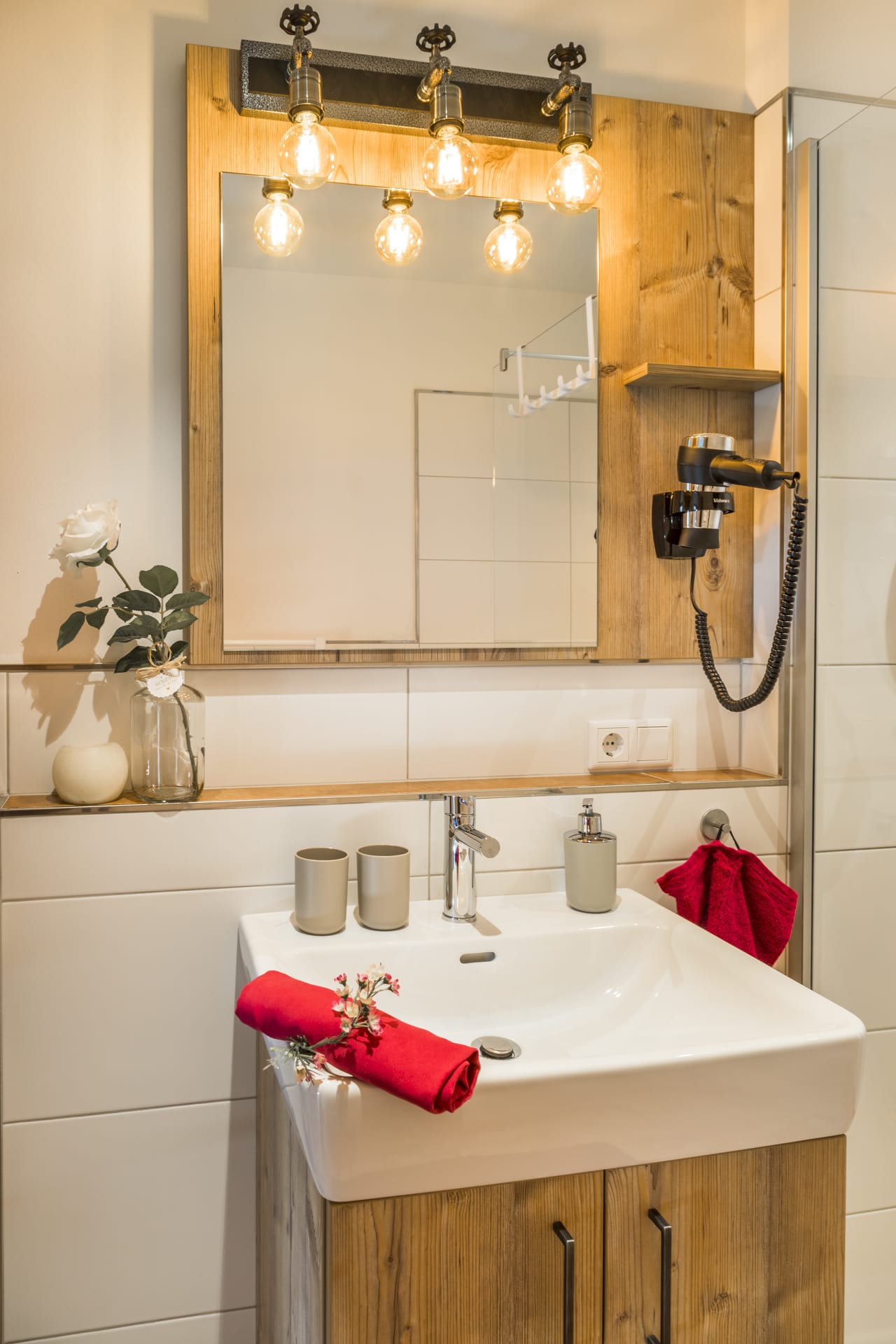 Auf 50 m² bietet die hell und freundliche Ferienwohnung Familienglück jeglichen Komfort auf höchstem Niveau. Die Ferienwohnung besteht aus einem Schlafzimmer mit Doppelbett, einem Wohnzimmer mit integrierter, voll ausgestatteter Küche mit Ceranfeld, Backofen, Kühlschrank mit Gefrierfach und verfügt über eine (wirklich) sehr komfortable Schlafcouch (1,60 breit und 2m lang) für zwei Personen. Das Badezimmer mit Dusche, Handtuchtrockner und Haarföhn. Ein separates WC und einen Vorraum. Die Ferienwohnung befindet sich im ersten Obergeschoss und verfügt über einen Balkon. Überall angenehme Fußbodenheizung.