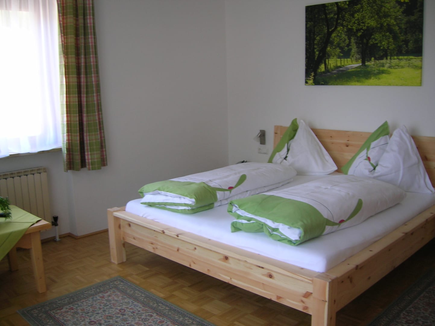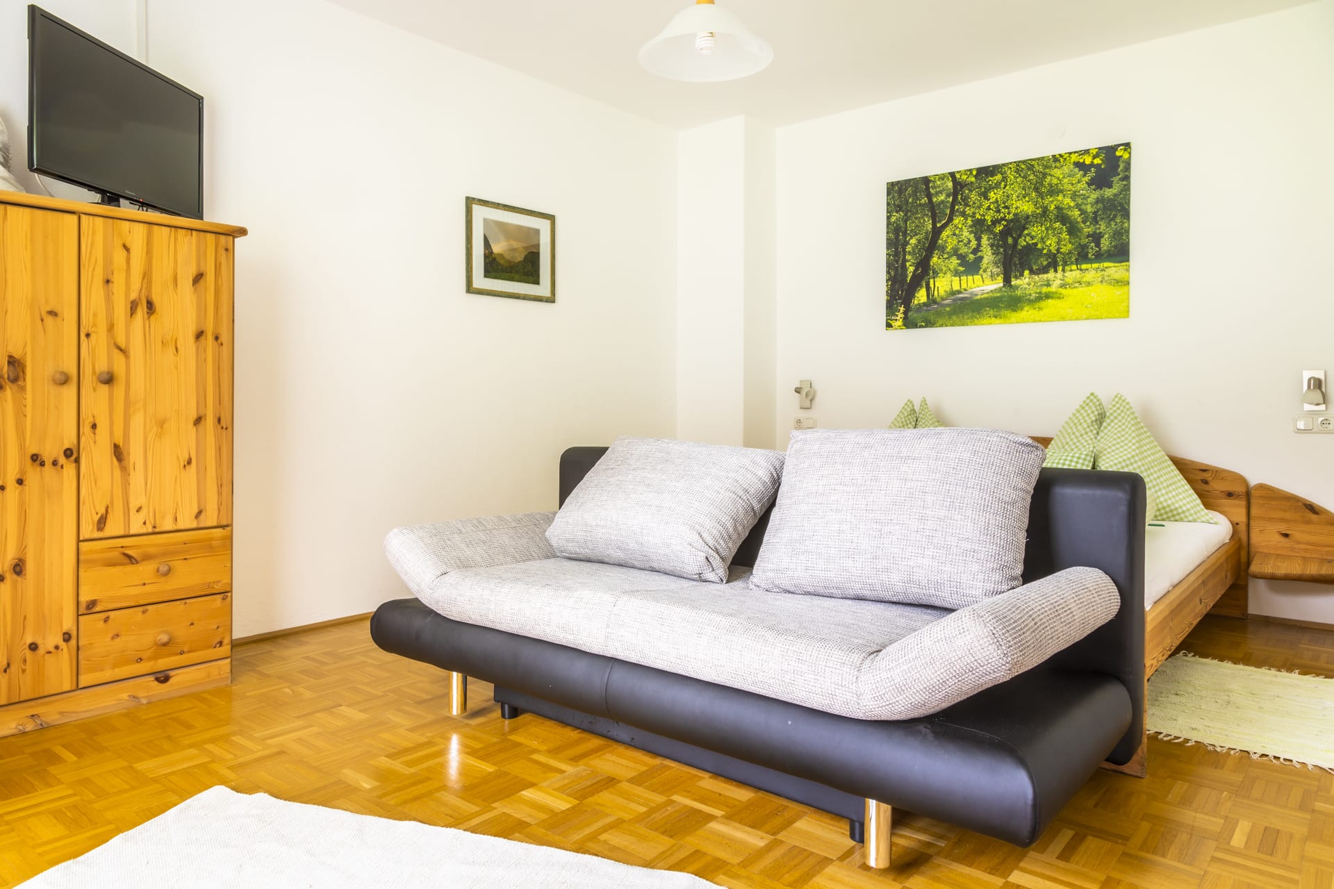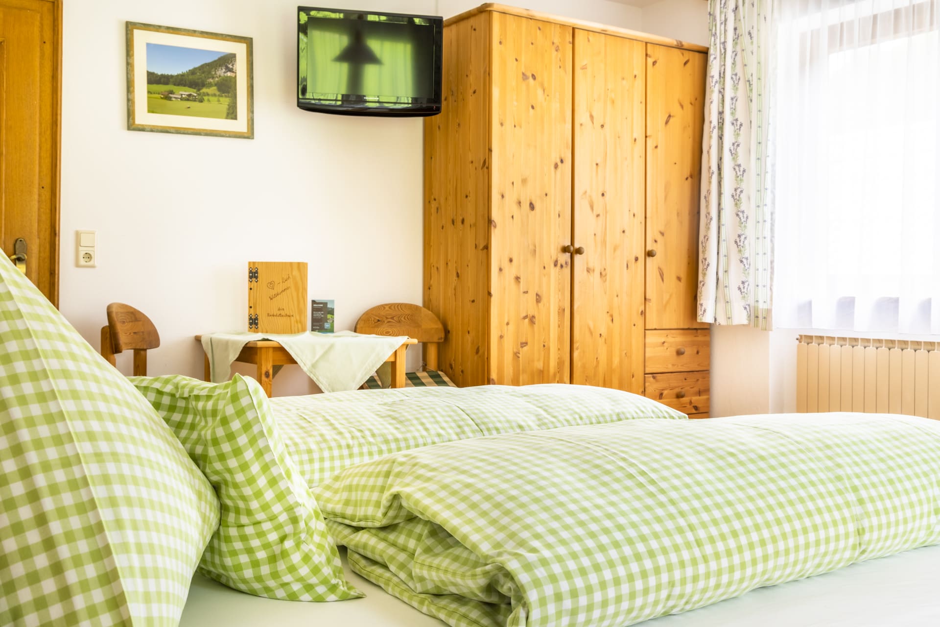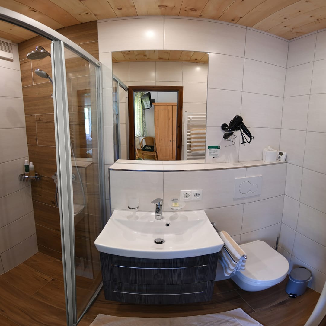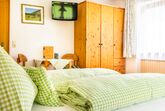 Das Familienzimmer verfügt über zwei getrennte Schlafräume – ideal für Eltern mit Kindern. Mit Vollholzmöbeln und Parkettboden eingerichtet, strahlt es eine warme und behagliche Atmosphäre aus. Zur Ausstattung gehören Dusche, WC, zwei Sat-TVs sowie ein Balkon, auf dem ihr den Blick in die Natur genießen könnt.