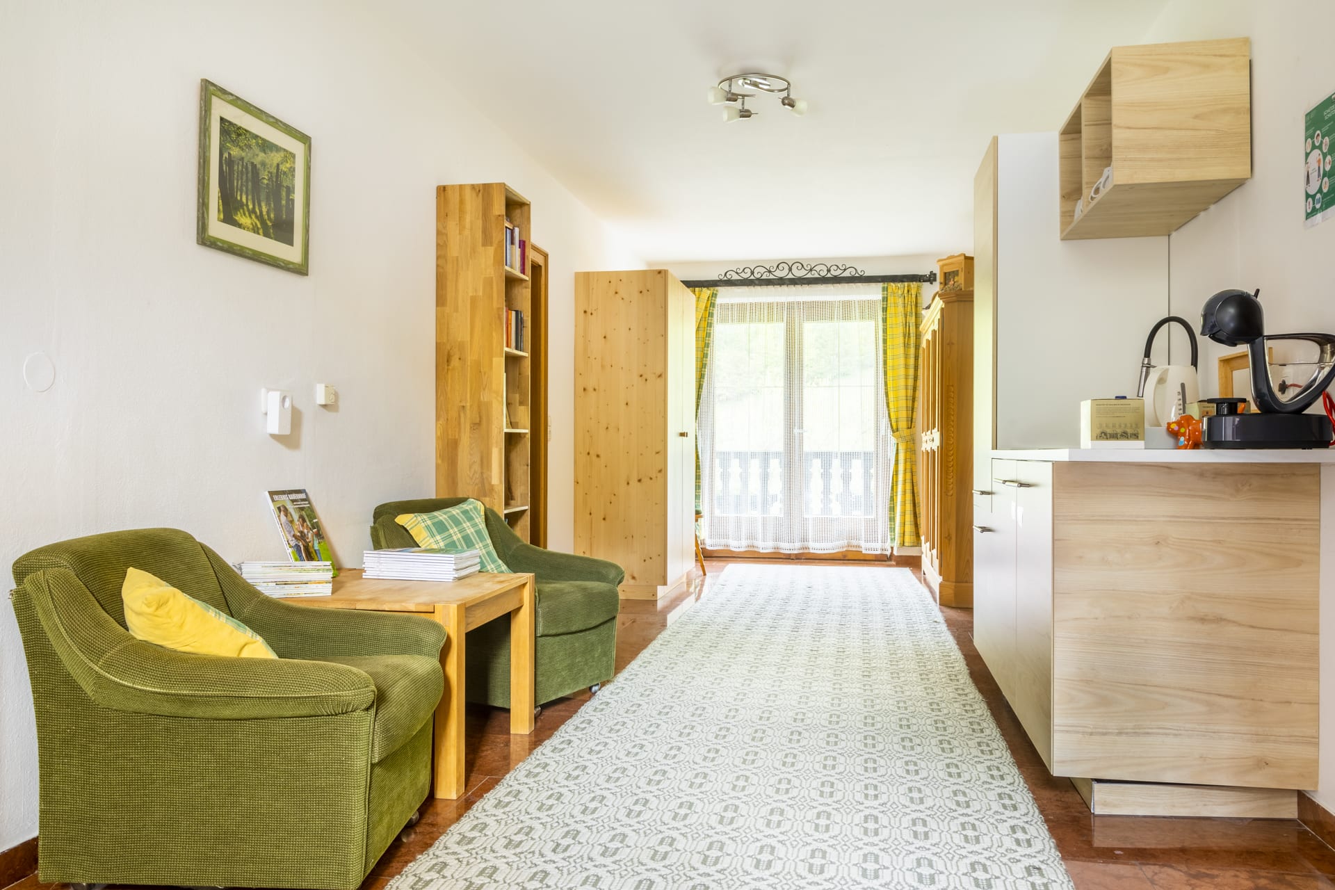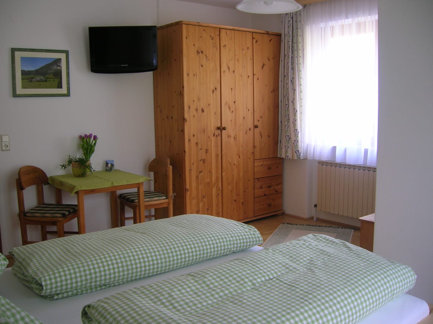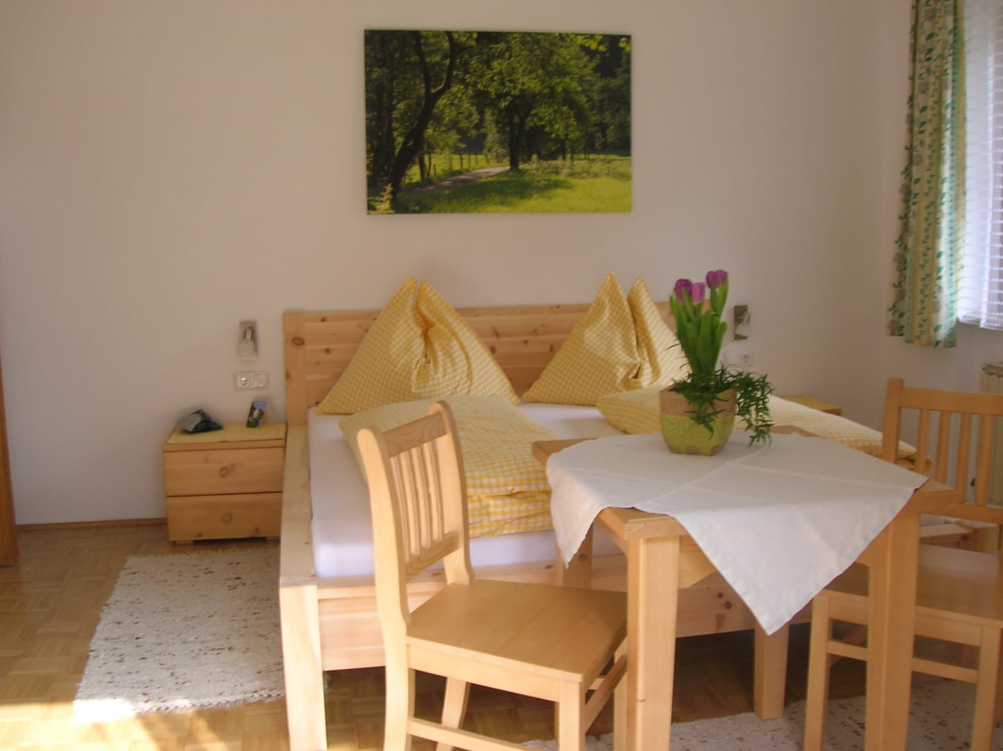 Das Familienzimmer verfügt über zwei getrennte Schlafräume – ideal für Eltern mit Kindern. Mit Vollholzmöbeln und Parkettboden eingerichtet, strahlt es eine warme und behagliche Atmosphäre aus. Zur Ausstattung gehören Dusche, WC, zwei Sat-TVs sowie ein Balkon, auf dem ihr den Blick in die Natur genießen könnt.