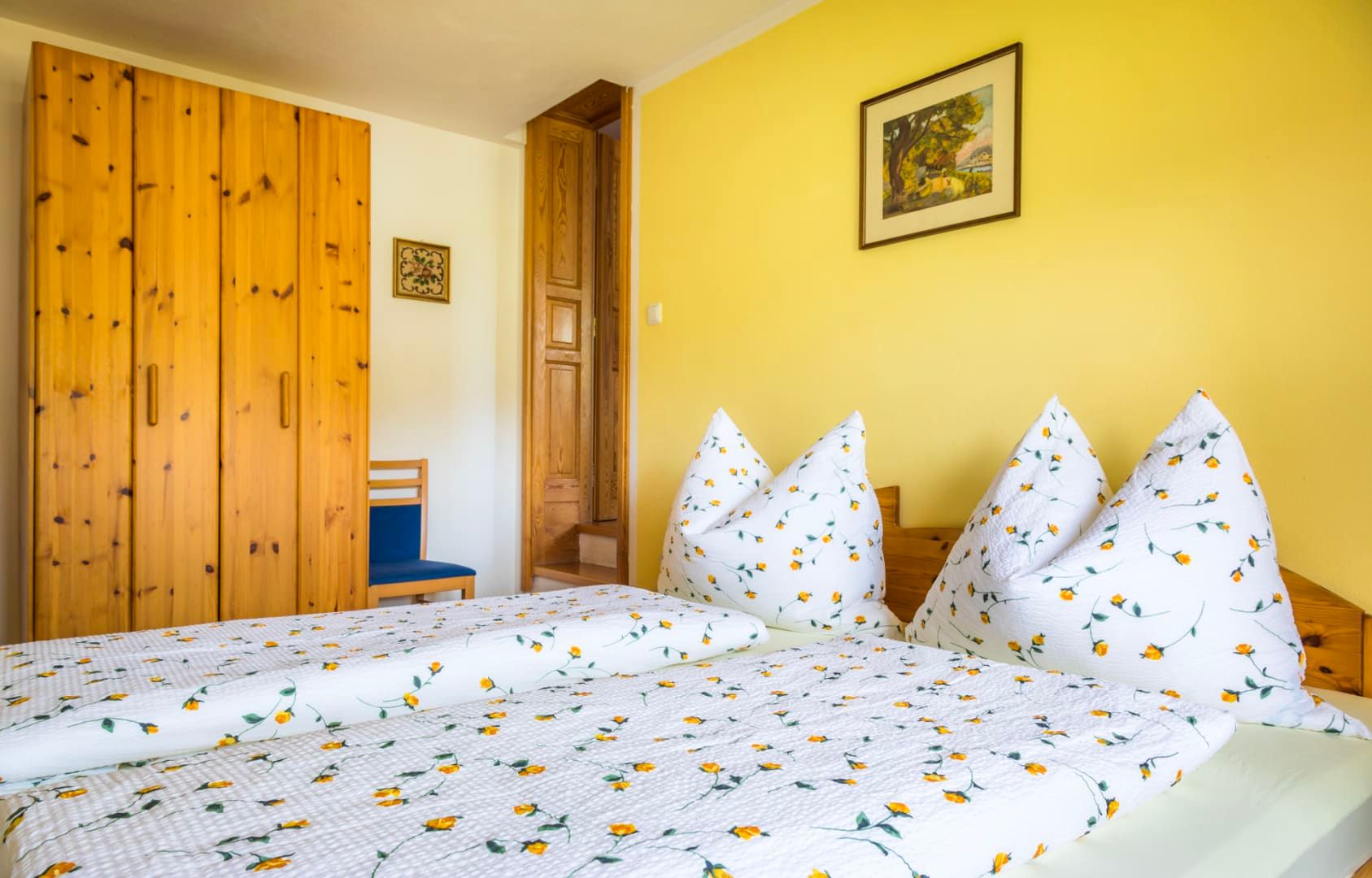 Ebenfalls im 1. Stock auf 56 m², freundlich und hell mit Blick auf die Berge. Mit Holzmöbeln ausgestattet, zwei durch eine Zwischentür getrennte Schlafzimmer, komplett eingerichtete Küche sowie Badezimmer mit Dusche/WC. Bettwäsche und Handtücher inklusive.