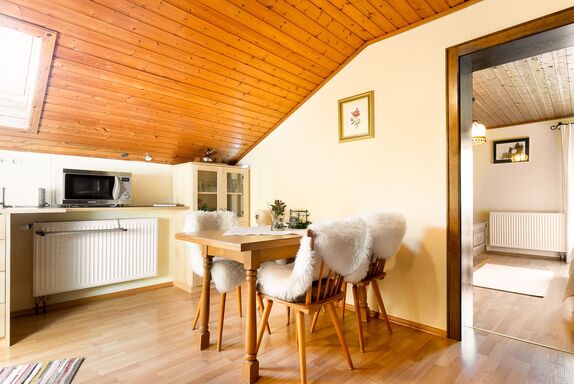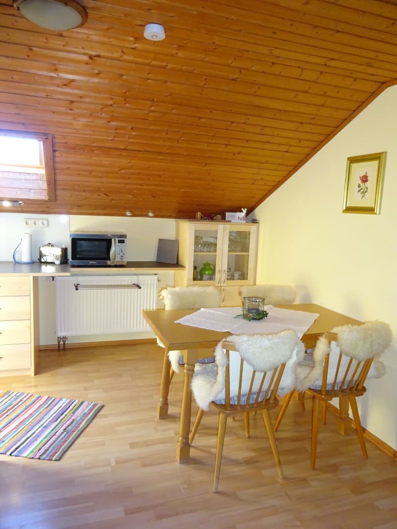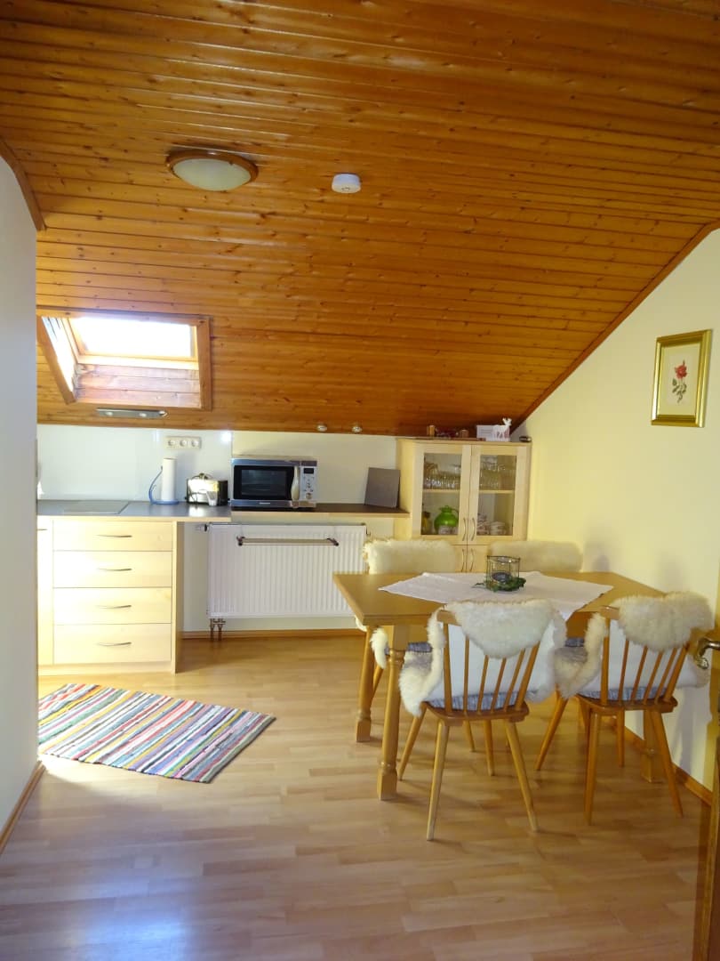 Die Ferienwohnung im Dachgeschoss bietet einen herrlichen Ausblick und ist perfekt für Paare oder Familien geeignet. Genieße dein Frühstück mit Morgensonne und plane direkt von hier aus deine nächste Wanderung.