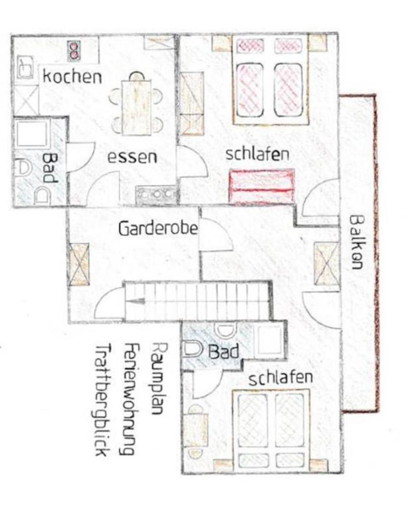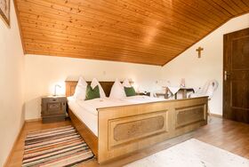 Unsere 60 m² große ruhige südseitige Ferienwohnung setzt sich aus einem Vorraum, zwei Schlafzimmer, zwei Duschen mit WC, eine Wohnküche und Balkon zusammen. Sie befindet sich abgeschlossen im Dachgeschoß unseres Hauses.