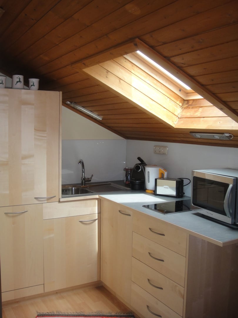 Die sehr gut ausgestattete Holzküche verfügt über einen Geschirrspüler, eine Mikrowelle mit Grillfunktion, zwei Herdplatten, ein Kühlschrank mit Gefrierfach, Wasserkocher, eine Nespresso-Maschine, sowie alles Notwendige wie Geschirrtücher, Küchenrolle, Zucker, Salz und Pfeffer, Essig und Öl usw.