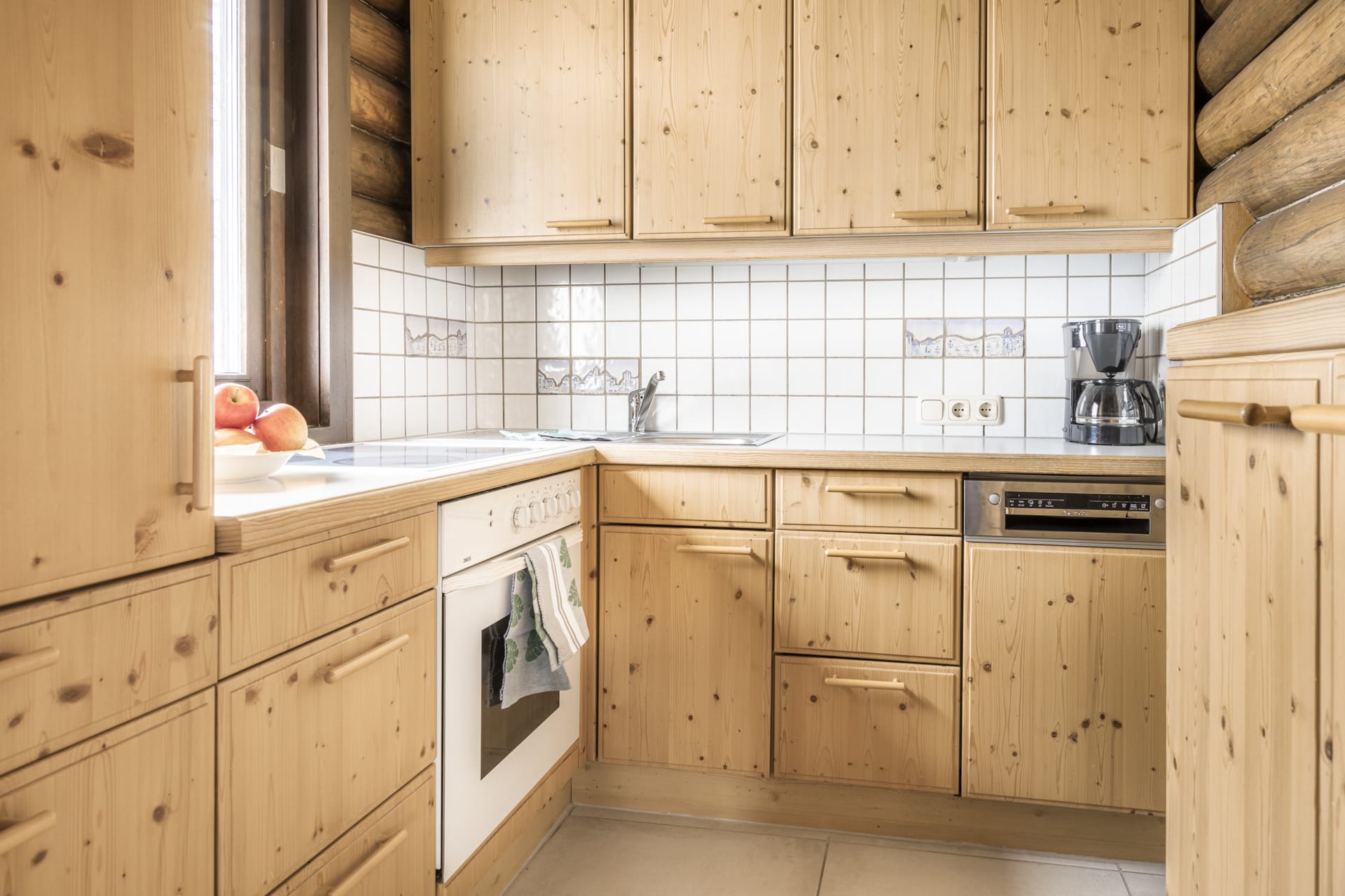 Die voll ausgestattete Küche lässt keine Wünsche offen: 4-Platten-Herd, Backofen, Kühlschrank mit Gefrierfach, Spülmaschine, Wasserkocher, Kaffeemaschine, Geschirr, Besteck und Kochutensilien – alles da, um gemeinsam zu kochen.