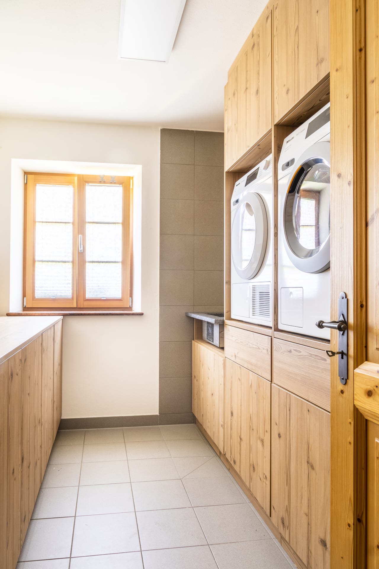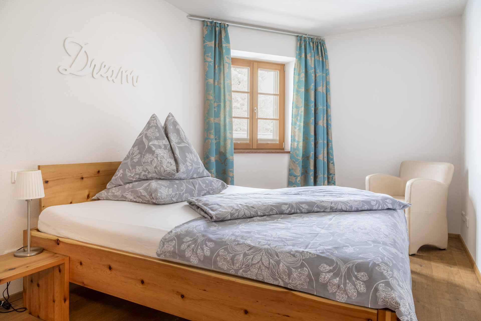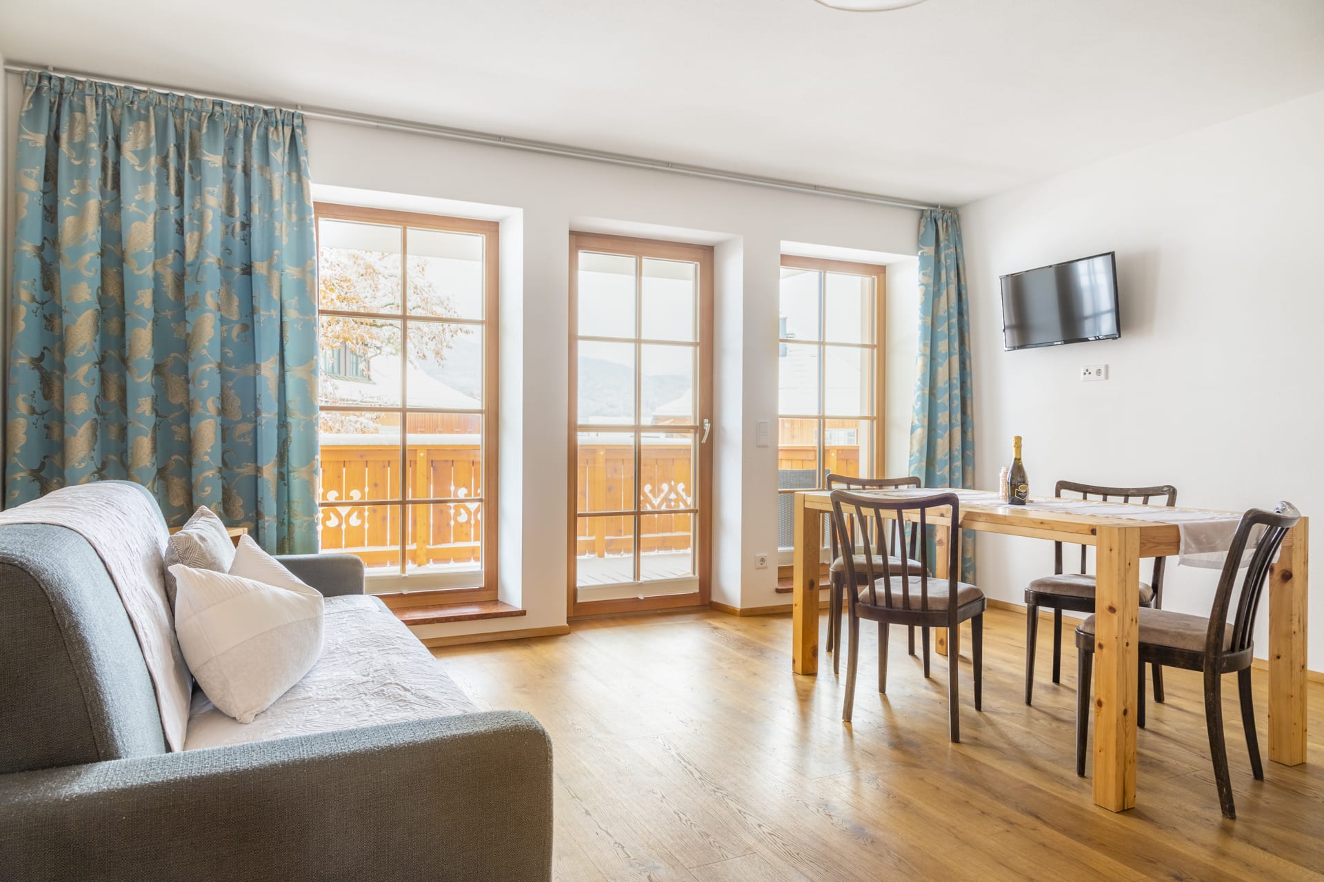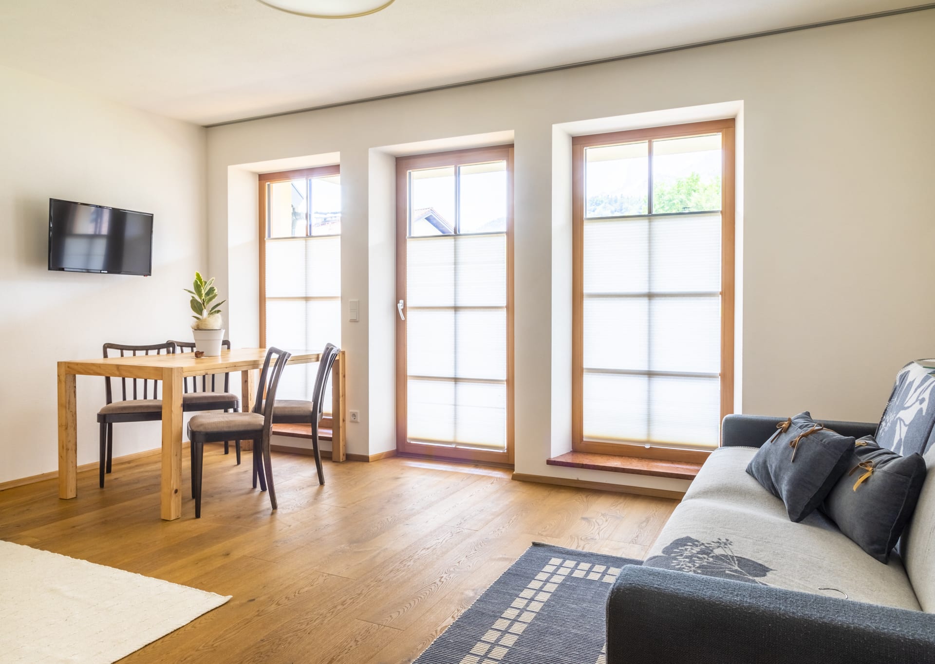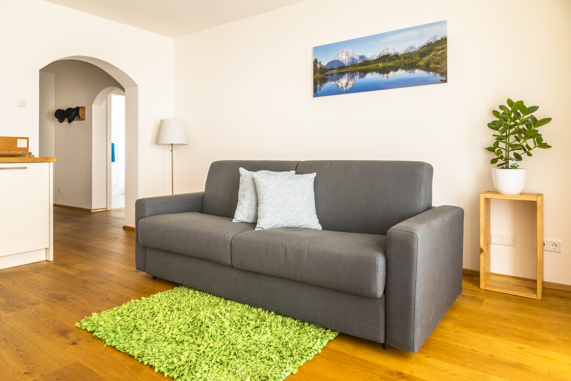 Die individuell eingerichteten Ferienwohnung bietet eine vollausgestattete Küche, einen Wohn-/Essbereich mit bequemer, italienischer Schlafcouch und ein Schlafzimmer mit Zirbenholzmöbeln.
