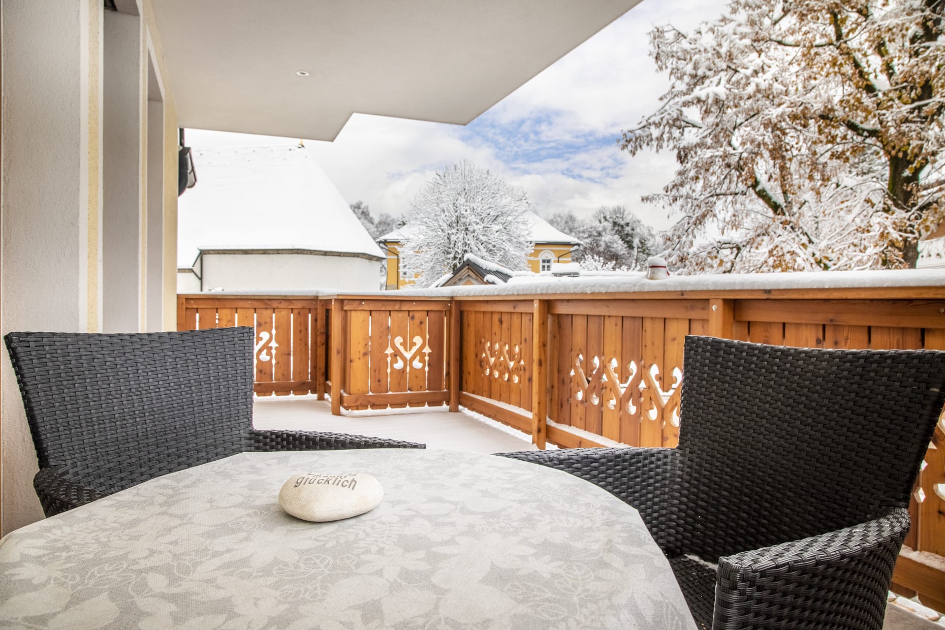 Am großem Balkon mit Sitzgelegenheit genießen Sie einen wunderbaren Ausblick auf die umliegende Bergwelt.