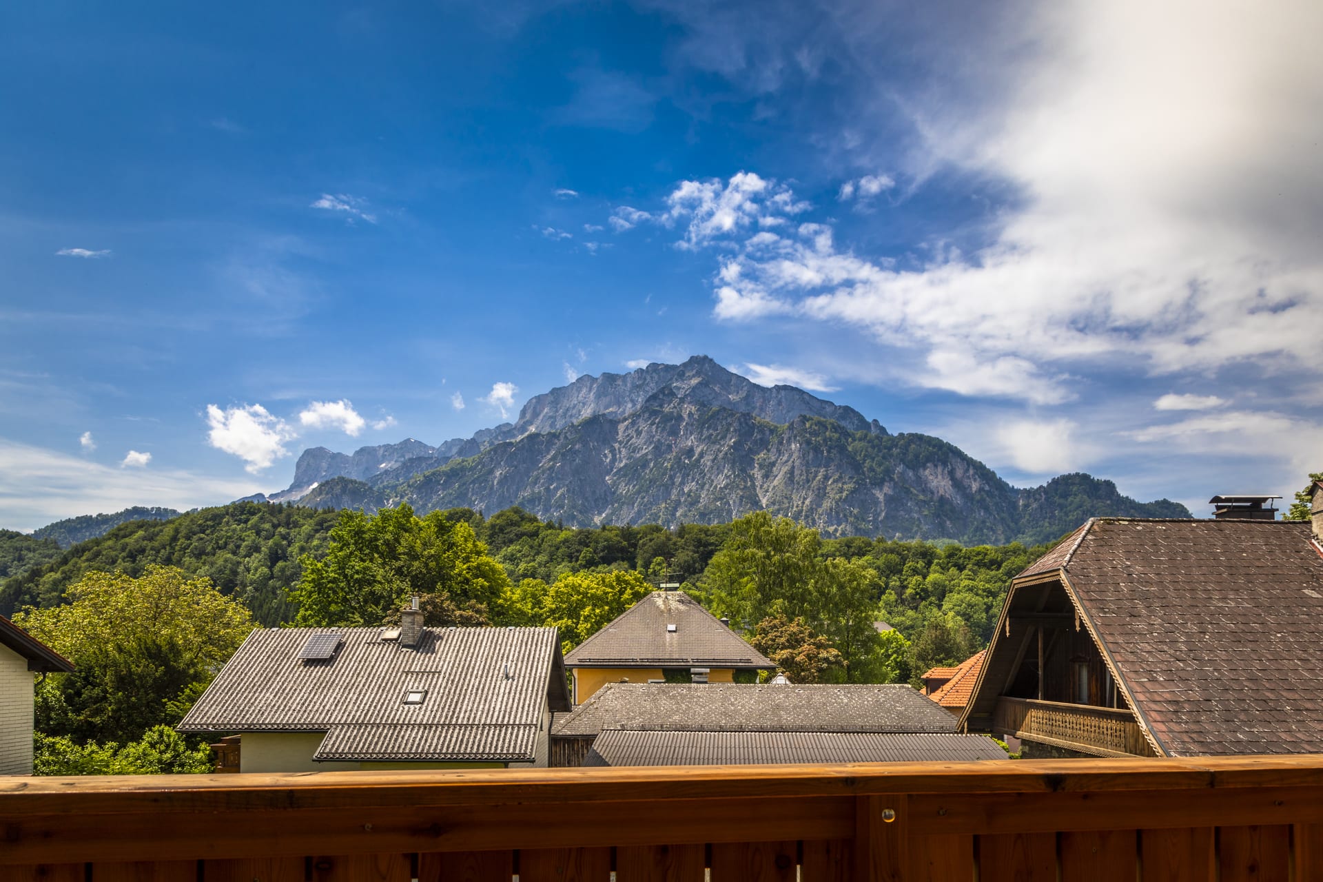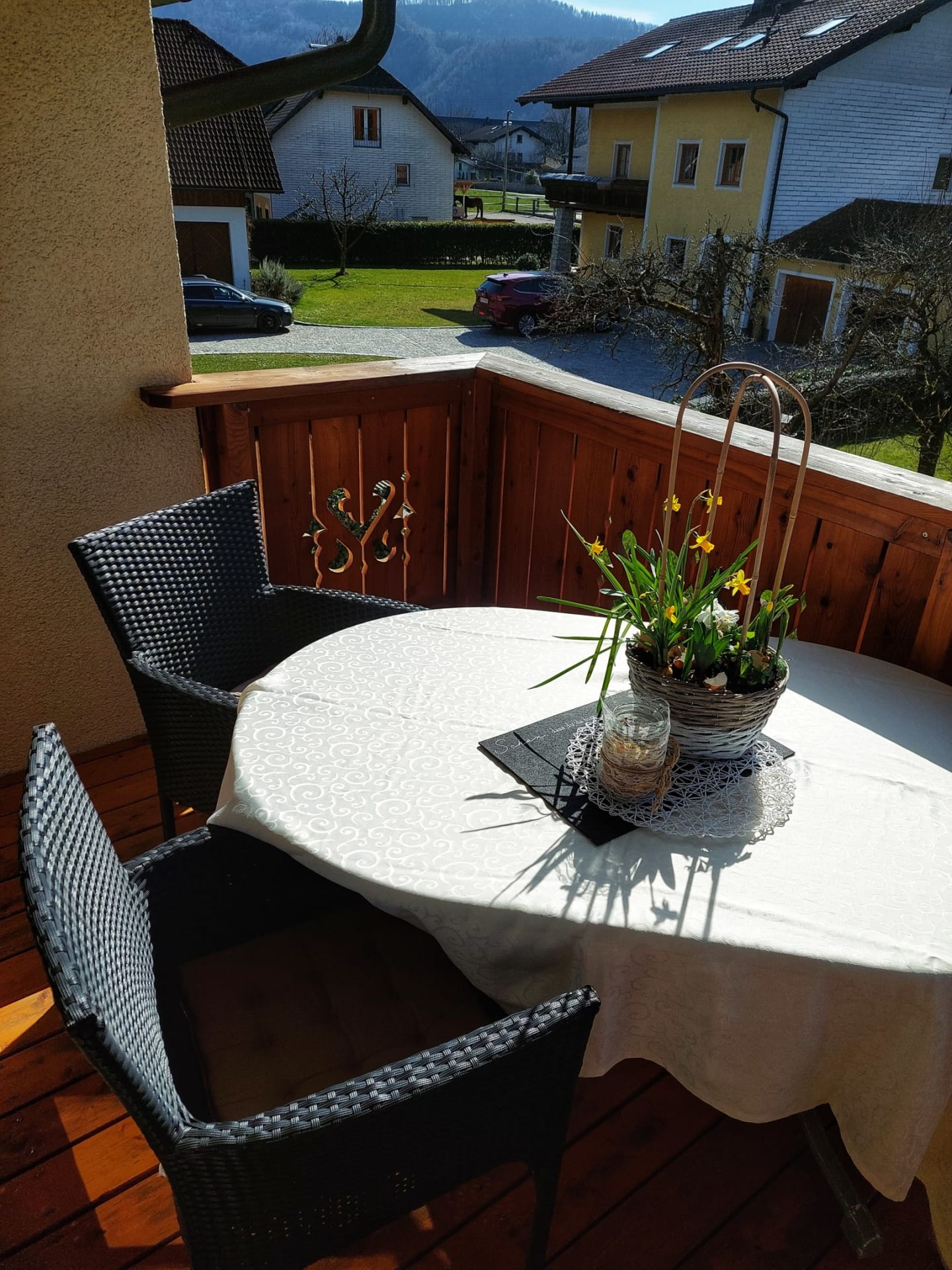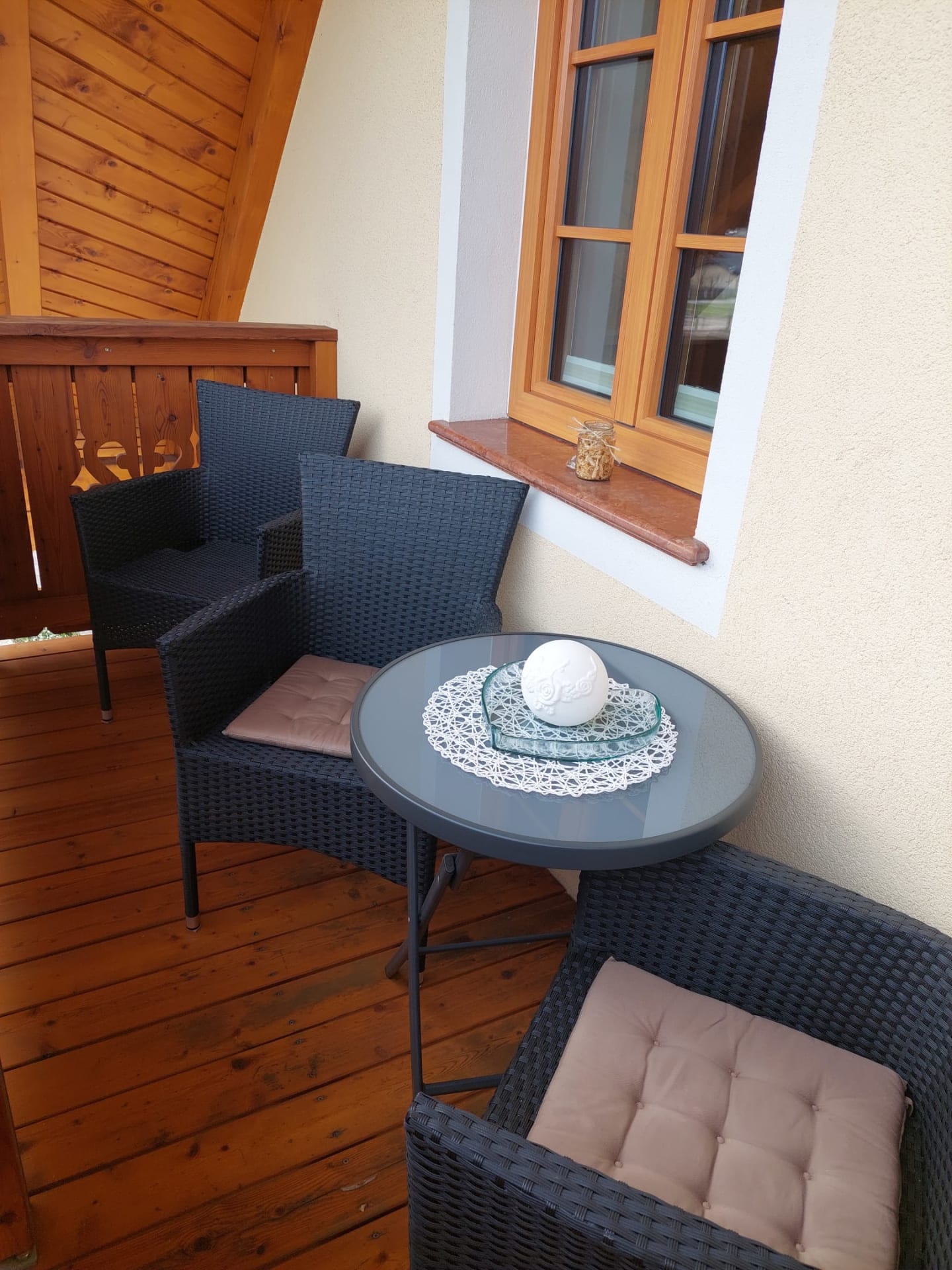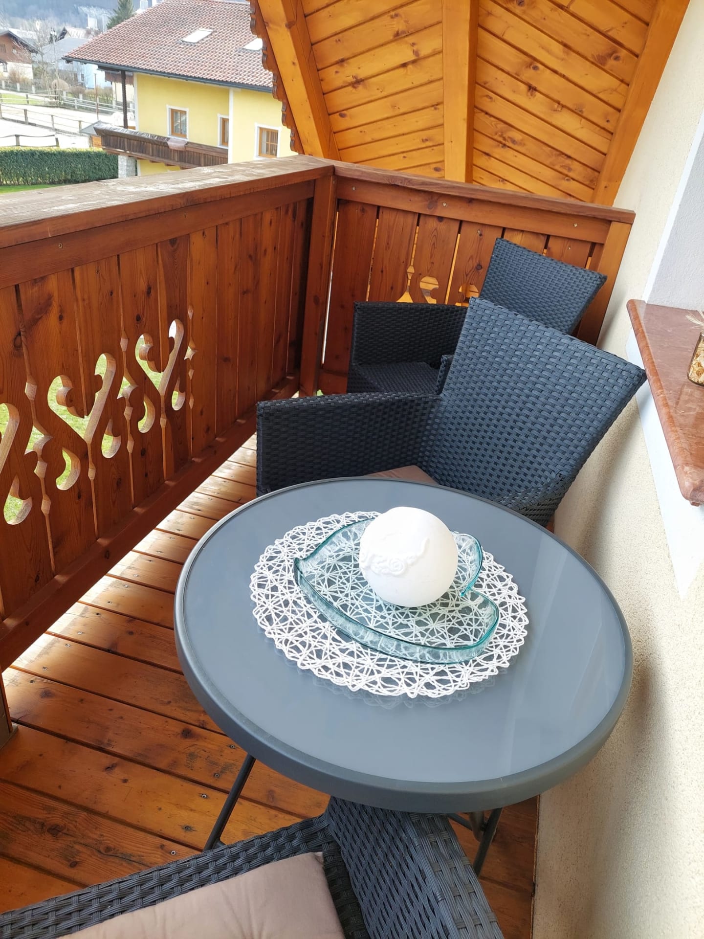 Am großem Balkon mit Sitzgelegenheit genießen Sie einen wunderbaren Ausblick auf die umliegende Bergwelt.