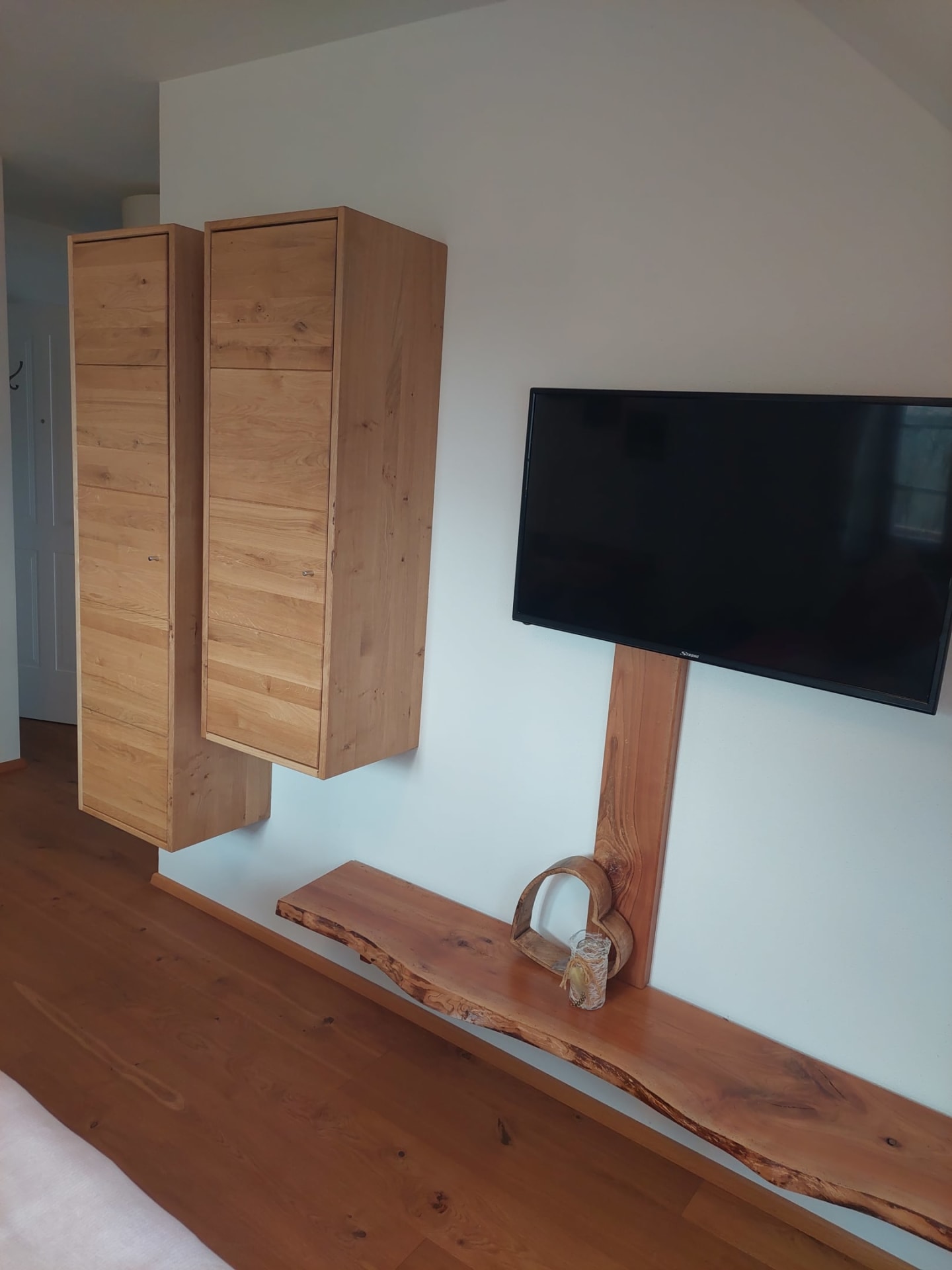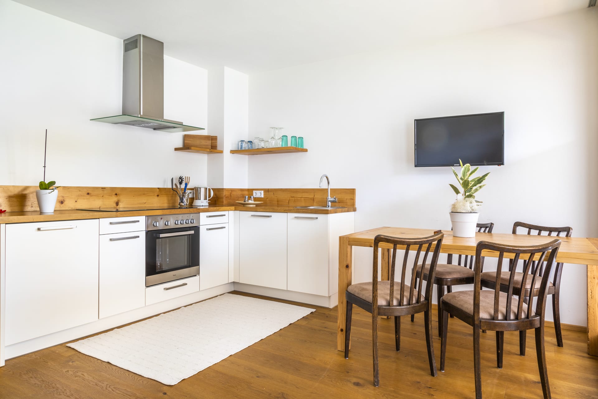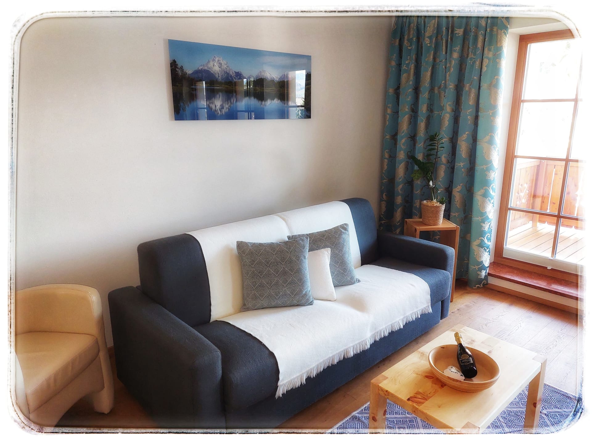 Die individuell eingerichtete Ferienwohnung bietet eine vollausgestattete Küche, einen Wohn-/Essbereich mit bequemer, italienischer Schlafcouch und ein Schlafzimmer mit Zirbenholzmöbeln.
