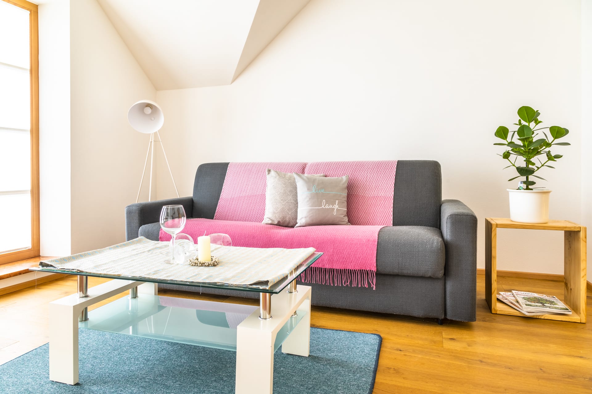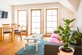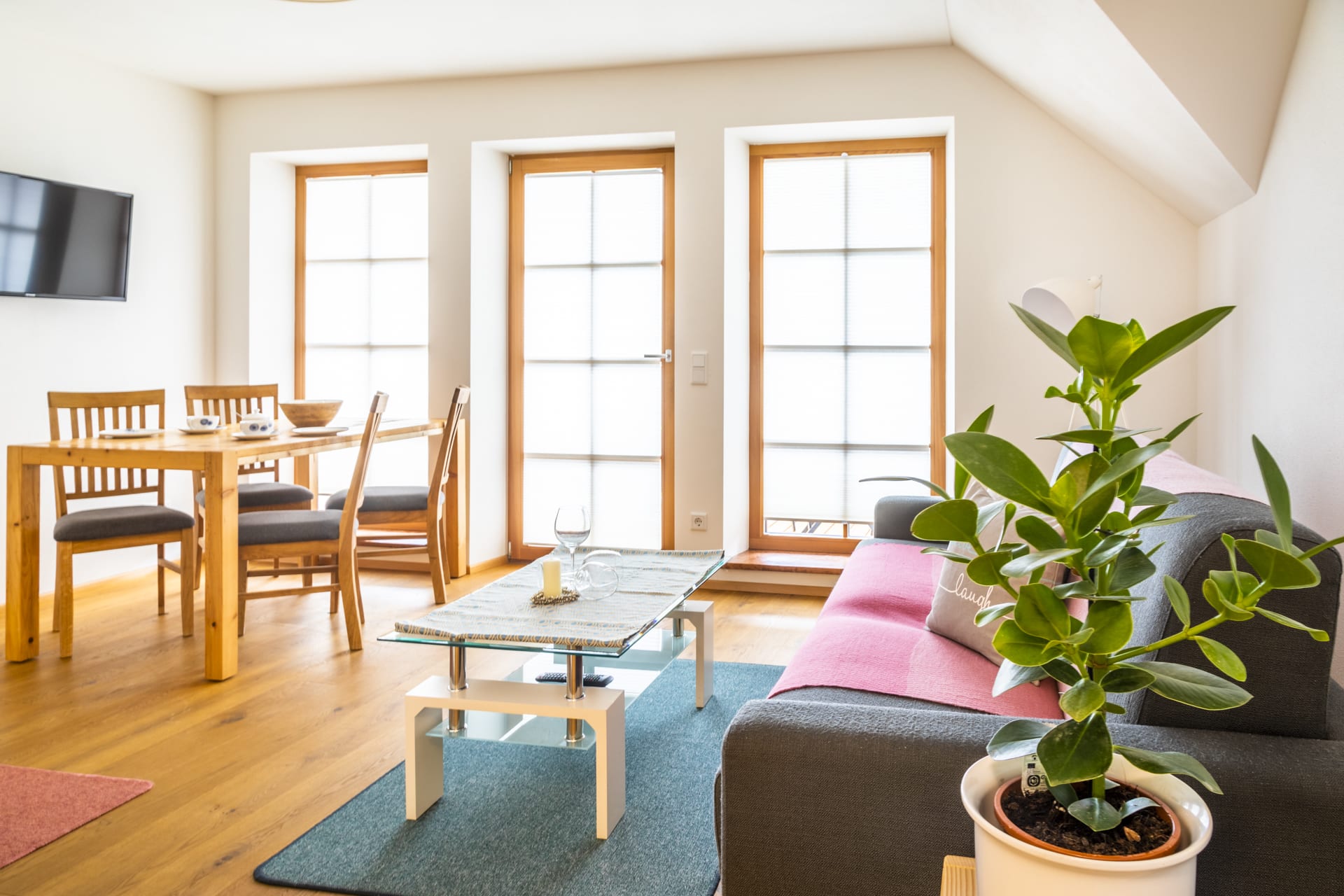 Die liebevoll eingerichteten Wohnungen am Seidenwebergut bieten jeweils ein großes Wohnzimmer und Essbereich, ein Schlafzimmer, Dusche/WC sowie eine voll ausgestattete Küche.