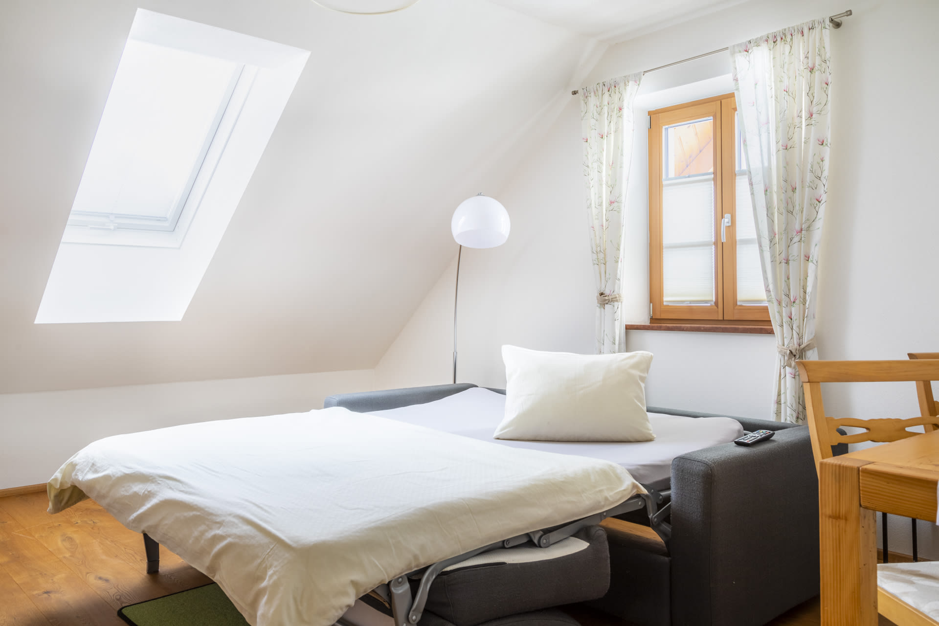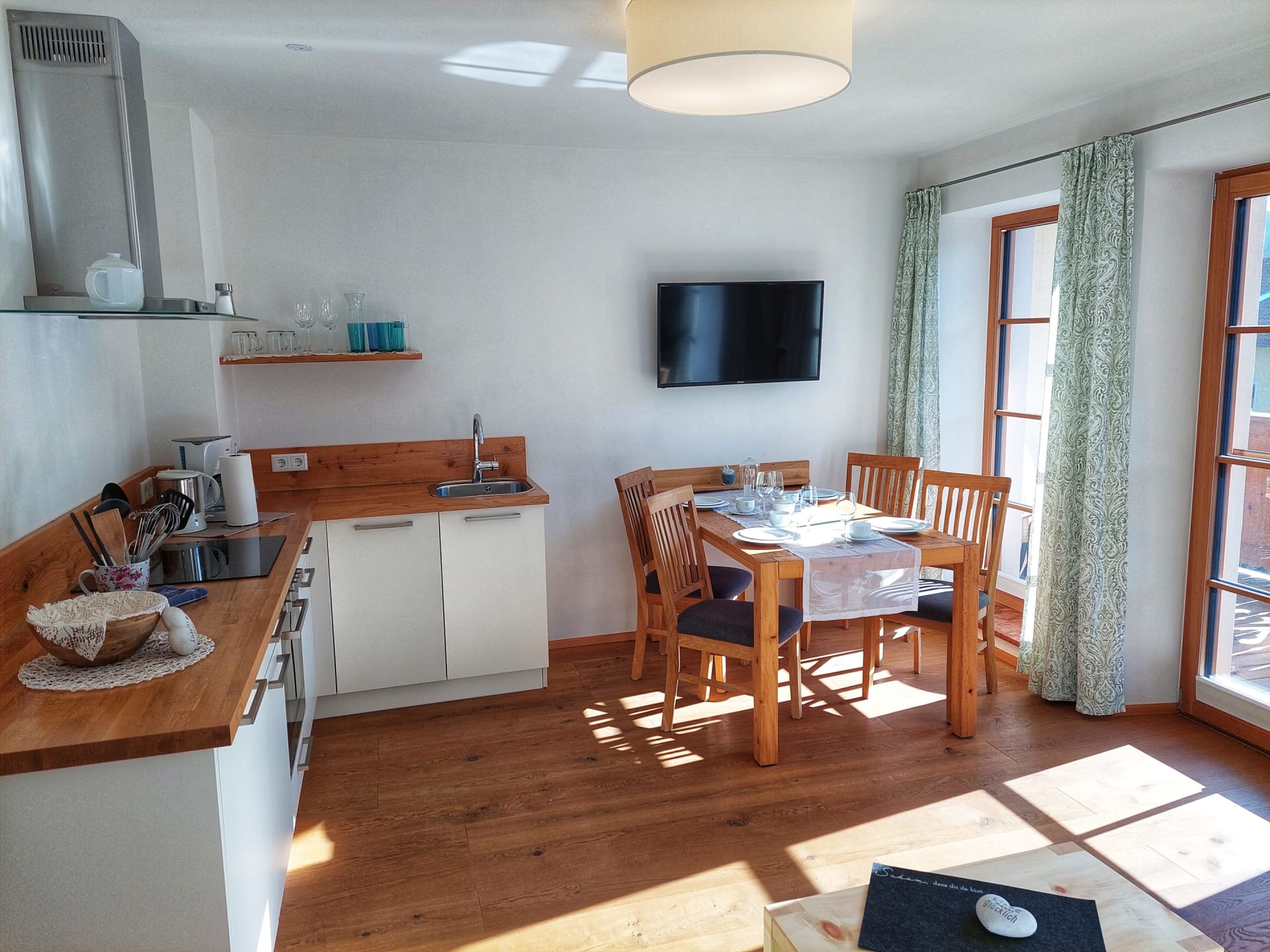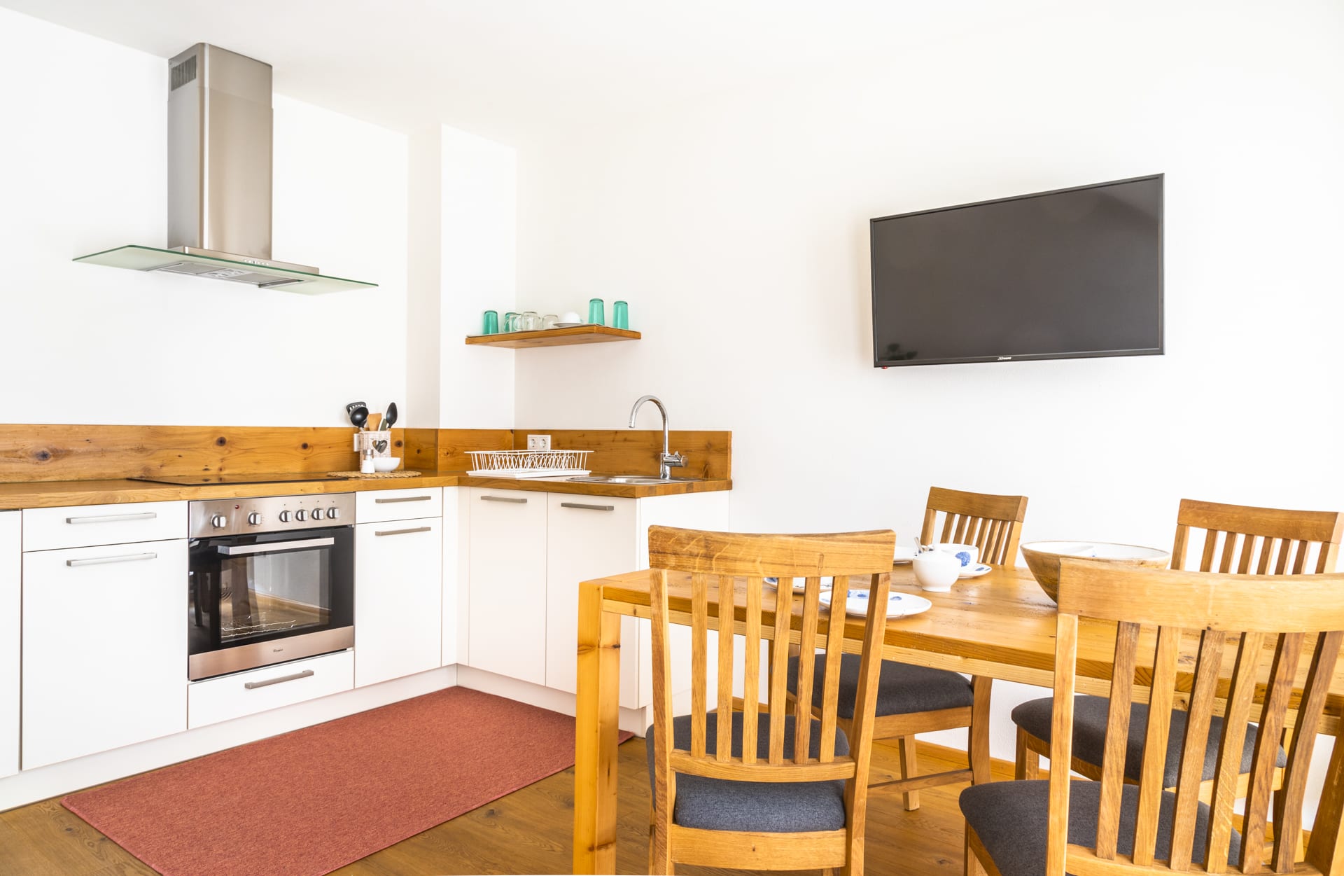 Die individuell eingerichtete Ferienwohnung bietet eine vollausgestattete Küche, einen Wohn-/Essbereich mit bequemer, italienischer Schlafcouch und ein Schlafzimmer mit Zirbenholzmöbeln.