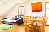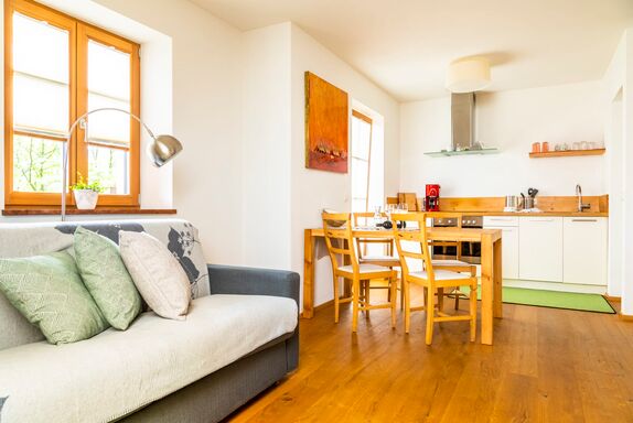 Die liebevoll eingerichteten Wohnungen am Seidenwebergut bieten jeweils ein großes Wohnzimmer und Essbereich, ein Schlafzimmer, Dusche/WC sowie eine voll ausgestattete Küche.