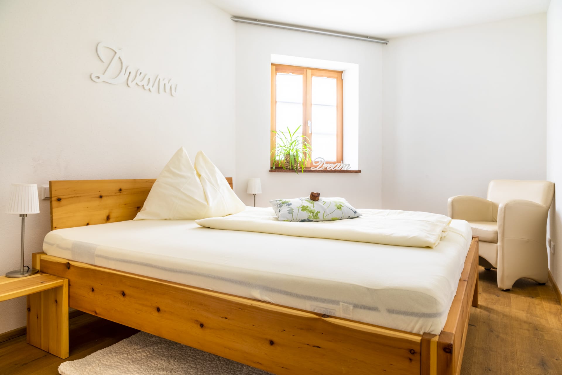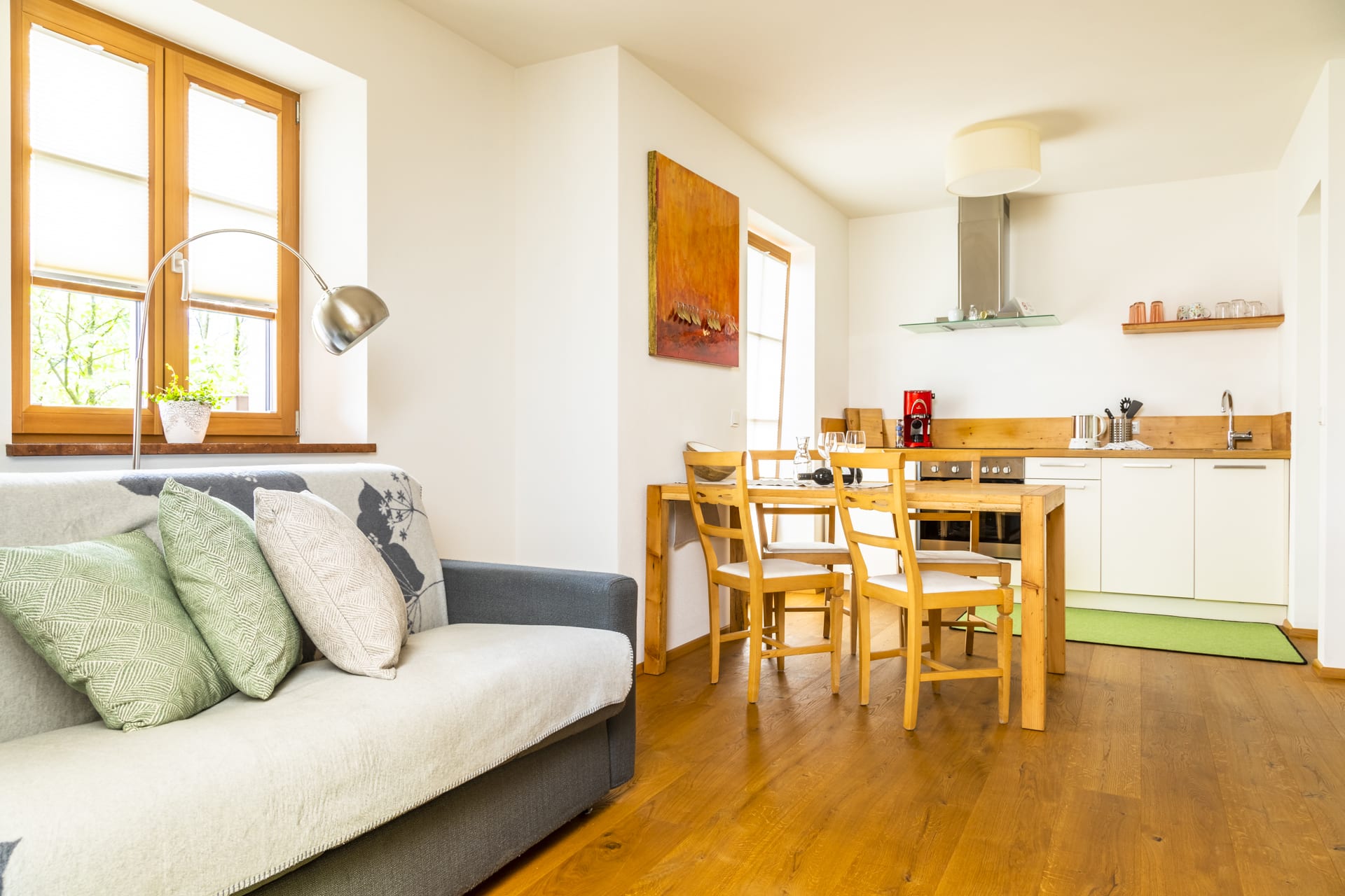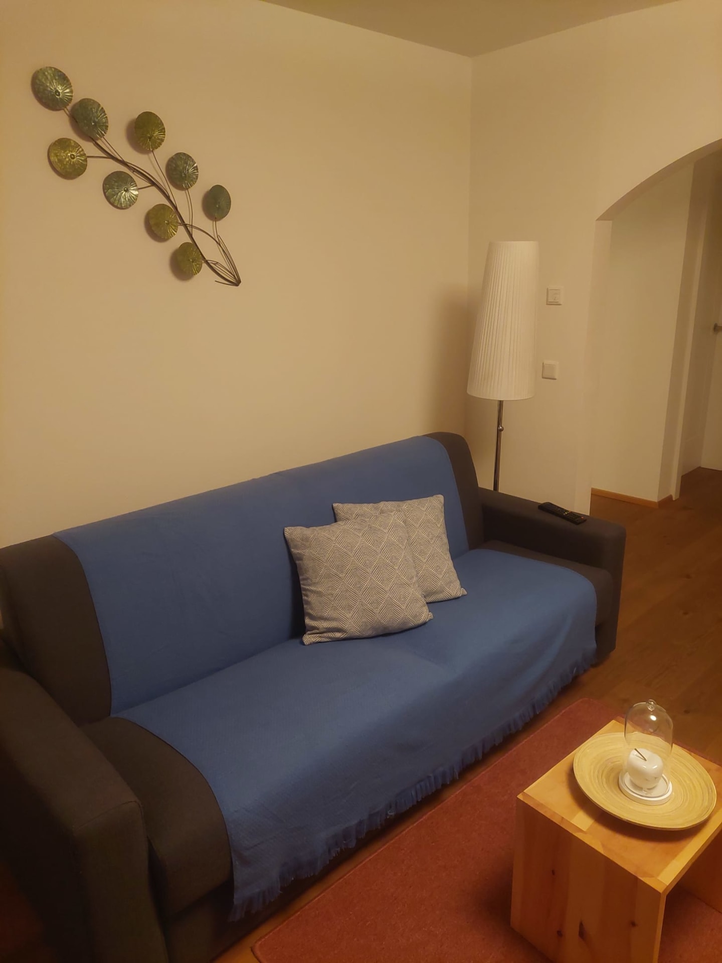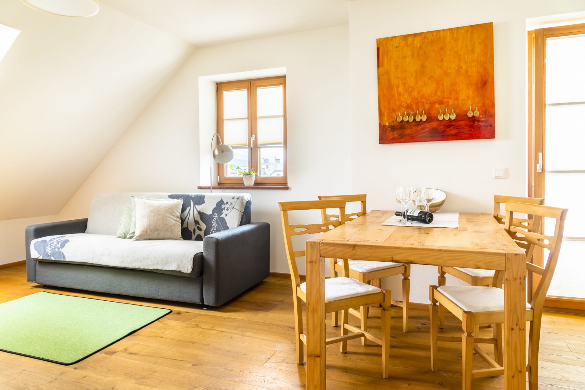 Die individuell eingerichtete Ferienwohnung bietet eine vollausgestattete Küche, einen Wohn-/Essbereich mit bequemer, italienischer Schlafcouch und ein Schlafzimmer mit Zirbenholzmöbeln.