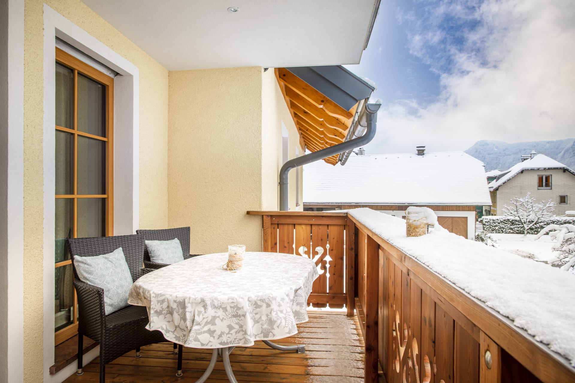 Am großem Balkon mit Sitzgelegenheit genießen Sie einen wunderbaren Ausblick auf die umliegende Bergwelt.