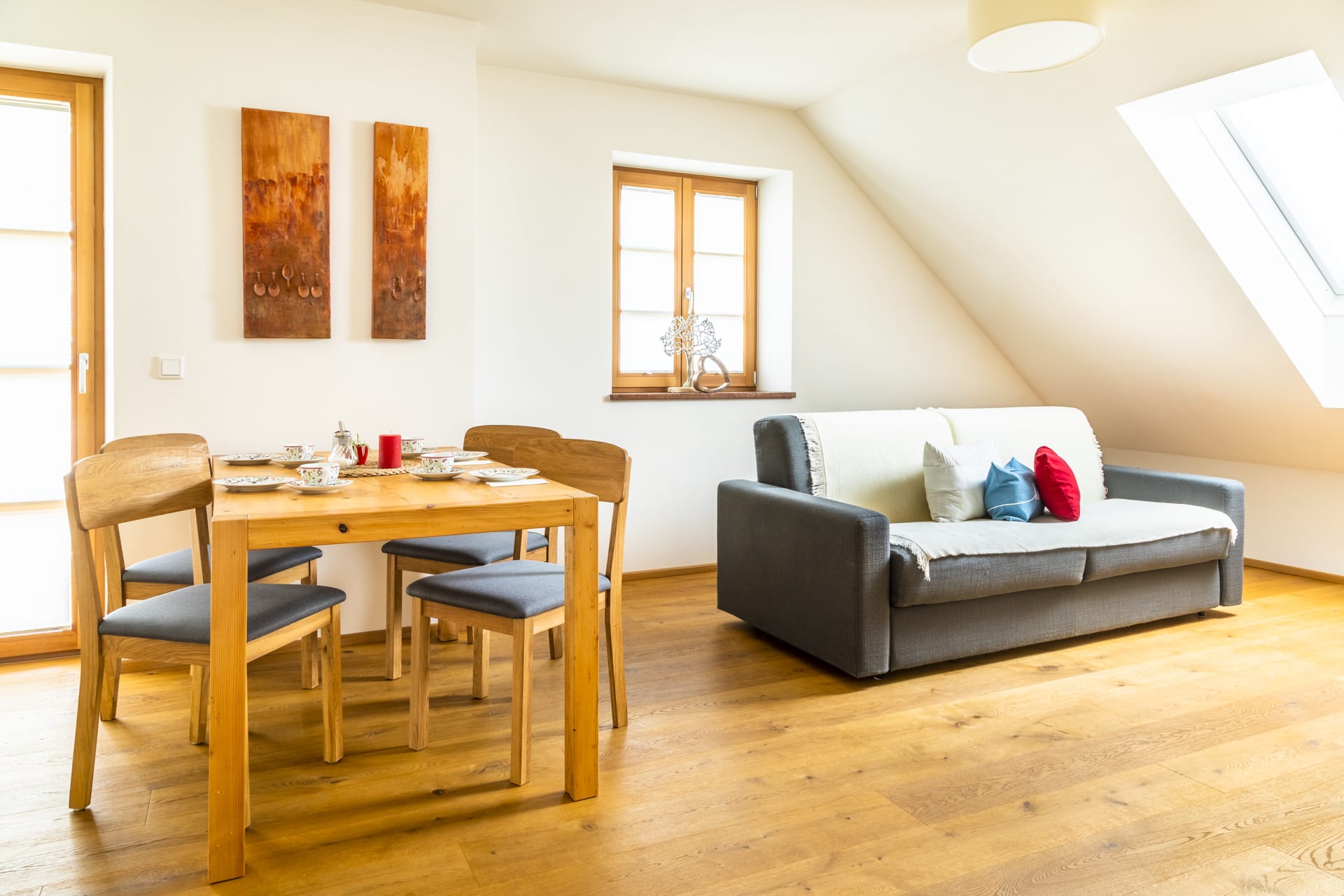 Die liebevoll eingerichteten Wohnungen am Seidenwebergut bieten jeweils ein großes Wohnzimmer und Essbereich, ein Schlafzimmer, Dusche/WC sowie eine voll ausgestattete Küche.