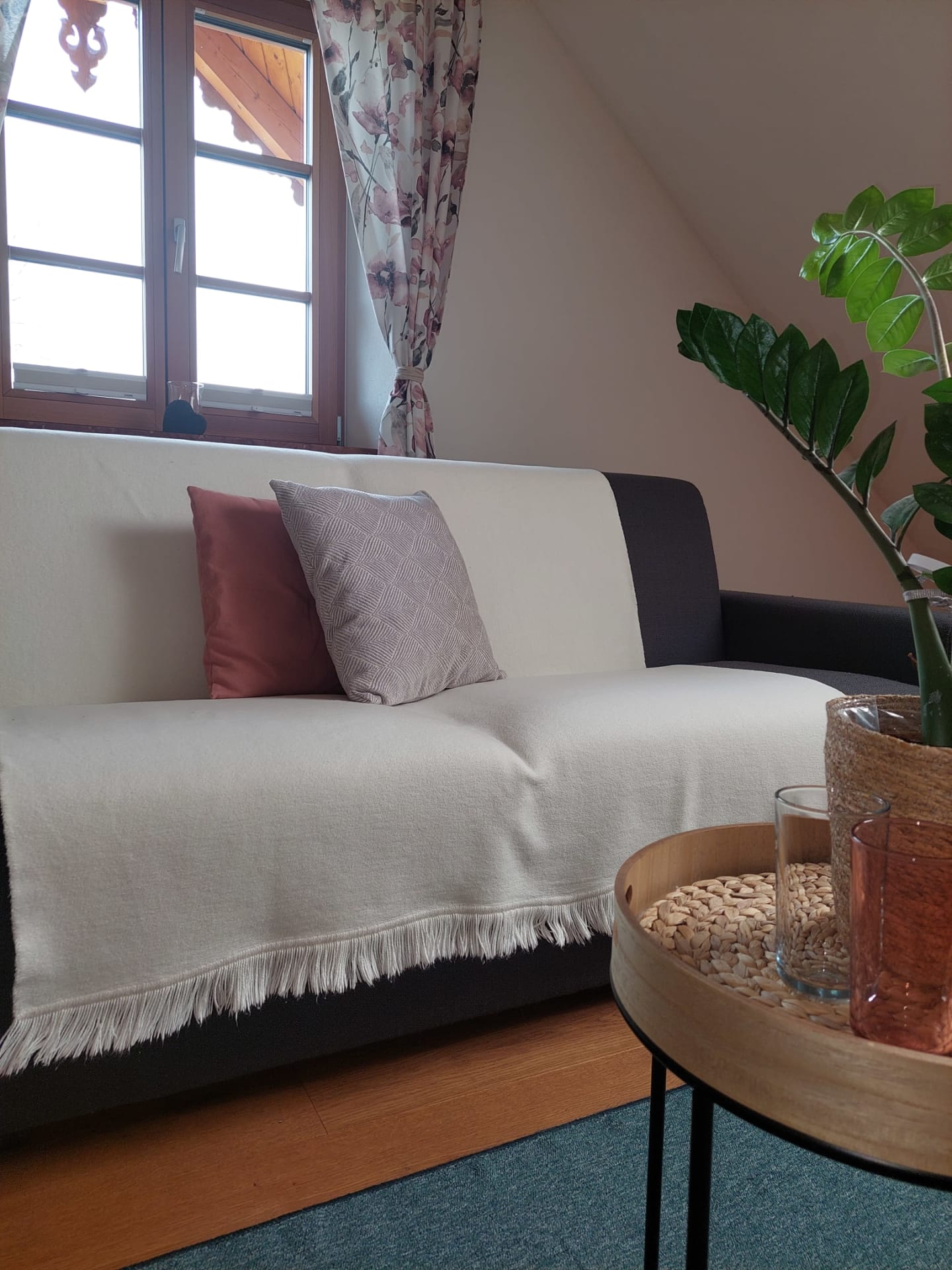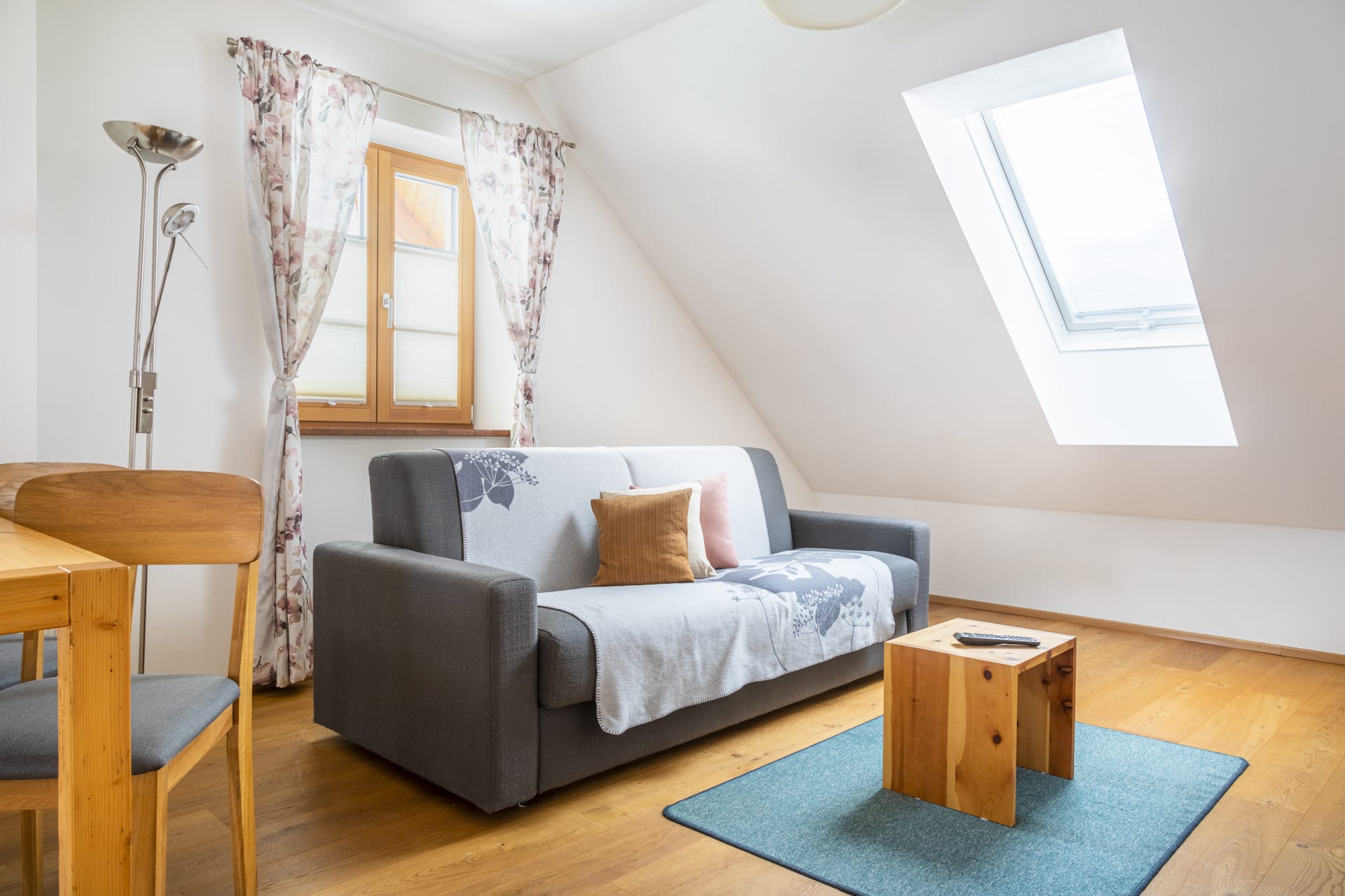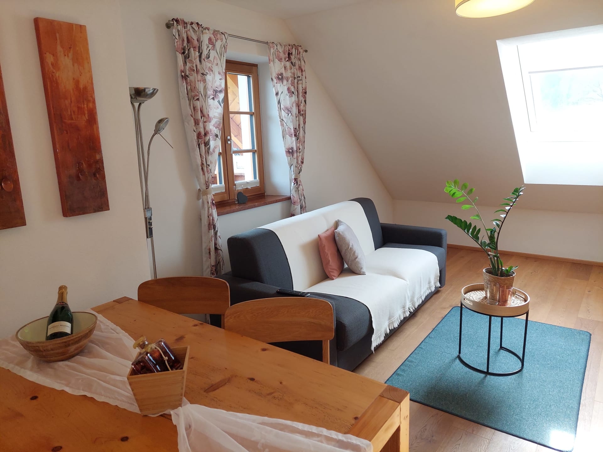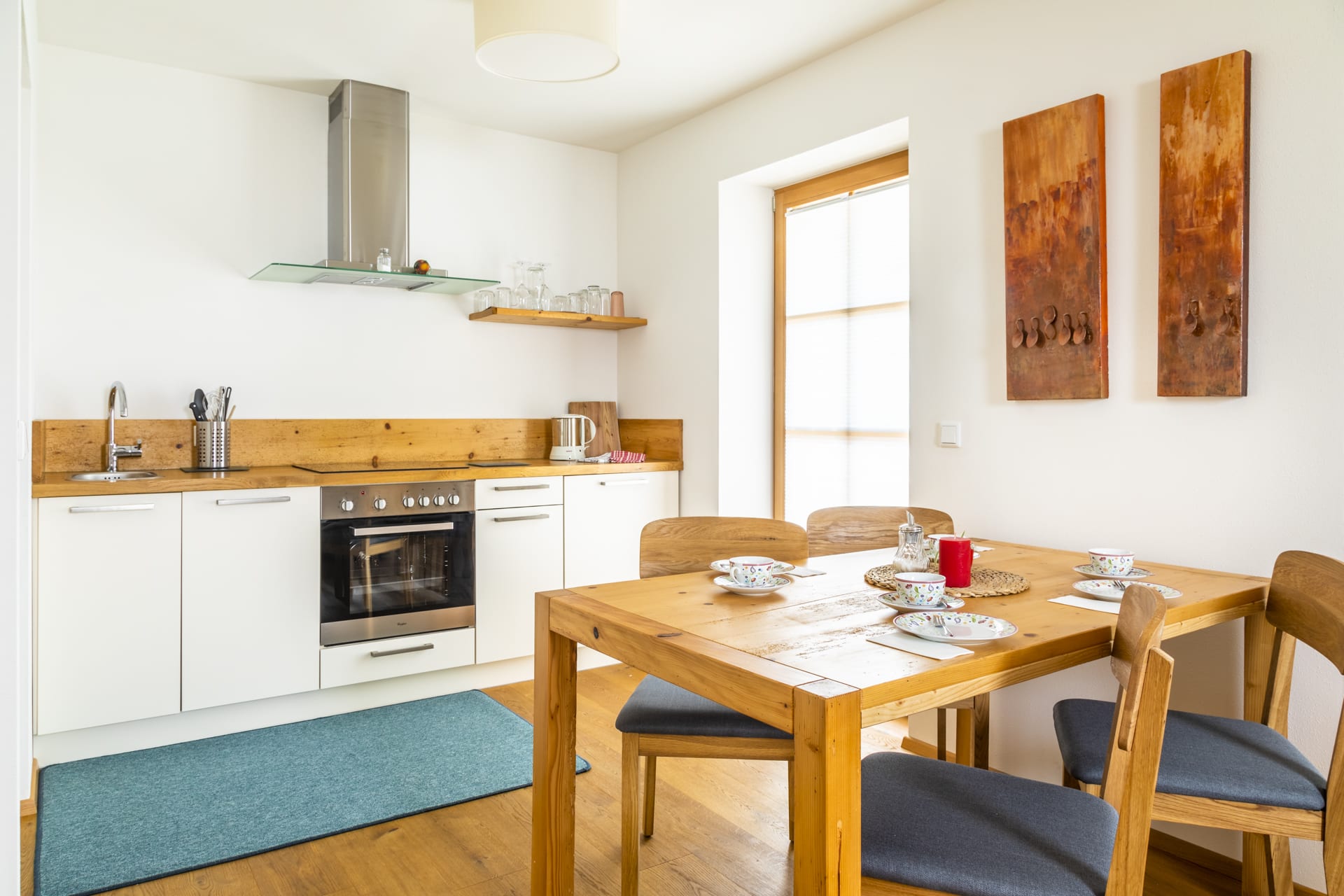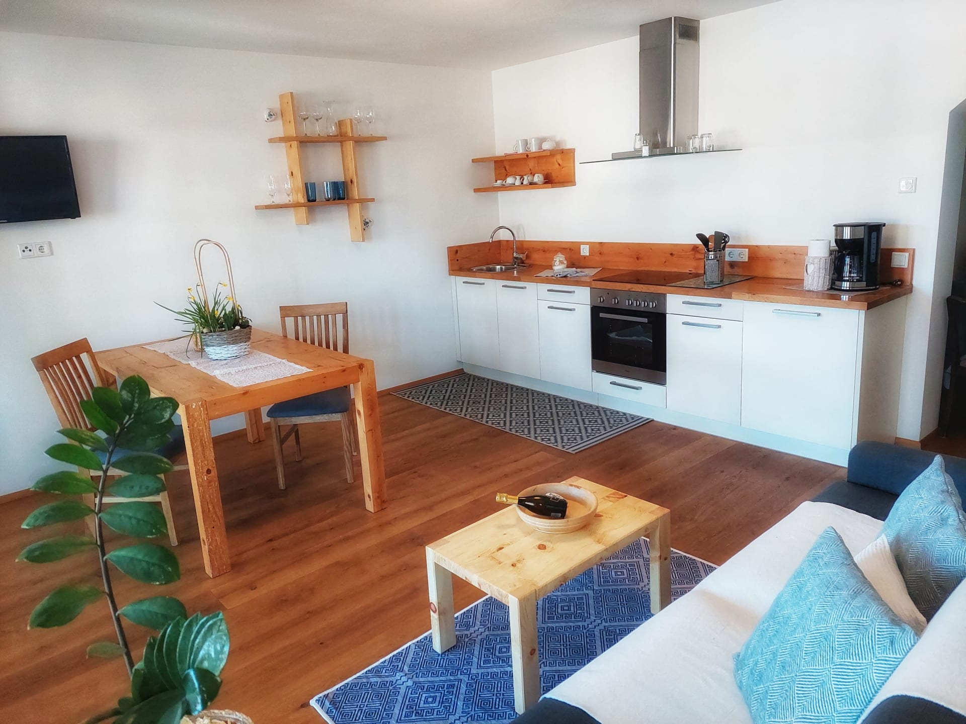 Die individuell eingerichtete Ferienwohnung bietet eine vollausgestattete Küche, einen Wohn-/Essbereich mit bequemer, italienischer Schlafcouch und ein Schlafzimmer mit Zirbenholzmöbeln.