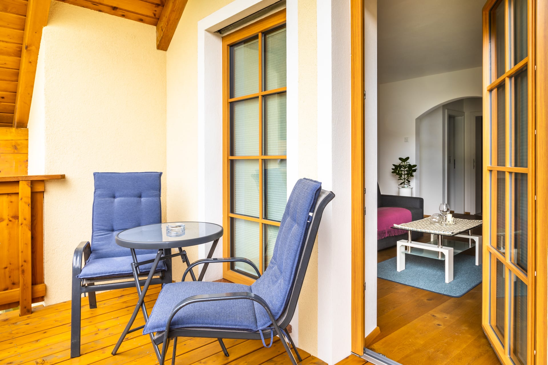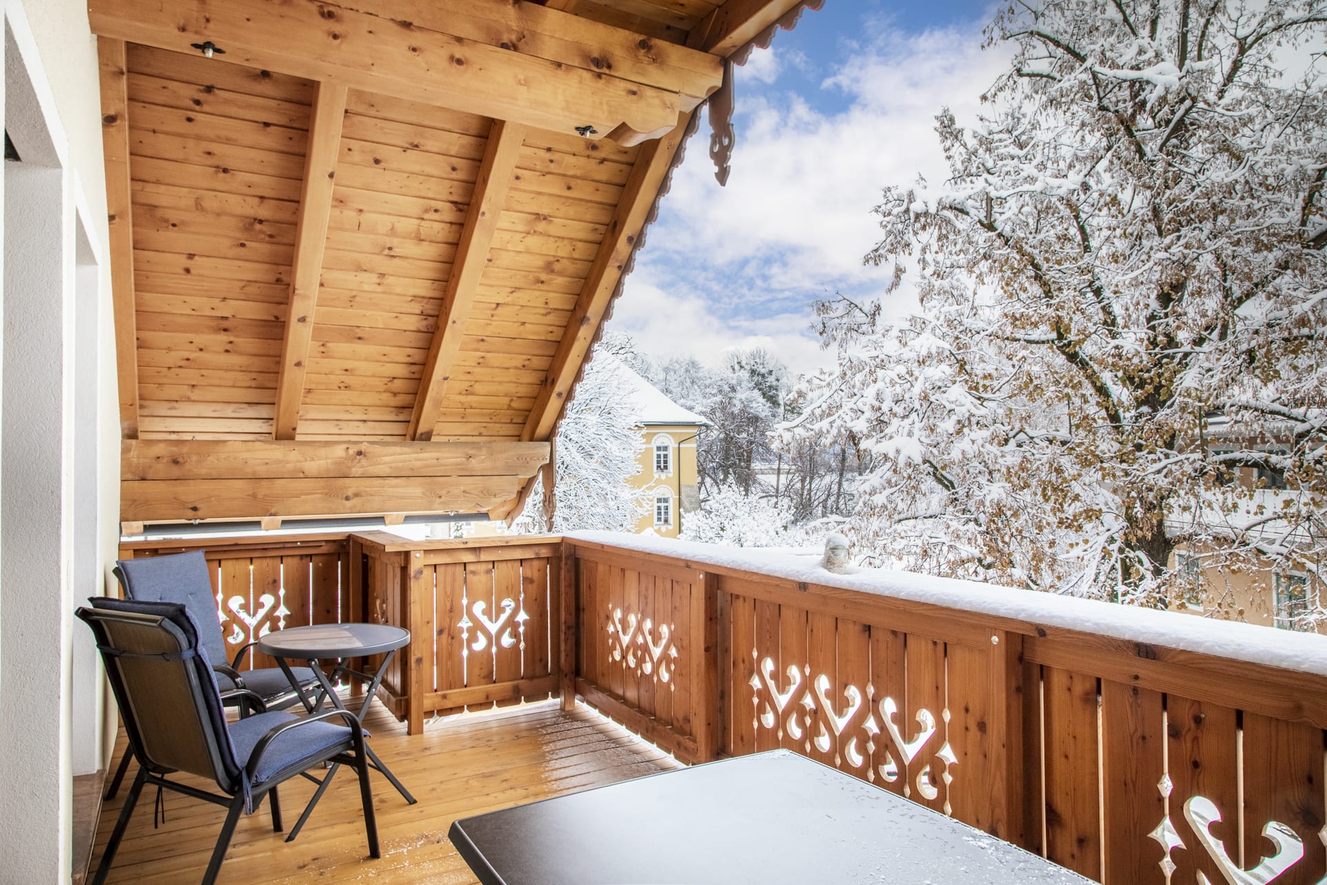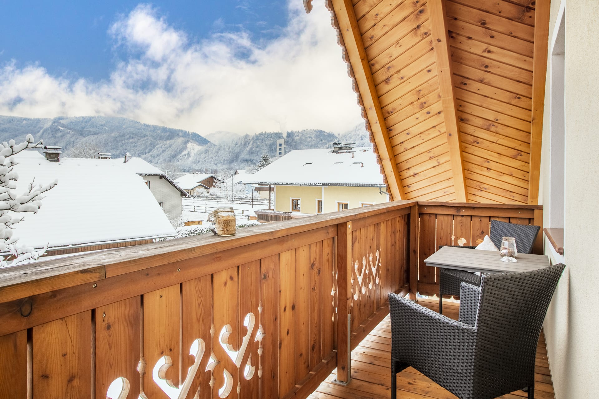 Am großem Balkon mit Sitzgelegenheit genießen Sie einen wunderbaren Ausblick auf die umliegende Bergwelt.