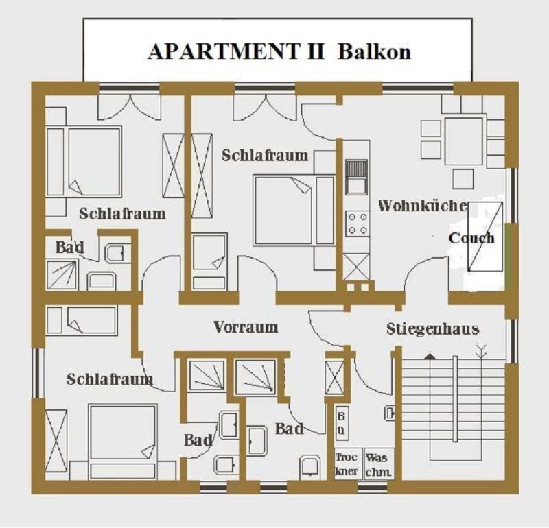 3 Schlafzimmer alle mit Dusche/WC, Vorraum, Balkon, Gitterbett, Hochstuhl, (Waschmaschine u.Trockner vorhanden - gegen Entgeld), Trockenraum für Schibekleidung.