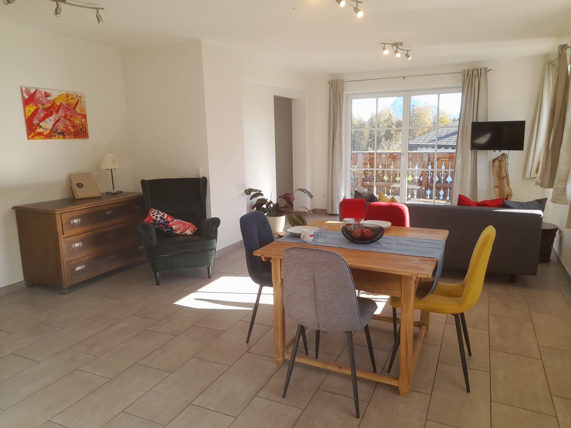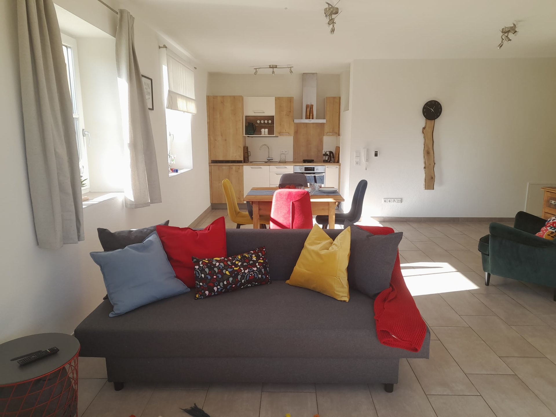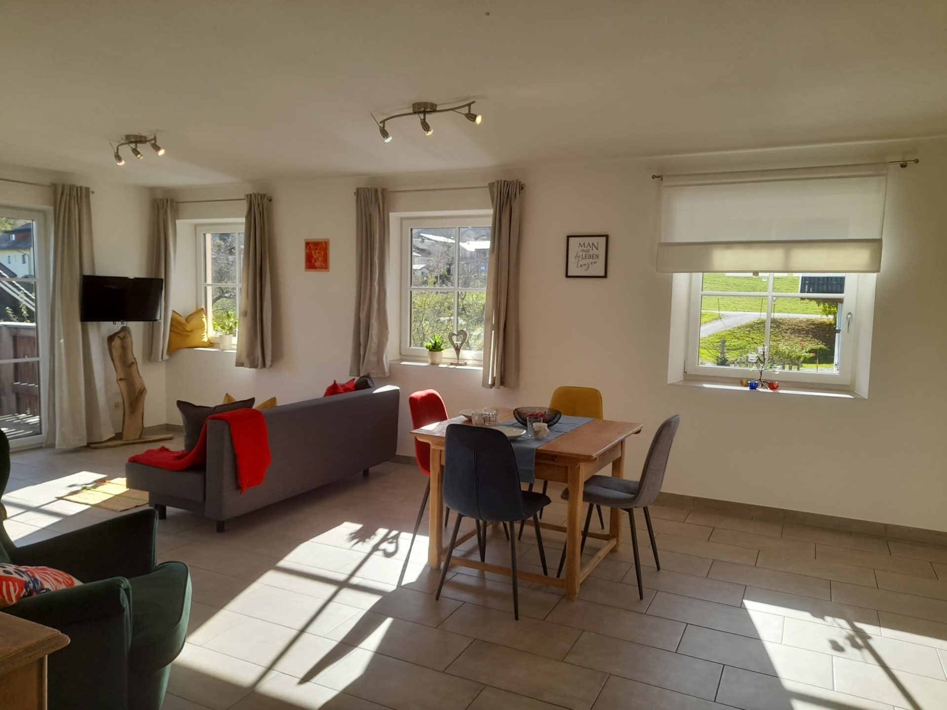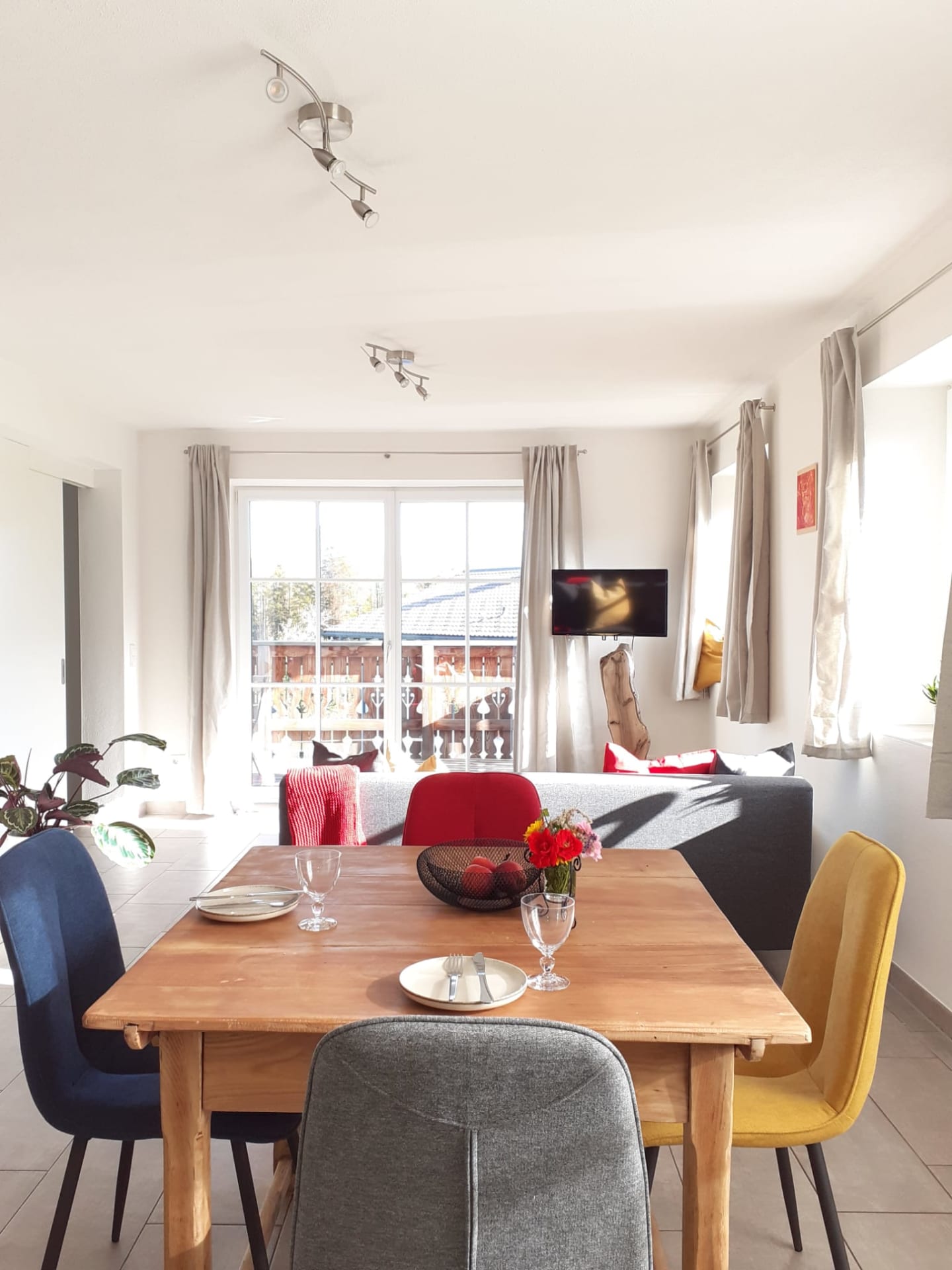 Die Ferienwohnung ist ca. 55 m² groß und bietet Platz für bis zu 3 Personen. Es gibt ein Schlafzimmer mit Doppelbett, eine Kochnische und einen großen Wohnbereich mit Ausziehcouch, sowie ein Badezimmer mit Dusche und WC. Vom Balkon hat man einen schönen Ausblick auf den Garten und die Berge. Die Wohnung befindet sich im 1. Stock des Nebengebäudes. Sat-TV und WLAN vorhanden.
